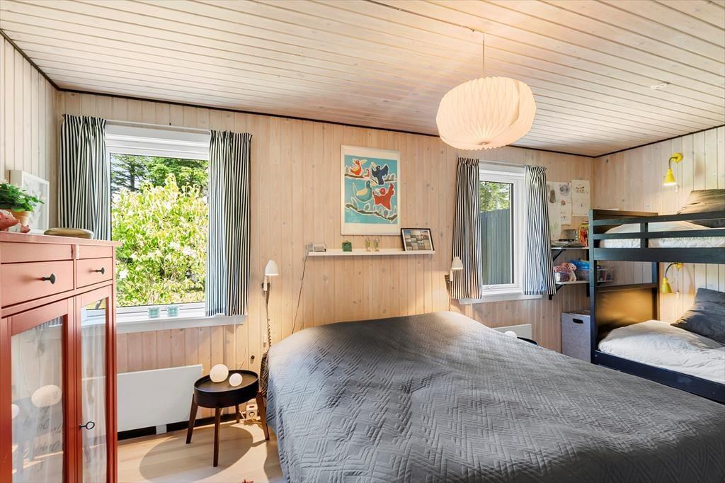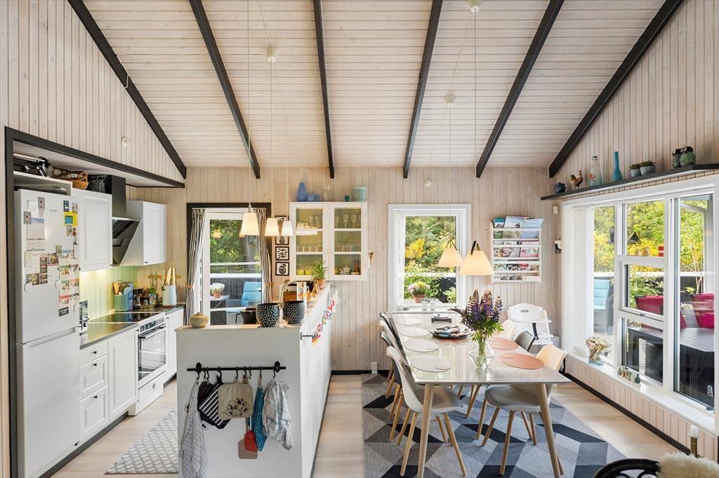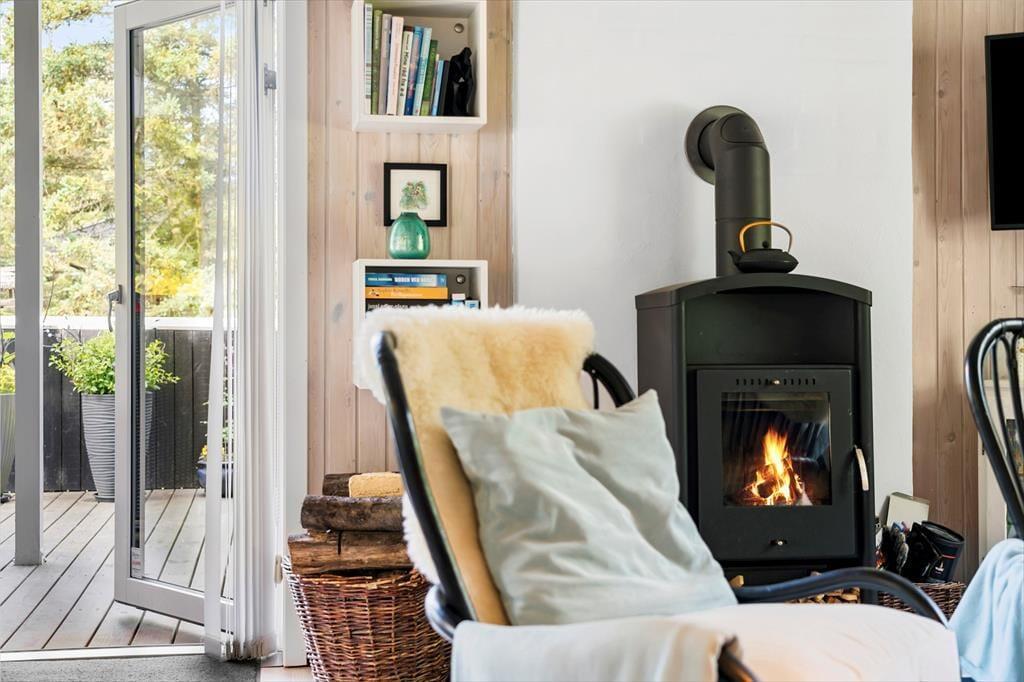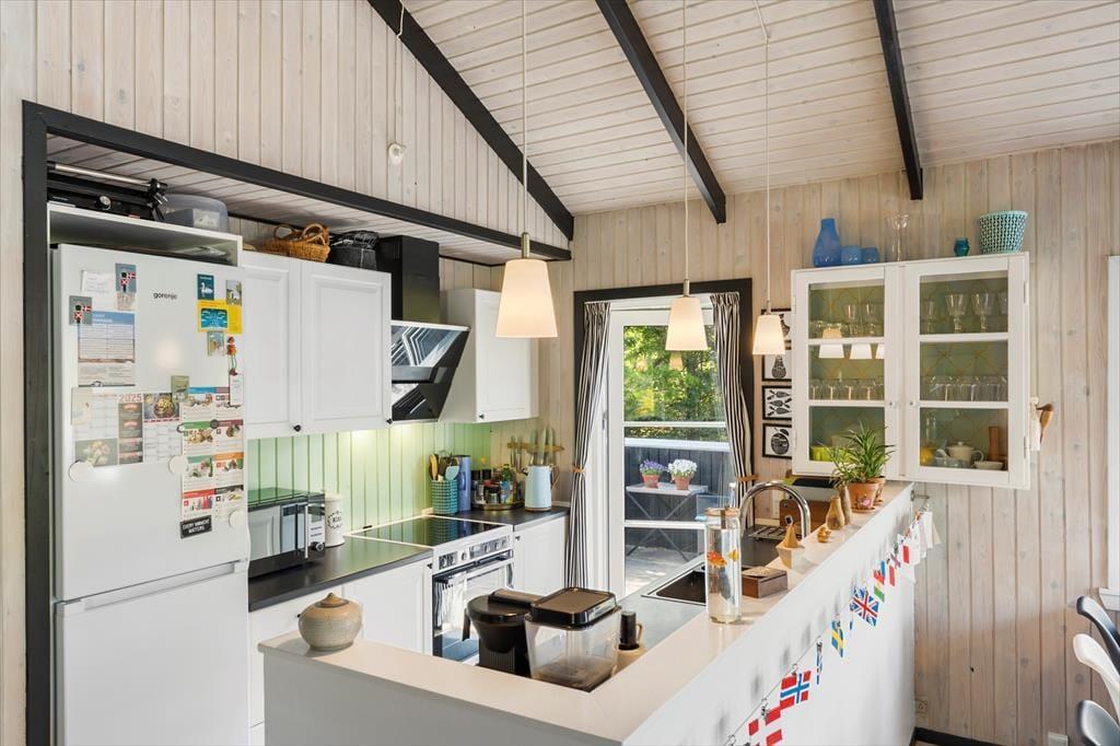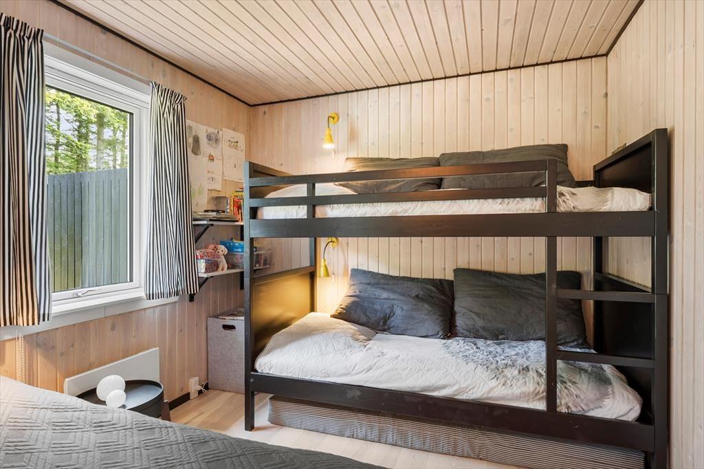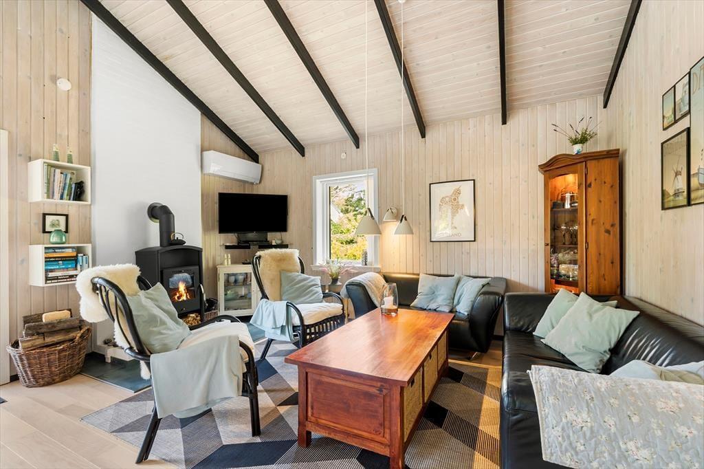 Dieses Urlaubsdomizil ist mit seiner schwarz gestrichenen Fassade und den weißen Fensterrahmen der Inbegriff von klassischem Ferienhauscharme. Aufgrund der klassischen Farbgebung bildet das Haus einen ausgesprochen schönen Kontrast zum Grün des Grundstücks. Im Hausinneren werden Sie von einer hellen und freundlichen Wohnatmosphäre in Empfang genommen. Das Herzstück dieses Hauses bildet eindeutig der große Aufenthaltsraum. Dieser wird durch hohe Decken, eine offene Balkenlage und große Fensterpartien geprägt, die dem Raum einen wunderschönen Tageslichteinfall verleihen. In der Sofagruppe können Sie es sich nach Herzenslust gemütlich machen. An kühlen Abenden sorgt der romantisch knisternde Kaminofen nicht nur für heimelige Wärme, sondern auch für ein Maximum an echter Ferienhausstimmung. Am großen Esstisch können Sie in vergnügter Runde spielen, puzzeln und gemeinsam die Mahlzeiten genießen. Das Haus umfasst zwei Schlafräume - einen großen Schlafraum mit einem Doppelbett und Etagenbetten und einen weiteren Schlafraum, der ebenfalls mit einem Doppelbett eingerichtet ist. Ein Badezimmer steht selbstverständlich auch zu Ihrer Verfügung. Deswegen empfehlen wir max. 4 Erwachsene und 2 Kindern im Haus.