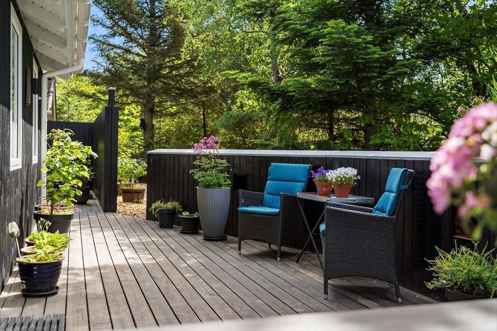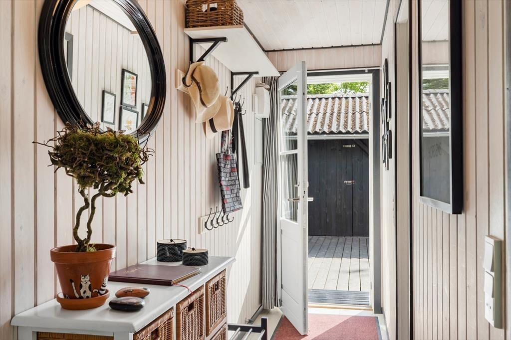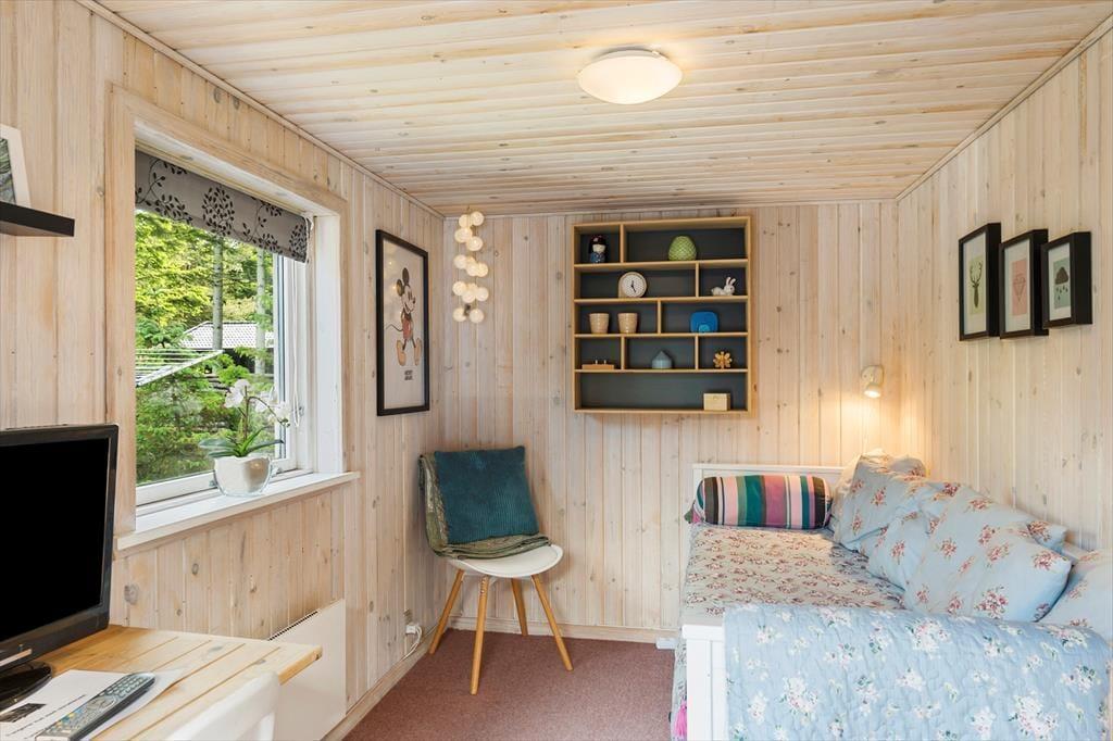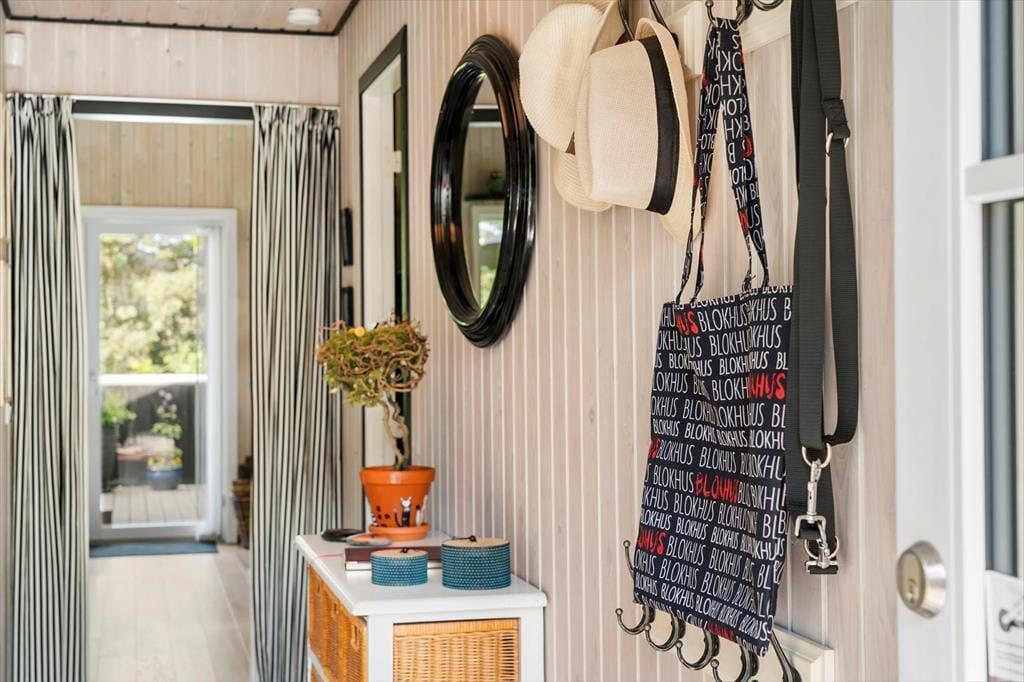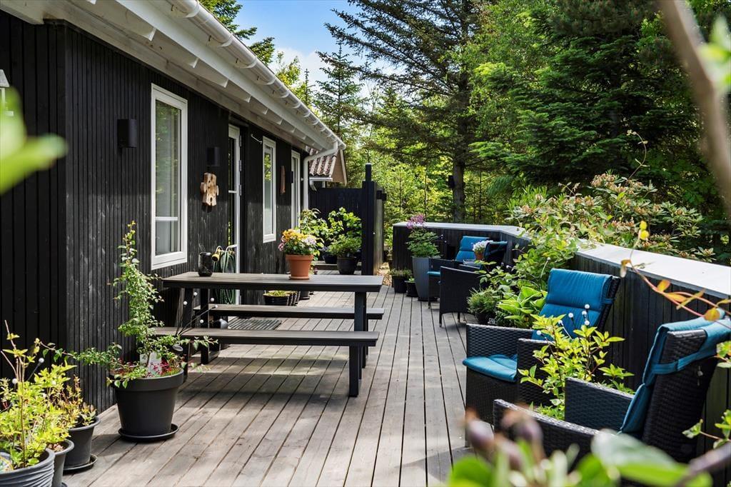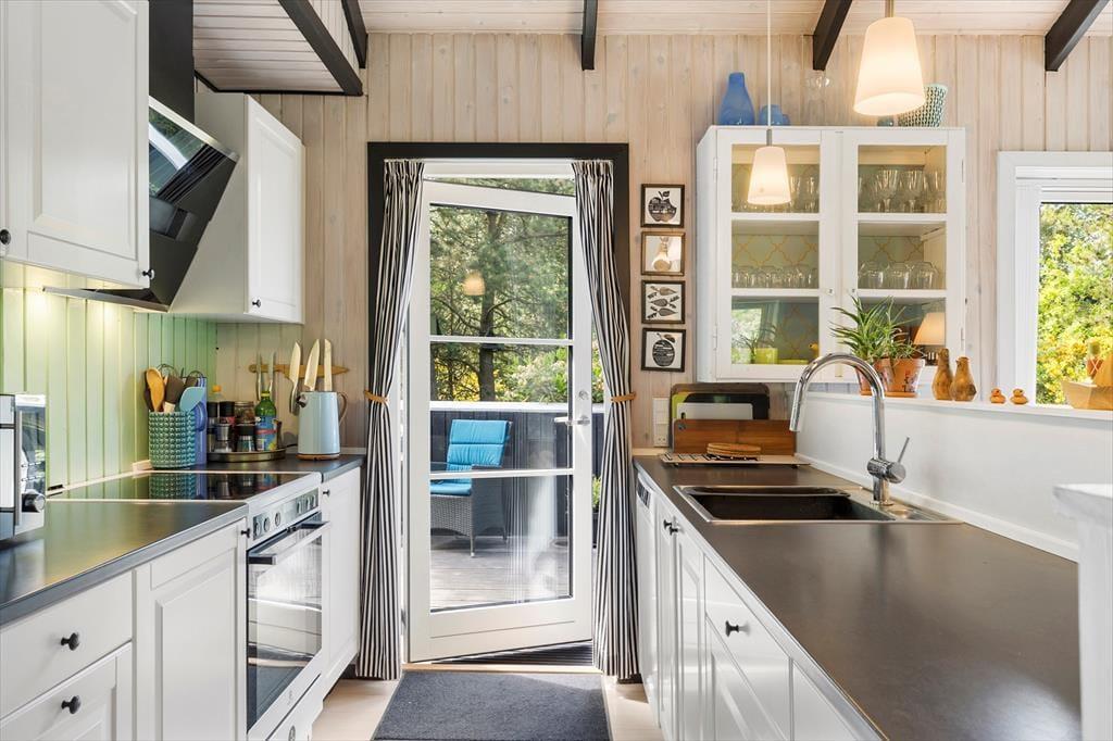 Dieses Urlaubsdomizil ist mit seiner schwarz gestrichenen Fassade und den weißen Fensterrahmen der Inbegriff von klassischem Ferienhauscharme. Aufgrund der klassischen Farbgebung bildet das Haus einen ausgesprochen schönen Kontrast zum Grün des Grundstücks. Im Hausinneren werden Sie von einer hellen und freundlichen Wohnatmosphäre in Empfang genommen. Das Herzstück dieses Hauses bildet eindeutig der große Aufenthaltsraum. Dieser wird durch hohe Decken, eine offene Balkenlage und große Fensterpartien geprägt, die dem Raum einen wunderschönen Tageslichteinfall verleihen. In der Sofagruppe können Sie es sich nach Herzenslust gemütlich machen. An kühlen Abenden sorgt der romantisch knisternde Kaminofen nicht nur für heimelige Wärme, sondern auch für ein Maximum an echter Ferienhausstimmung. Am großen Esstisch können Sie in vergnügter Runde spielen, puzzeln und gemeinsam die Mahlzeiten genießen. Das Haus umfasst zwei Schlafräume - einen großen Schlafraum mit einem Doppelbett und Etagenbetten und einen weiteren Schlafraum, der ebenfalls mit einem Doppelbett eingerichtet ist. Ein Badezimmer steht selbstverständlich auch zu Ihrer Verfügung. Deswegen empfehlen wir max. 4 Erwachsene und 2 Kindern im Haus.