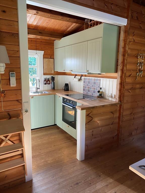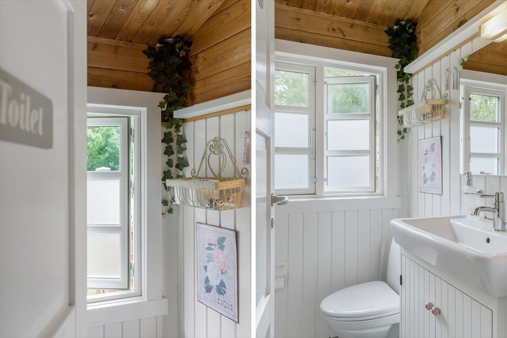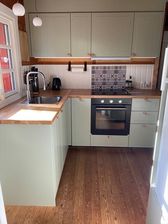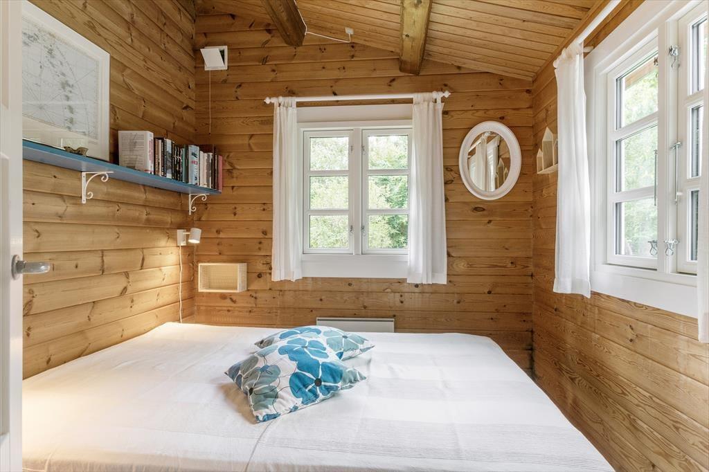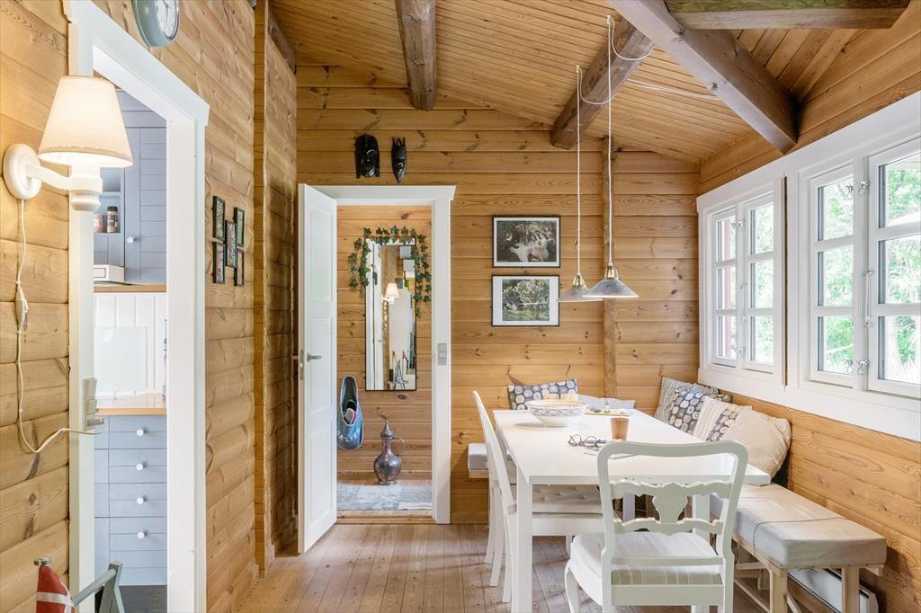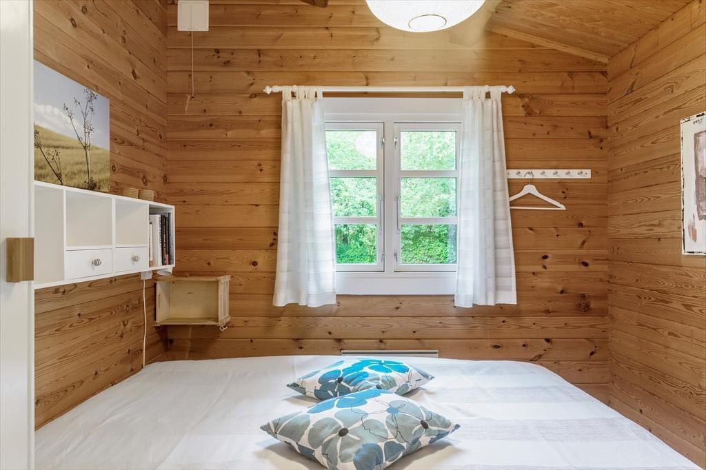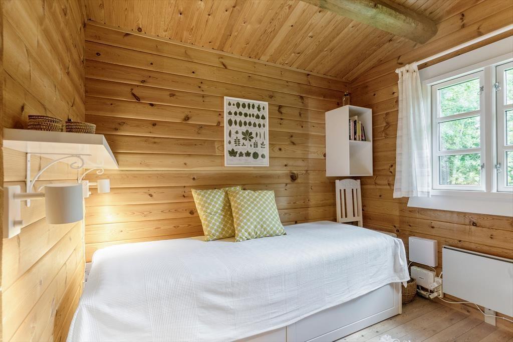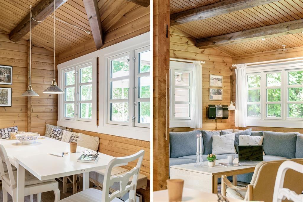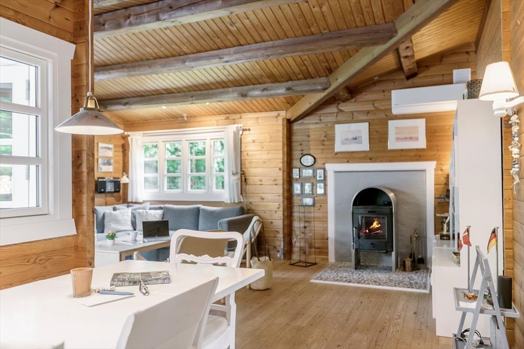 Mit seiner roten Fassade und den weißen Fenstern fügt sich das Ferienhaus perfekt in die naturbelassene Umgebung ein. Im Innenbereich verleihen die rustikalen Holzwände und die Balkenkonstruktionen der Decken den Räumen ihren besonderen Charakter, während die Einrichtung in hellen Farbtönen zur äußerst gemütlichen Atmosphäre beiträgt. Zum Beispiel ist der große Eckraum ein großartiger Ort, um Kartenspiele am Esstisch zu spielen, auf dem Sofa zu lesen und gute Gespräche in der Nähe des Kaminofens zu führen. Sie können auch in der angrenzenden Küche kochen und wenn es Zeit zum Schlafengehen ist, können Sie sich im Badezimmer die Zähne putzen, bevor Sie sich in den drei Schlafzimmern entspannen.