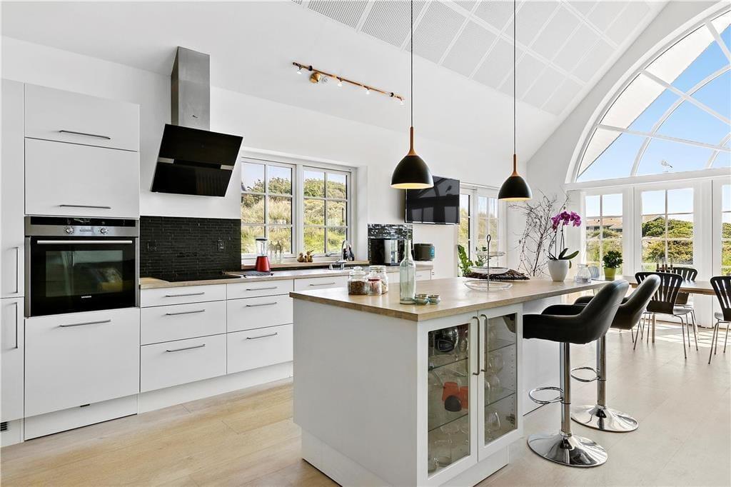 Egal wie man es dreht und wendet, hier handelt es sich um ein außerordentlich luxuriöses Gebäude. Das Haus aus dem Jahr 2015 wurde aus qualitativ hochwertigen Materialien errichtet und besticht mit seiner eleganten Einrichtung. Aufgrund der wohldurchdachten Aufteilung der Wohnfläche beherbergt dieses prachtvolle Ferienhaus ohne weiteres zehn übernachtende Urlaubsgäste. Insgesamt fünf Schlafräume mit jeweils einem komfortablen Doppelbett sind im Haus verteilt. Hinzu gesellen sich zwei tolle Badezimmer, ein praktischer Hauswirtschaftsbereich und der bereits erwähnte, herrliche Weinkeller. Der allerschönste Raum ist jedoch der große, helle Wohnbereich mit hohen Decken, der die Küche und das Wohnzimmer harmonisch in sich vereint. Mittig im Raum befindet sich ein Kamin und eine Treppe führt Sie hinauf in einen wunderbar erhöhten Wohnbereich, der mit seiner geschmackvollen Gestaltung und der ansprechenden Sofaecke zu gemütlichen und entspannten Stunden einlädt. Die großen Fensterpartien lassen aus mehren Himmelsrichtungen das Tageslicht durch die Räume strömen. Dies gilt insbesondere für die riesige, nach Süden gerichtete und architektonisch ausgefallene Fensterfront im Wohnbereich, die Ihnen darüber hinaus einen atemberaubenden Ausblick in die reizvolle, hügelige Dünenlandschaft gewährt.