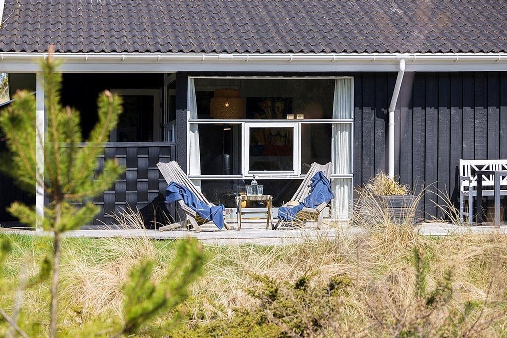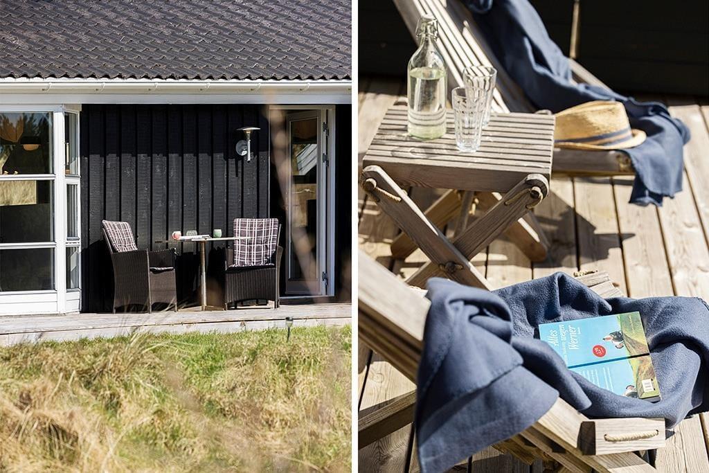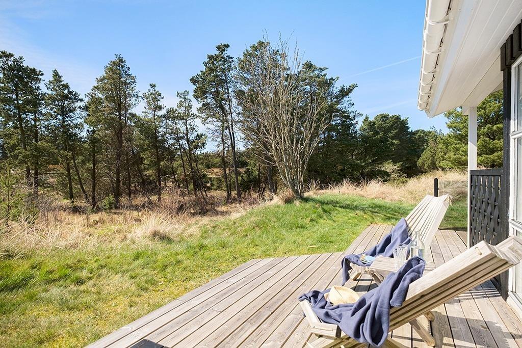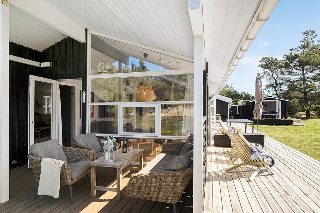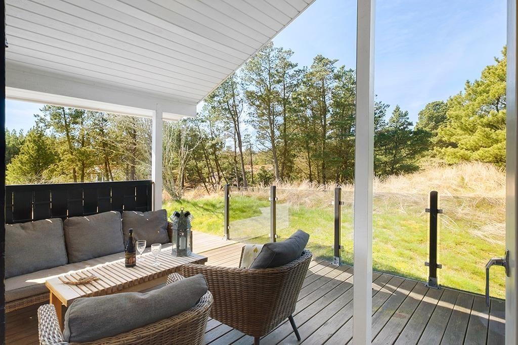 Es gibt drei Terrassen um den Großteil des Hauses. Der Teil am Wohnzimmer ist zudem überdacht und abgeschirmt. Hier sitzt es sich ideal am Abend, wenn es dämmert. Die wunderbare Natur mit hohen Bäumen und hügeligen Dünen ist fantastisch, denn hier lässt es sich bestens abschalten.