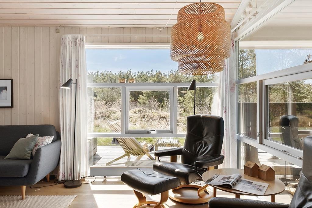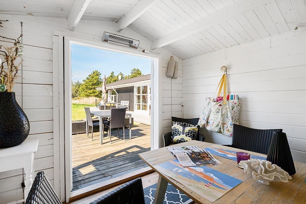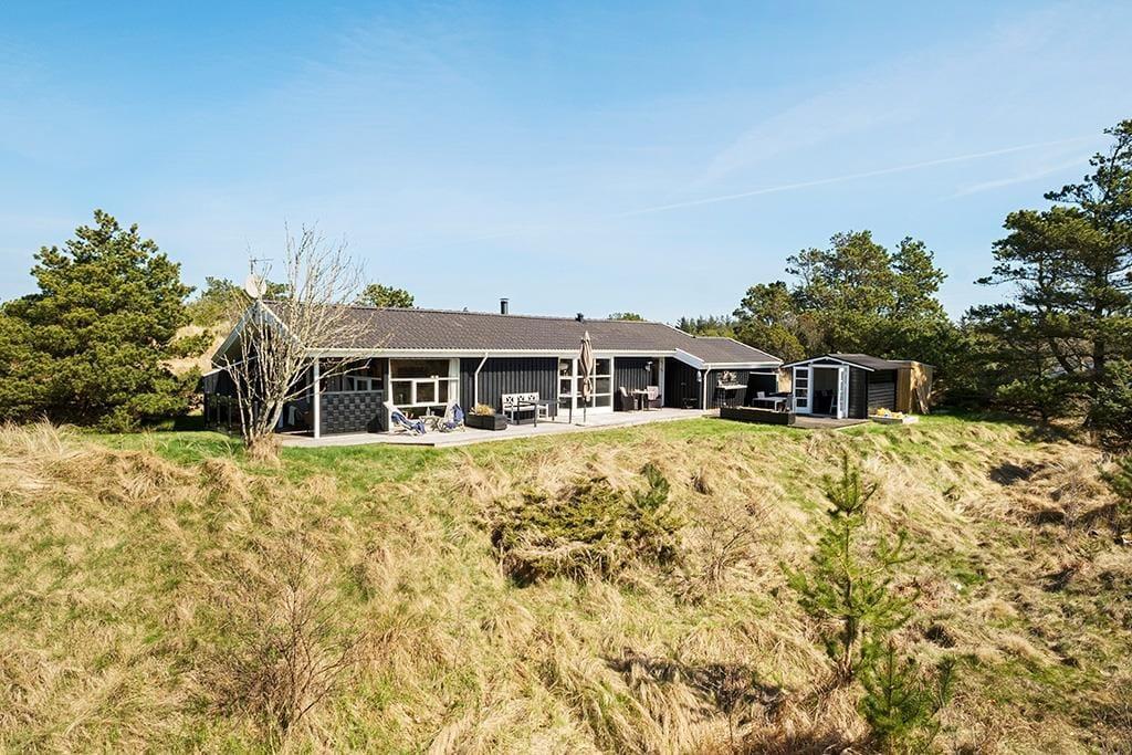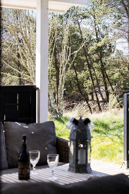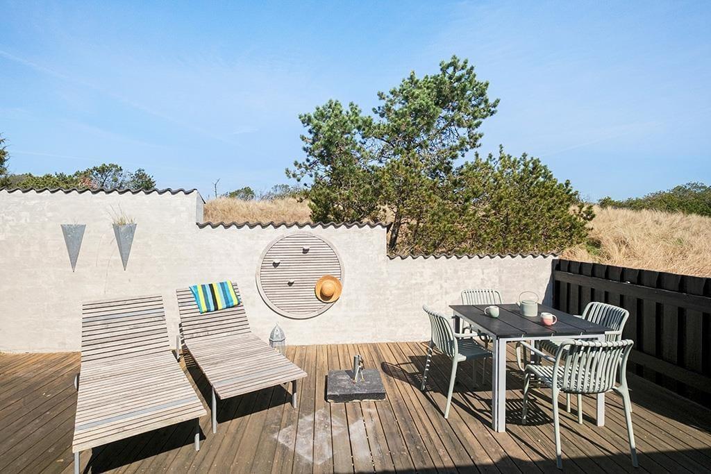 Es gibt drei Terrassen um den Großteil des Hauses. Der Teil am Wohnzimmer ist zudem überdacht und abgeschirmt. Hier sitzt es sich ideal am Abend, wenn es dämmert. Die wunderbare Natur mit hohen Bäumen und hügeligen Dünen ist fantastisch, denn hier lässt es sich bestens abschalten.