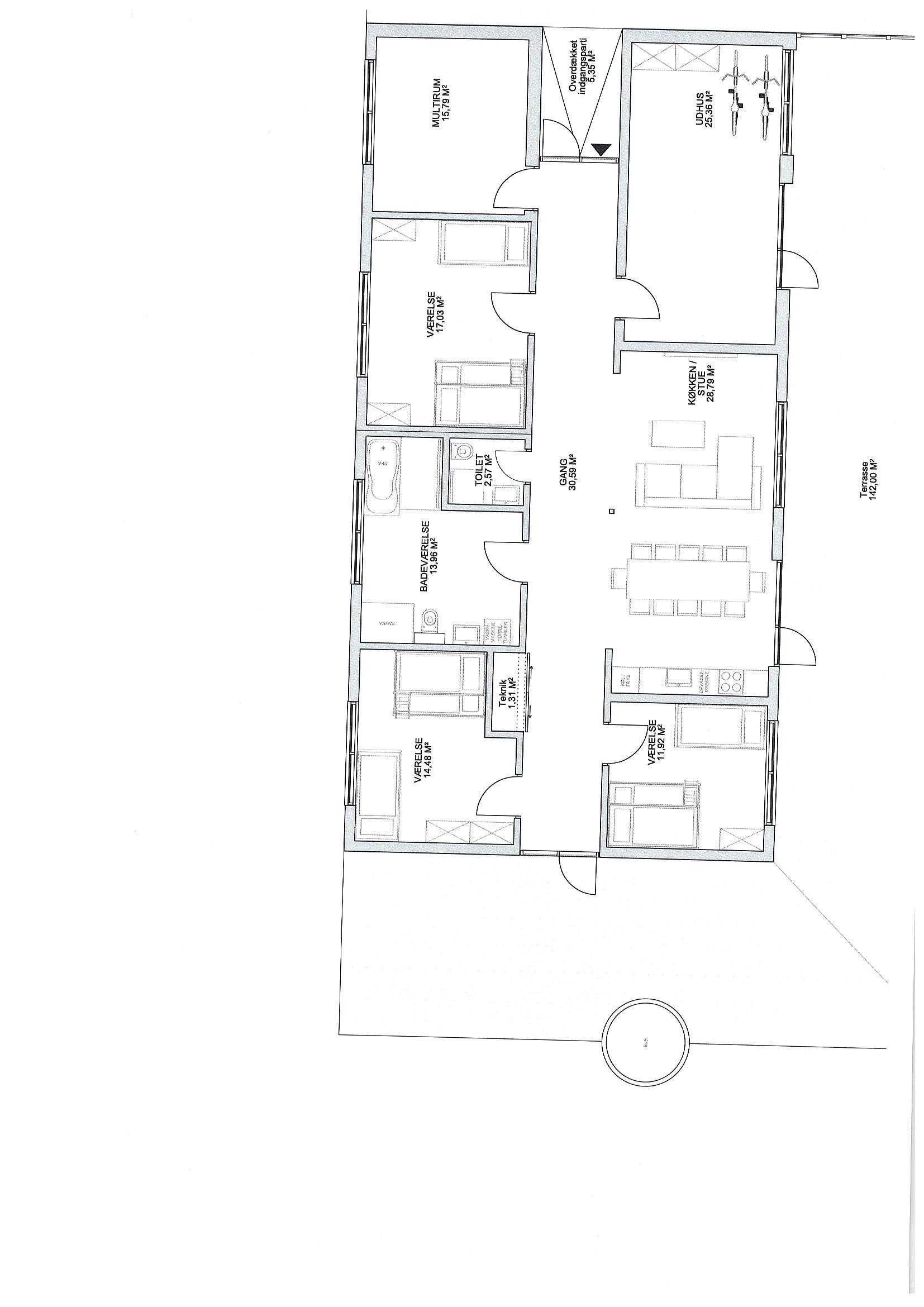 Husets indretning er stort køkken/alrum, 3 værelser, 2 badeværelser og et multirumsrum.