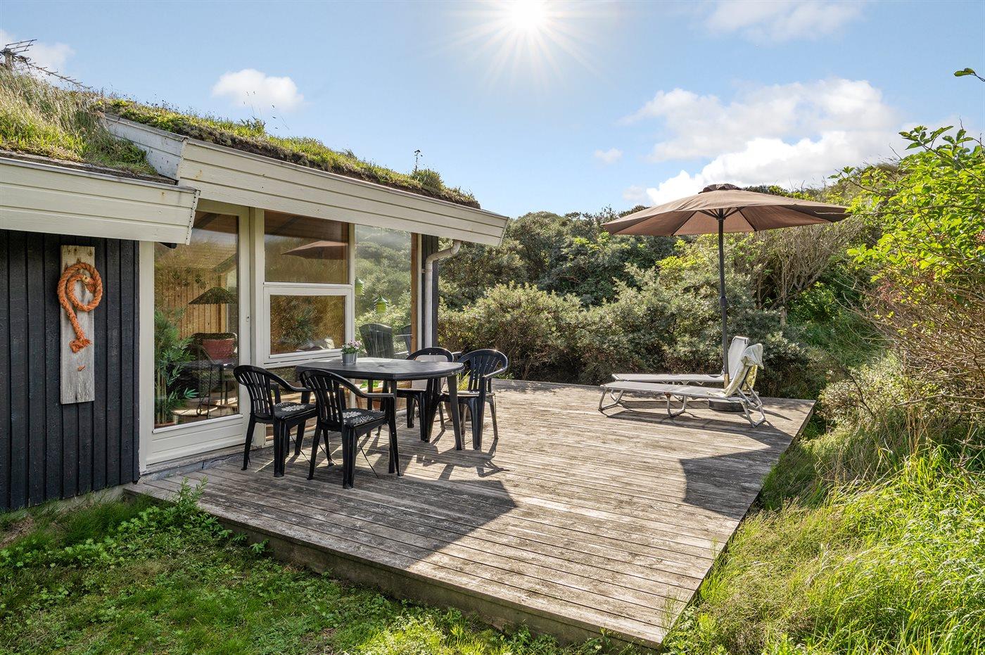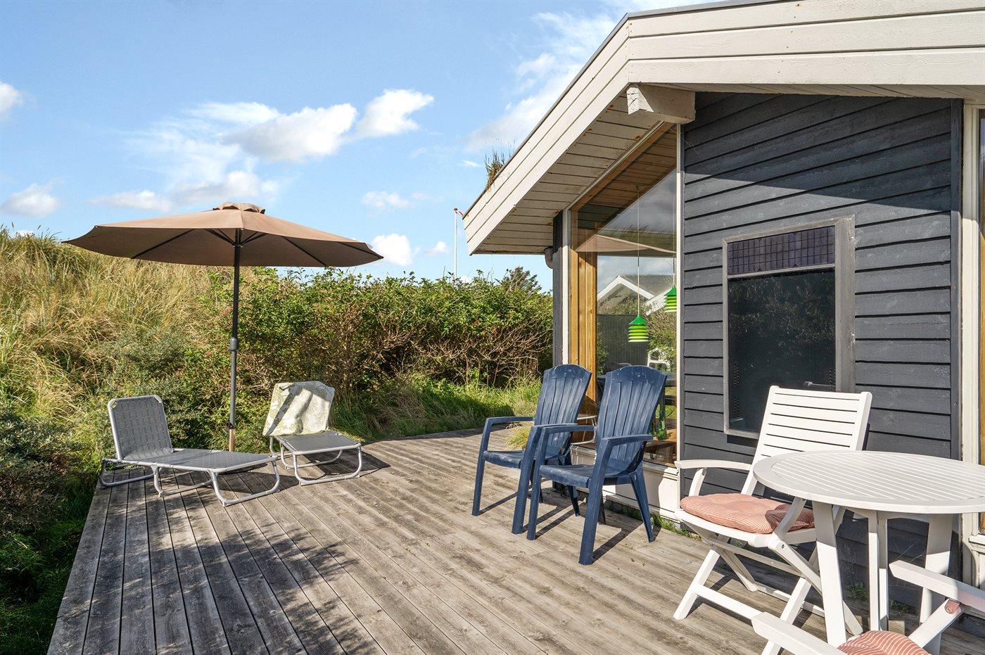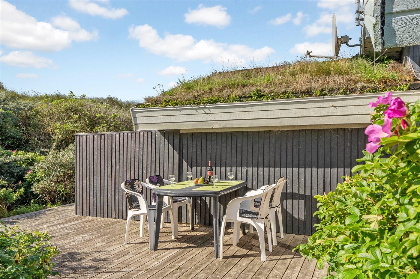 The holiday home is situated on a 1250 m² dune site. Situated 310 m from the sea. Nearest shop is 1000 m away. A 50 m² terrace belong to the holiday home. You find a tool shed. Carport is at your disposal.