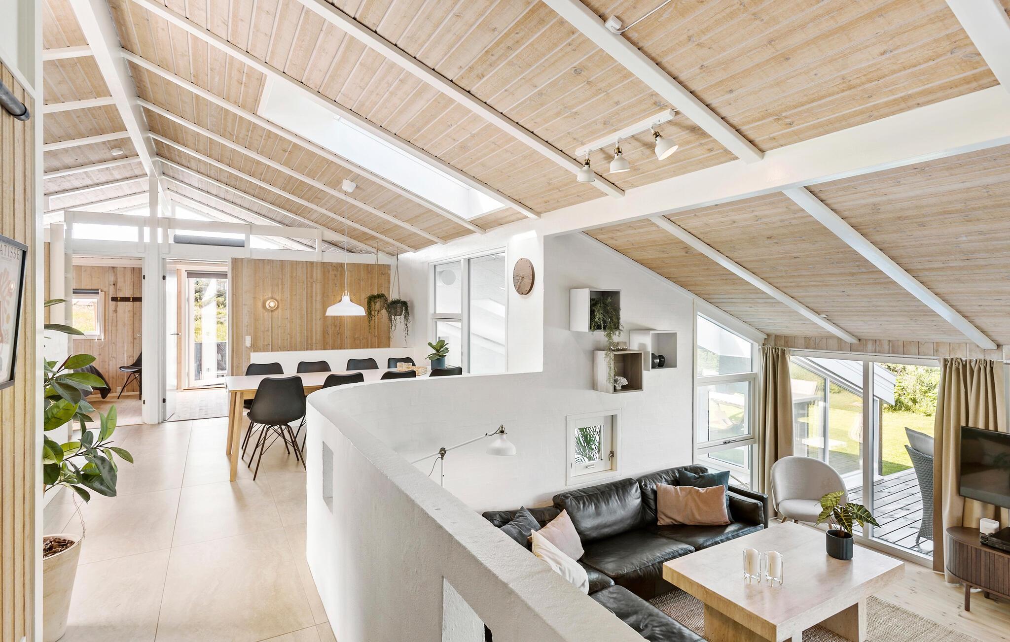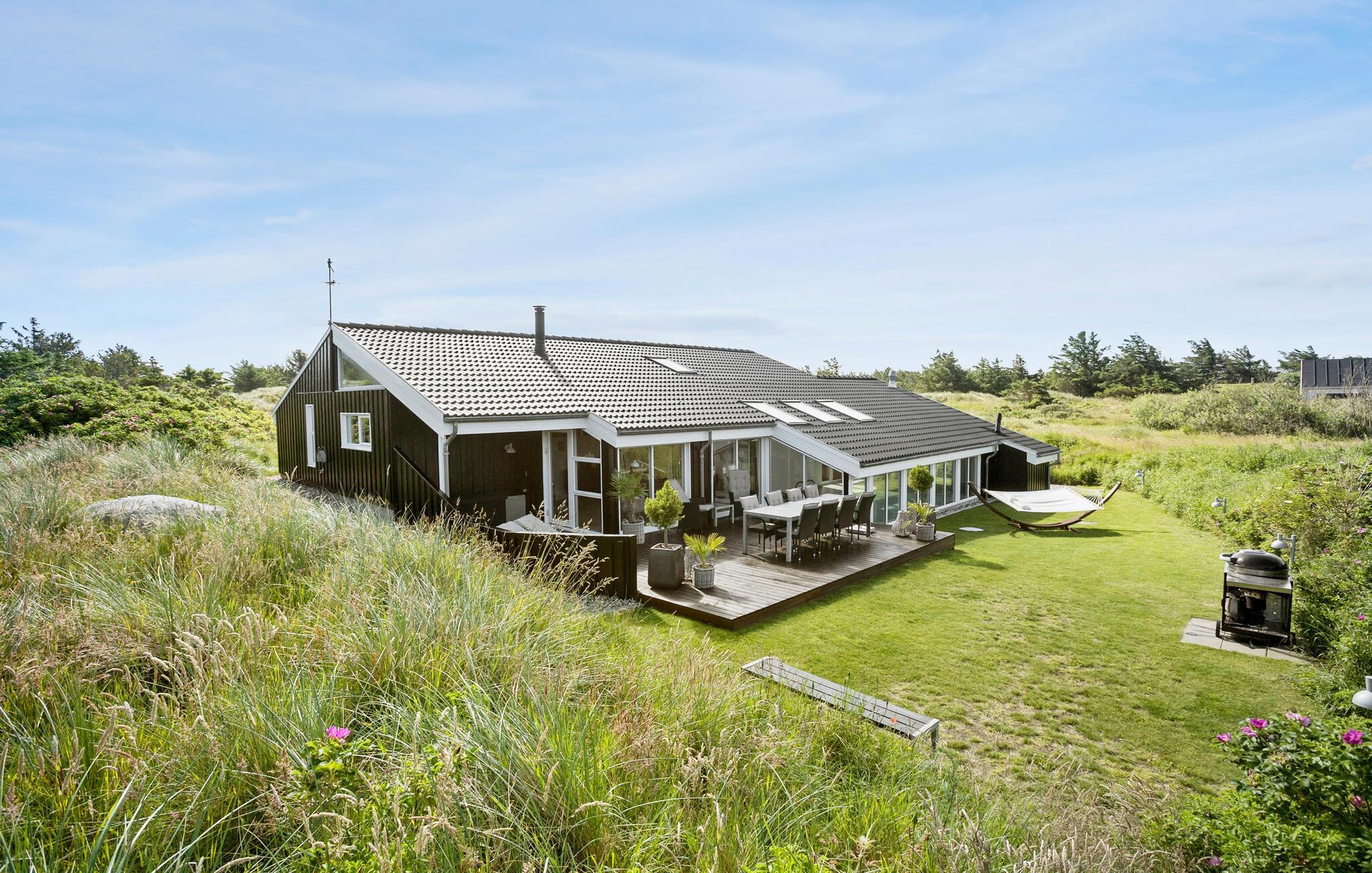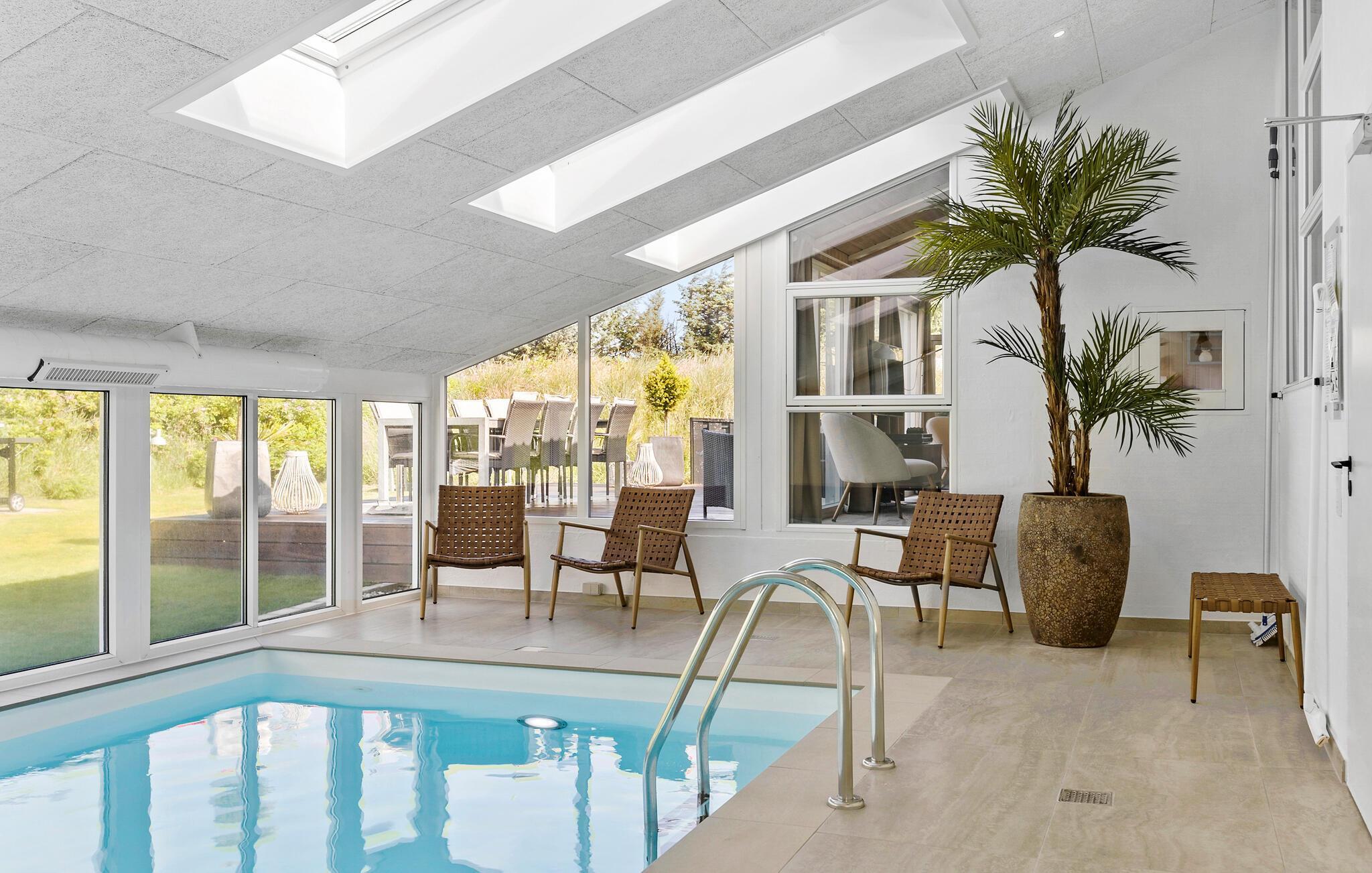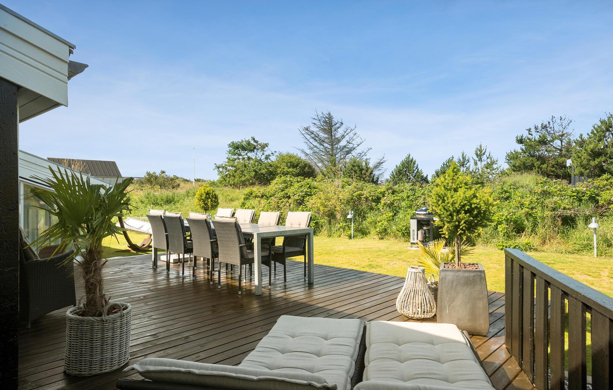 Hier wohnen Sie auch in fußläufiger Entfernung zu einem der besten Strände Dänemarks. Das Ferienhaus verfügt natürlich über allen Komfort. Eine der Attraktionen ist der Swimmingpool, den Sie von der Wohnküche und von zwei der insgesamt drei Terrassen sehen können. Im Poolbereich gibt es ein Bad, Sauna und Liegestühle. Die Stimmung in der Wohnküche ist gemütlich, und der Boden ist teilweise abgesenkt, was für eine interessante Perspektive sorgt. Die Terrassen und die Lampen im Garten bieten Entspannung bei viel Atmosphäre.