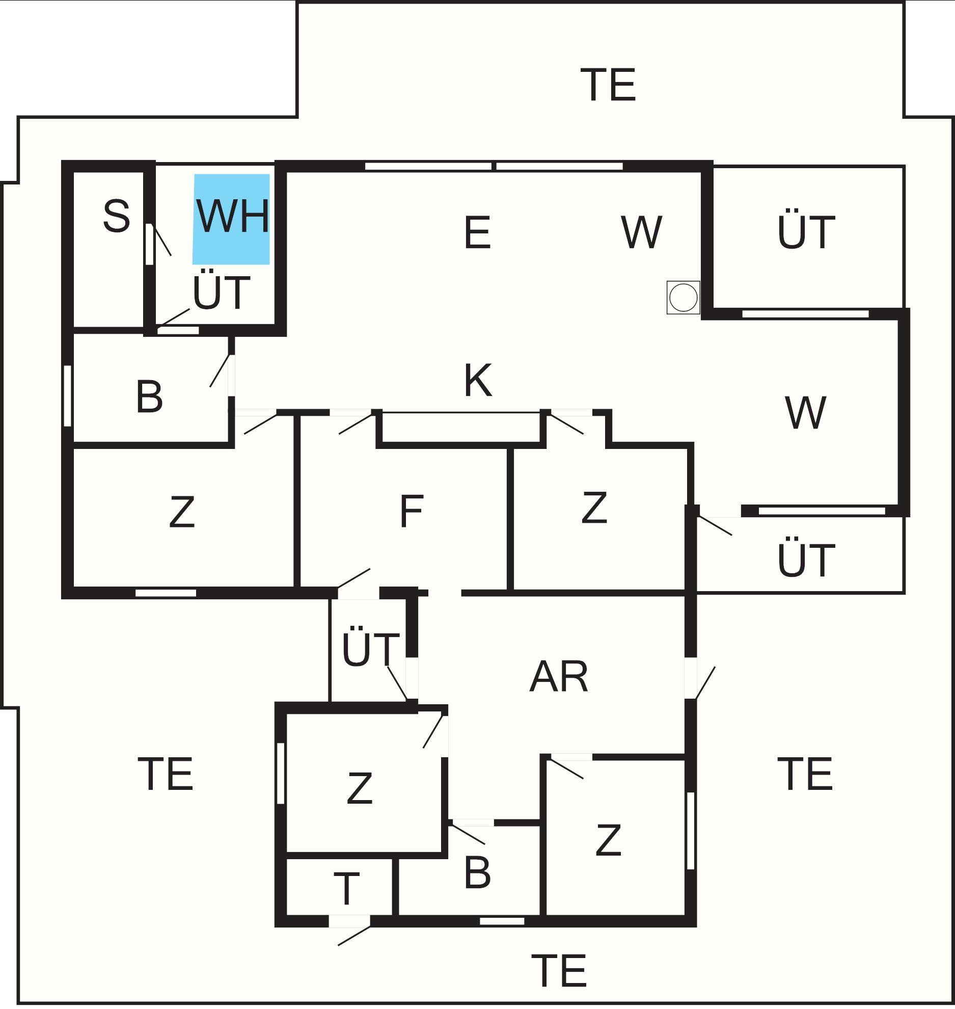 Bad: Waschm, Trockner, WC, Waschb., Dusche, Fußbodenheiz.