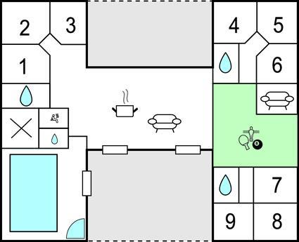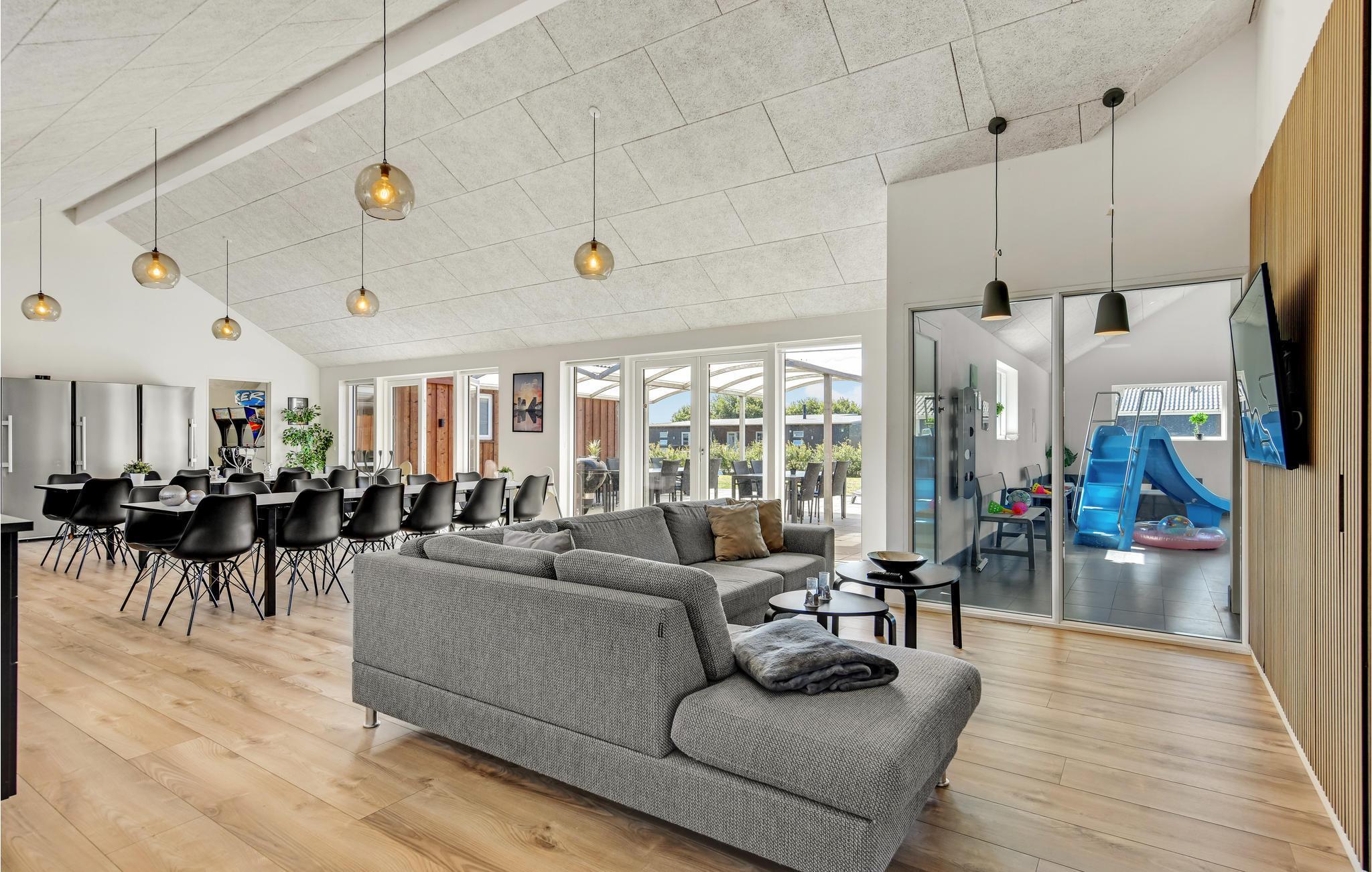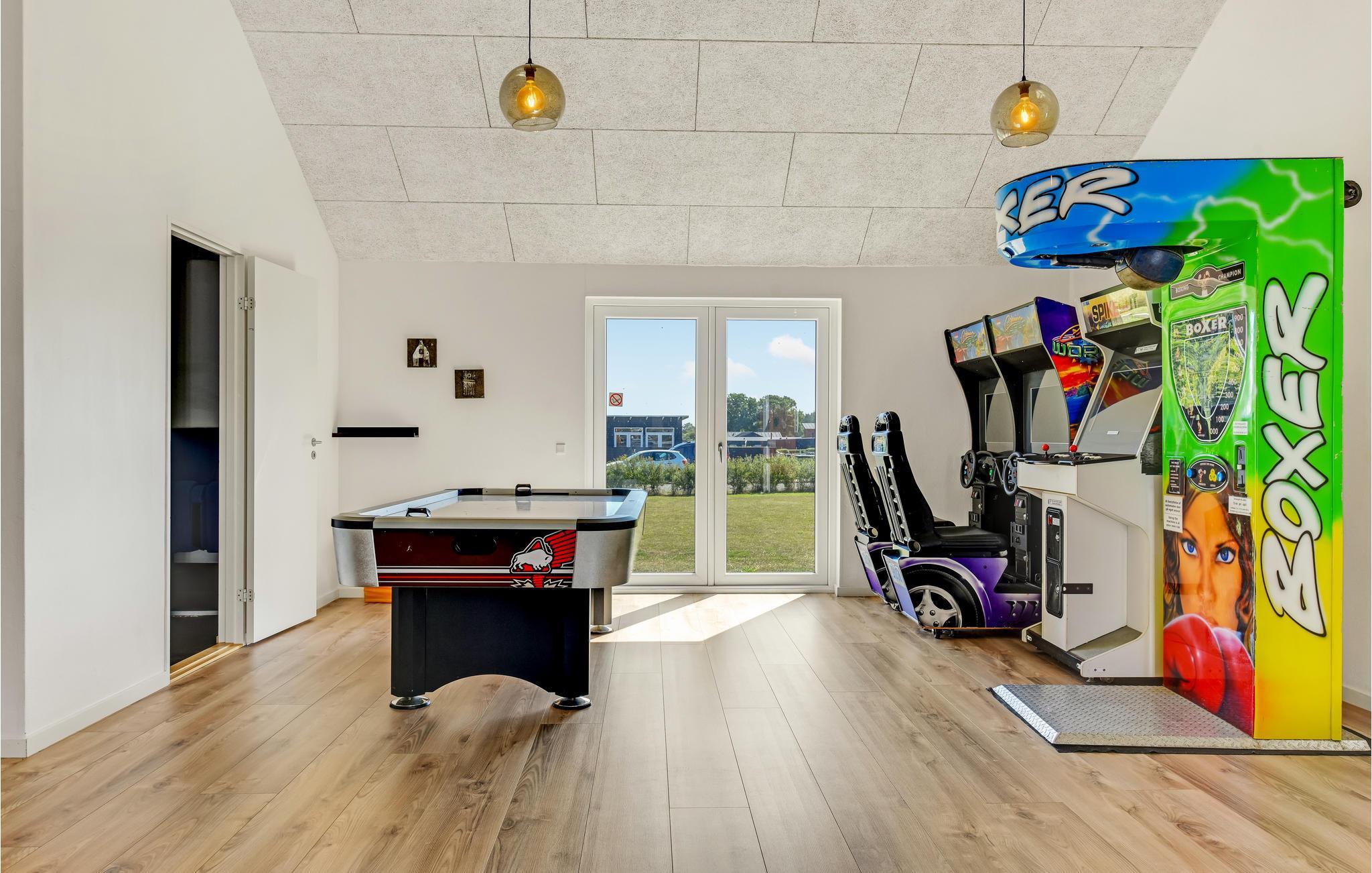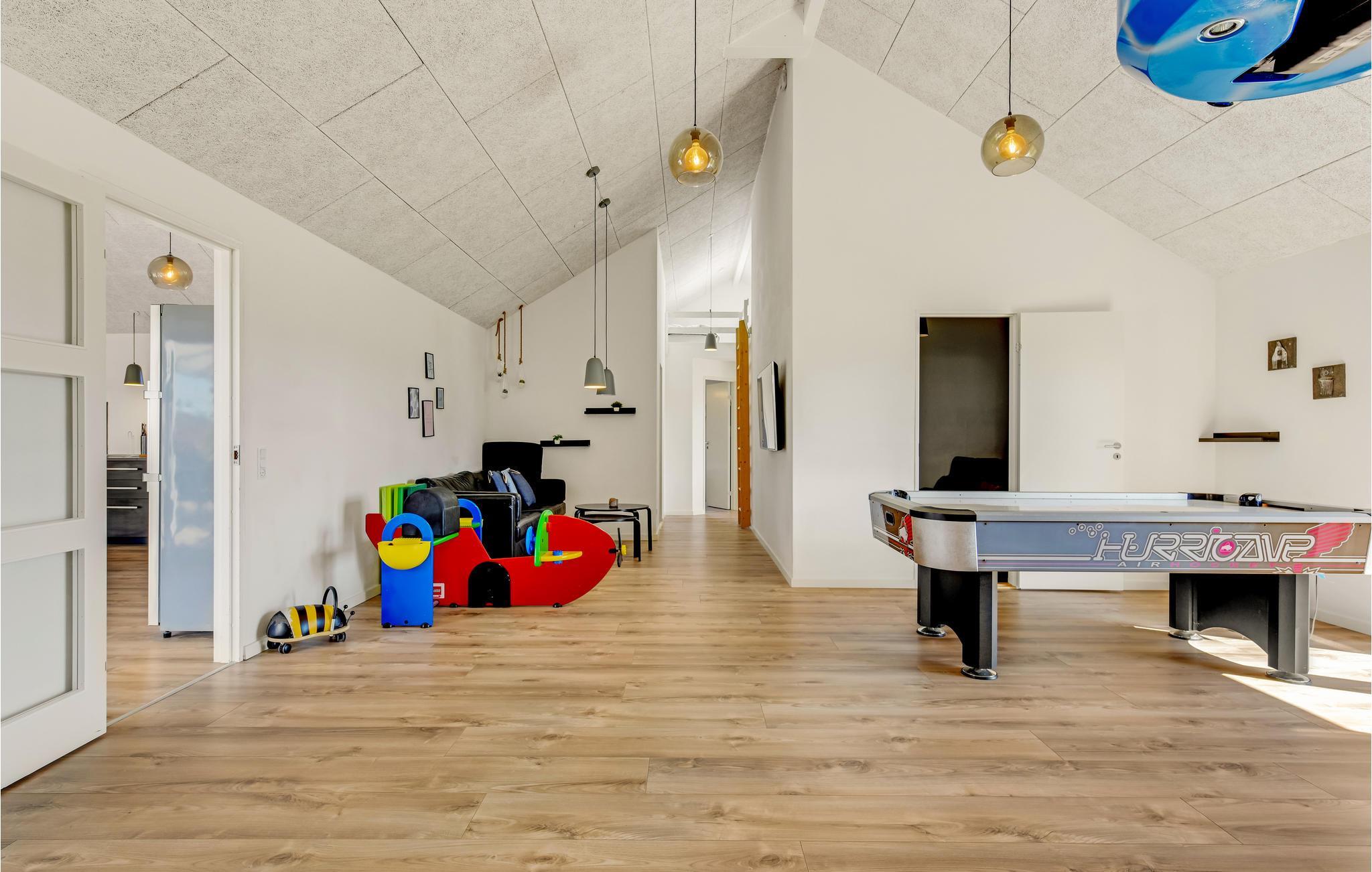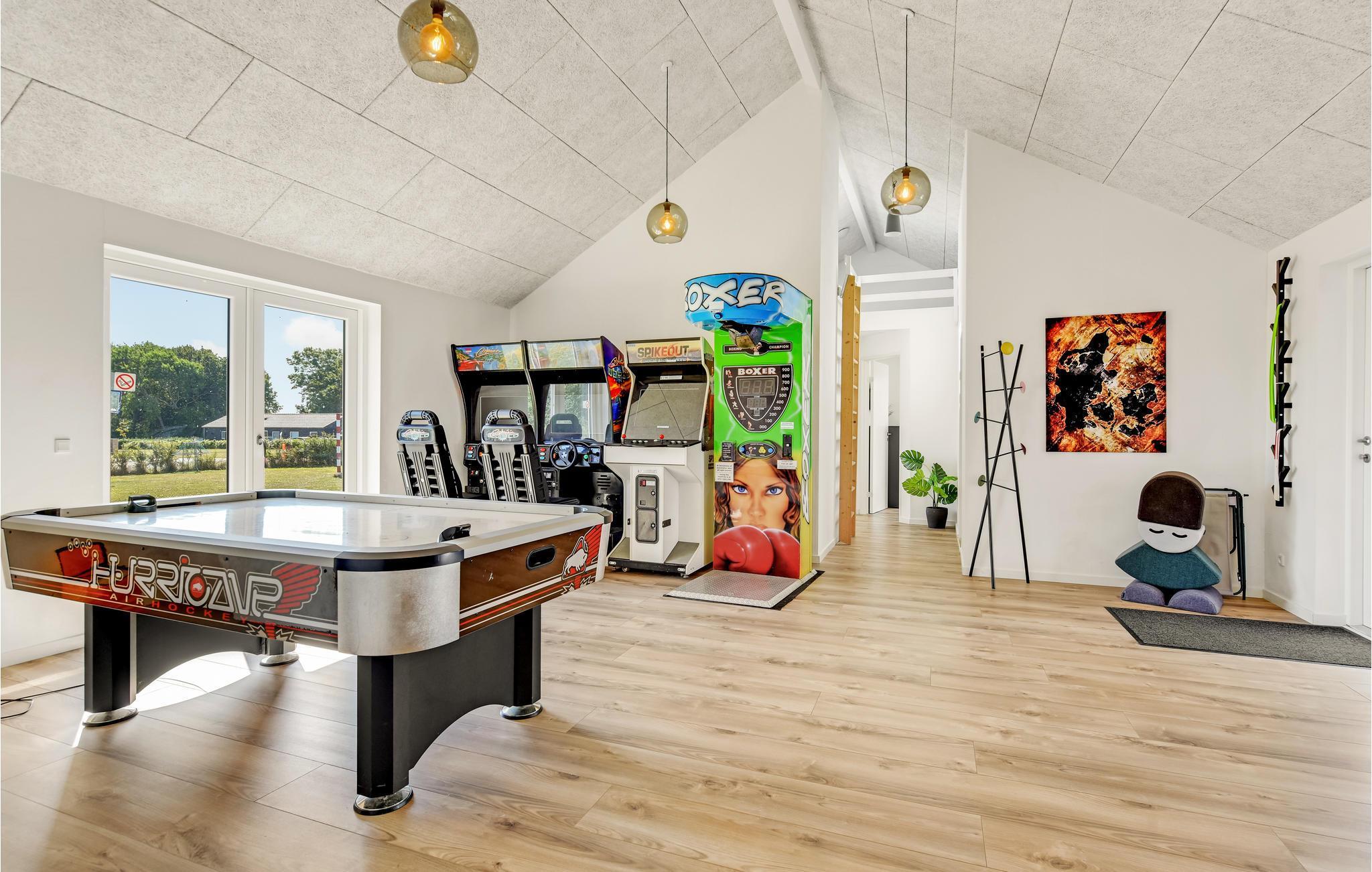 All in one Luxusferienhaus für die große Familie oder Gruppen von freunden, die gemeinsam Urlaub machen. Hier finden Sie alles, was das Herz begehrt, Swimmingpool mit Schwimmtrainer und Rutsche sowie großem Whirlpool für 7 Personen und einer Infrarotsauna im Wellnessbereich. Spannender Aktivitätsraum mit Airhockez und Arkadespielen, wo Sie u.a. Rennauto gegeneinander fahren können. Es gibt auch einen Kinoraum mit einem 70-Zoll Schirm. Die gutausgestattete Küche mit doppeltem Ofen, Geschirrspüler sowie Essplätzen und Wohnzimmer ist zentral im Haus platziert, es gibt drei Schlafabteilungen, so dass Sie sich jeweils als Familie dort aufhalten können. Das Ferienhaus hat nicht weniger als vier Bäder.