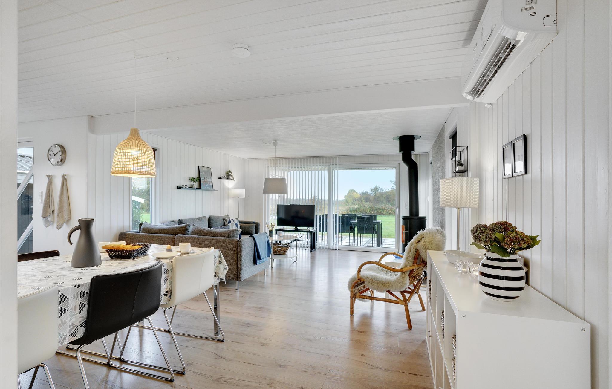 In einem schönen Freizeithausgebiet, mit der Natur direkt hinter dem Haus und dem Wald und das Meer nur 600 m entfernt, erwartet Sie das schöne Ferienhaus. Große Fenster im Wohnzimmer mit viel Licht im Inneren. Offen zur Küche. 3 gute Schlafzimmer für insgesamt 6 Gäste. Hier haben Sie es gemütlich, besonders vor dem knisternden Feuer des Kaminofens. Vor dem Wohnzimmer liegt die teilweise überdachte Terrasse, auf ihr genießen Sie den ganzen Tag die Sonne. Im Garten gibt es Spielgeräte und eine Feuerstelle, backen Sie hier Ihr Stockbrot mit den Kindern. Der Campingplatz Sandersvig liegt nur 200 m entfernt, er ist von Ostern bis Mitte September offen und beherbergt einen Kiosk, ein Schwimmbad mit tropischen Temperaturen, Tennisplätze und einen Spielplatz mit einem Hüpfkissen. In südöstlicher Richtung vom Ferienhaus gibt es ein 8 ha großes, eingezäuntes Gebiet mit Kronwild. Auf dem Weg zum Strand durchqueren Sie einen Buchenwald, der auch zu Spaziergängen einlädt. Kolding 25 km. Haderslev 15 km, Christiansfeld 10 km.