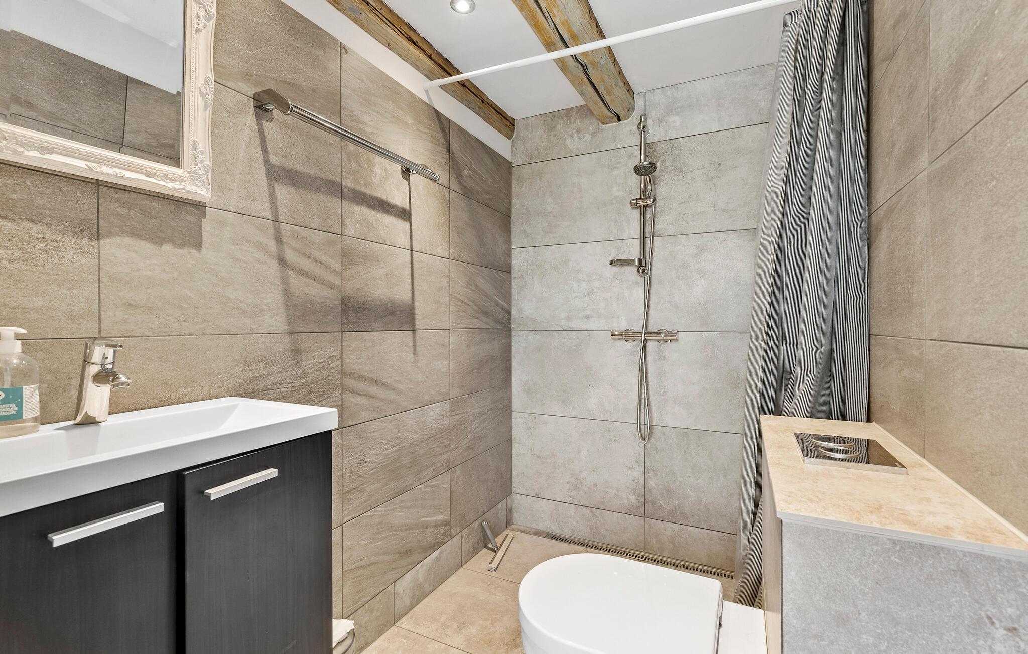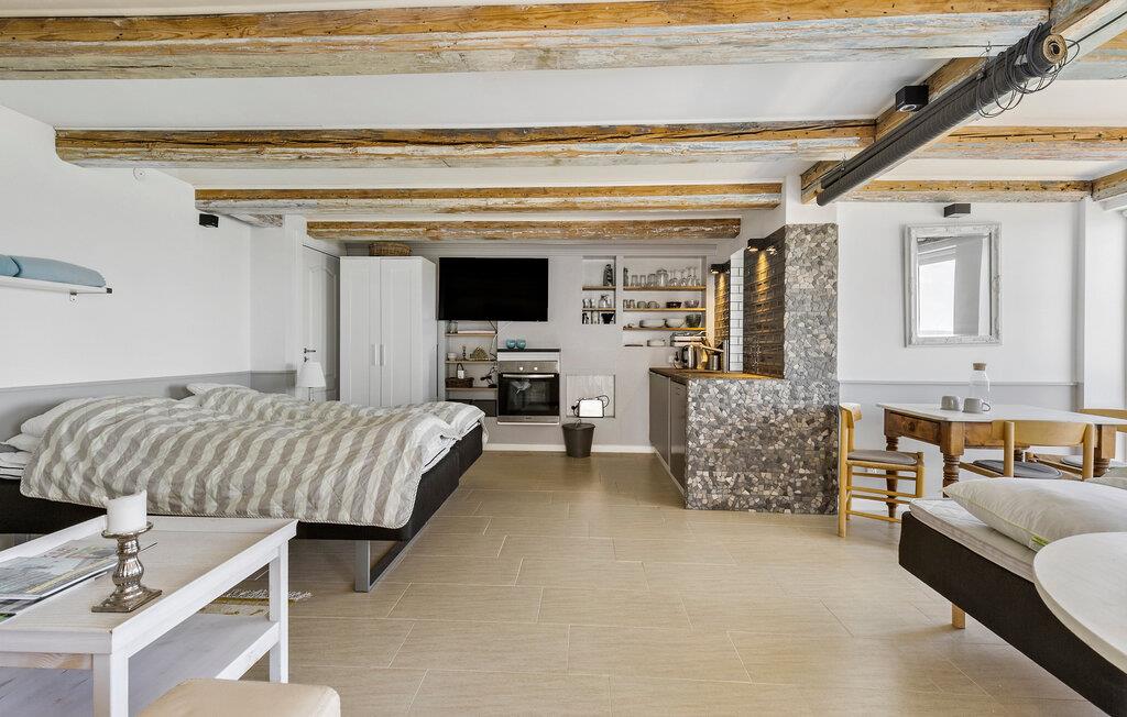 Die Wohnung ist bestens eingerichtet und verfügt über eine Fußbodenheizung, die für ein angenehmes Raumklima sorgt. Auch auf smartes Design und charmante Details wie sichtbare Trägerbalken unter der Decke, große Leuchten und schöne Fliesenböden wurde Wert gelegt. Freuen Sie sich auf eine offene Wohnküche, ein Esszimmer sowie eine Sitzecke und ein gemütliches Doppelbett.