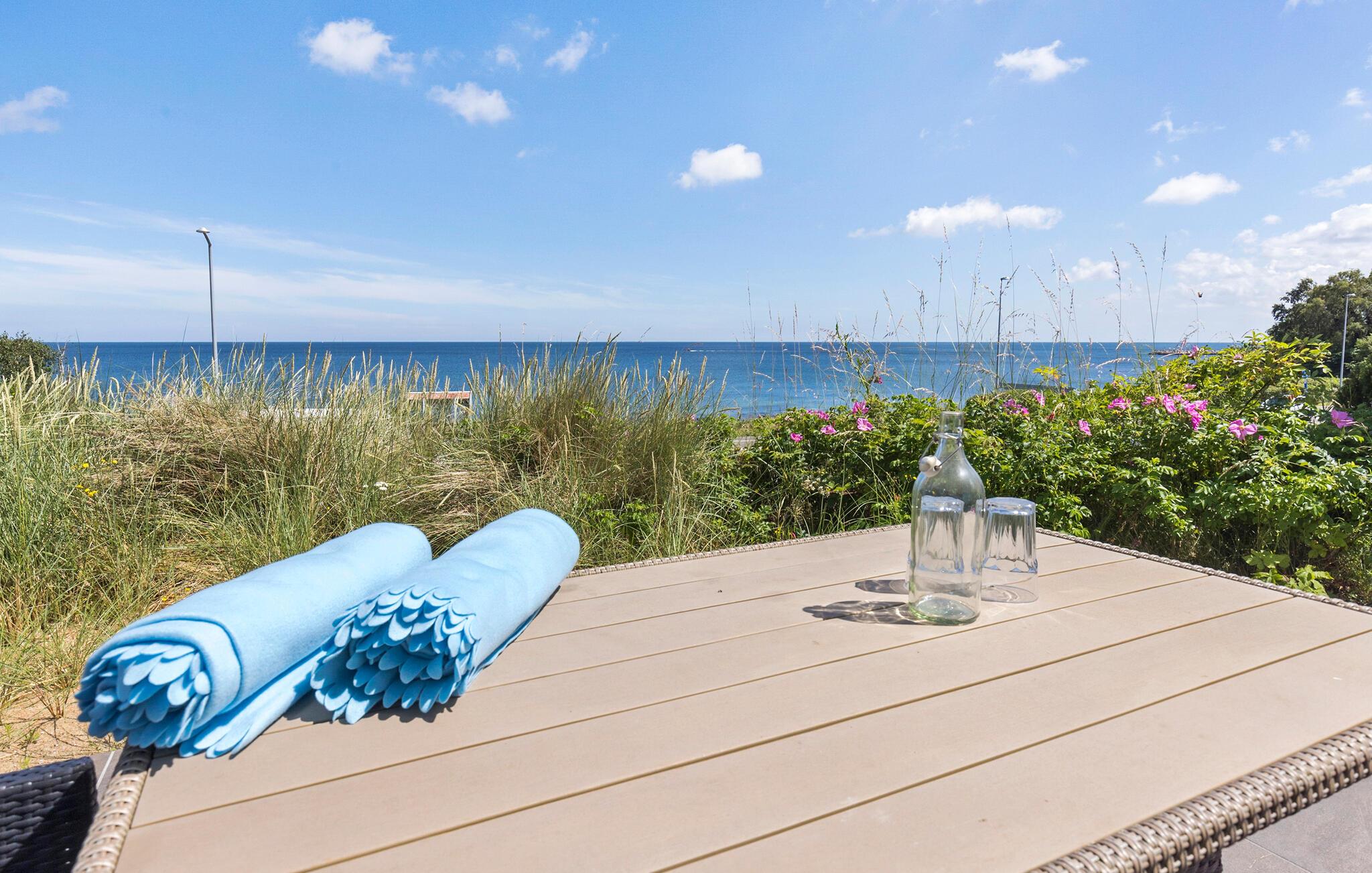 Schön ist es auch rund um das Haus, denn hier wartet eine Terrasse mit Außendusche, Loungemöbeln – natürlich mit einem grandiosen Meerblick im Hintergrund. Sie haben Zugang zu einem Gasgrill, den Sie sich mit den anderen Wohnungen teilen.