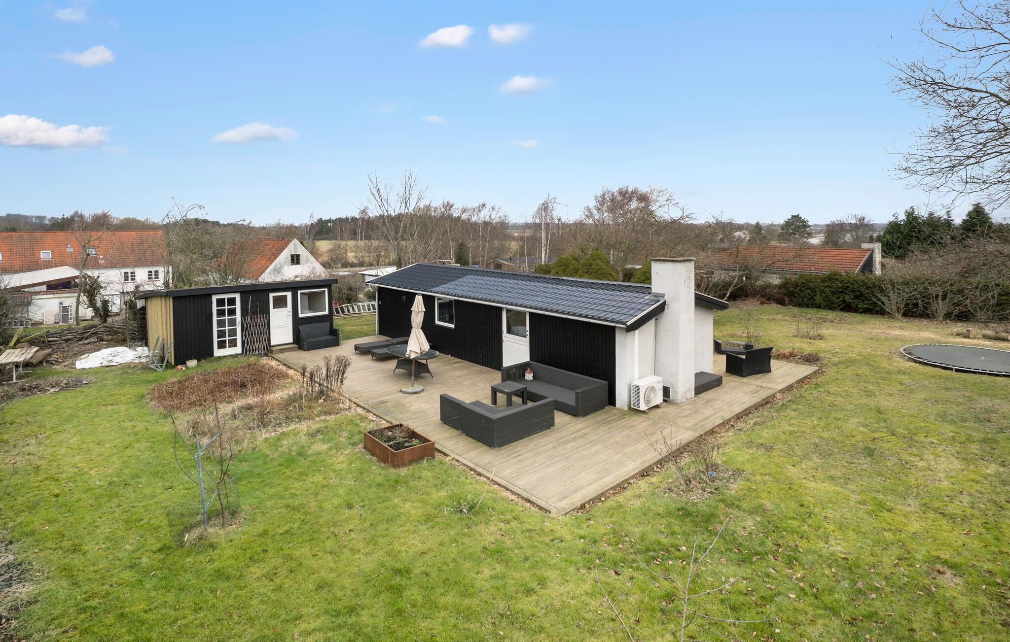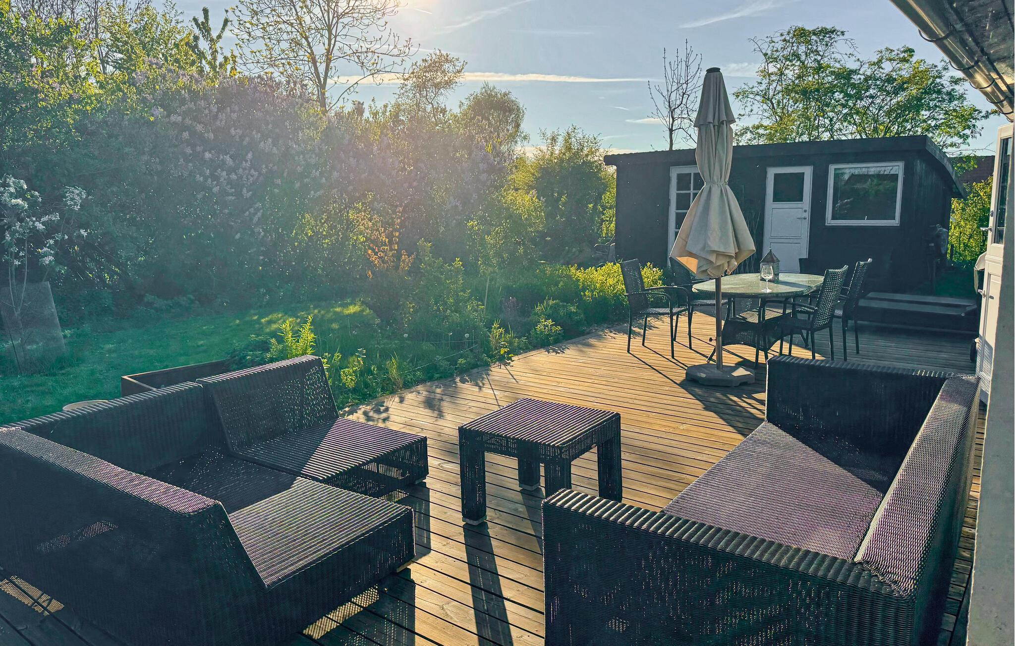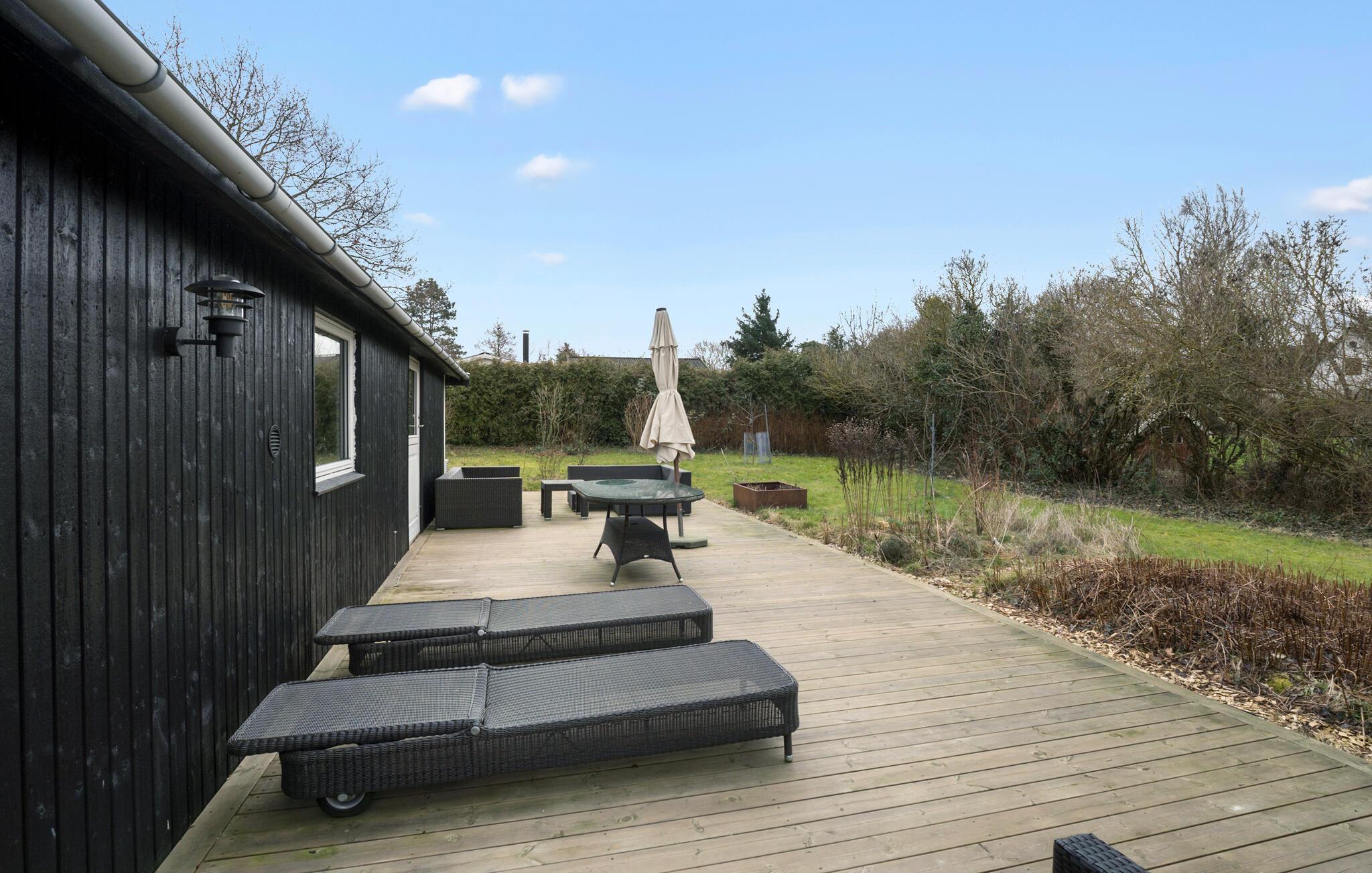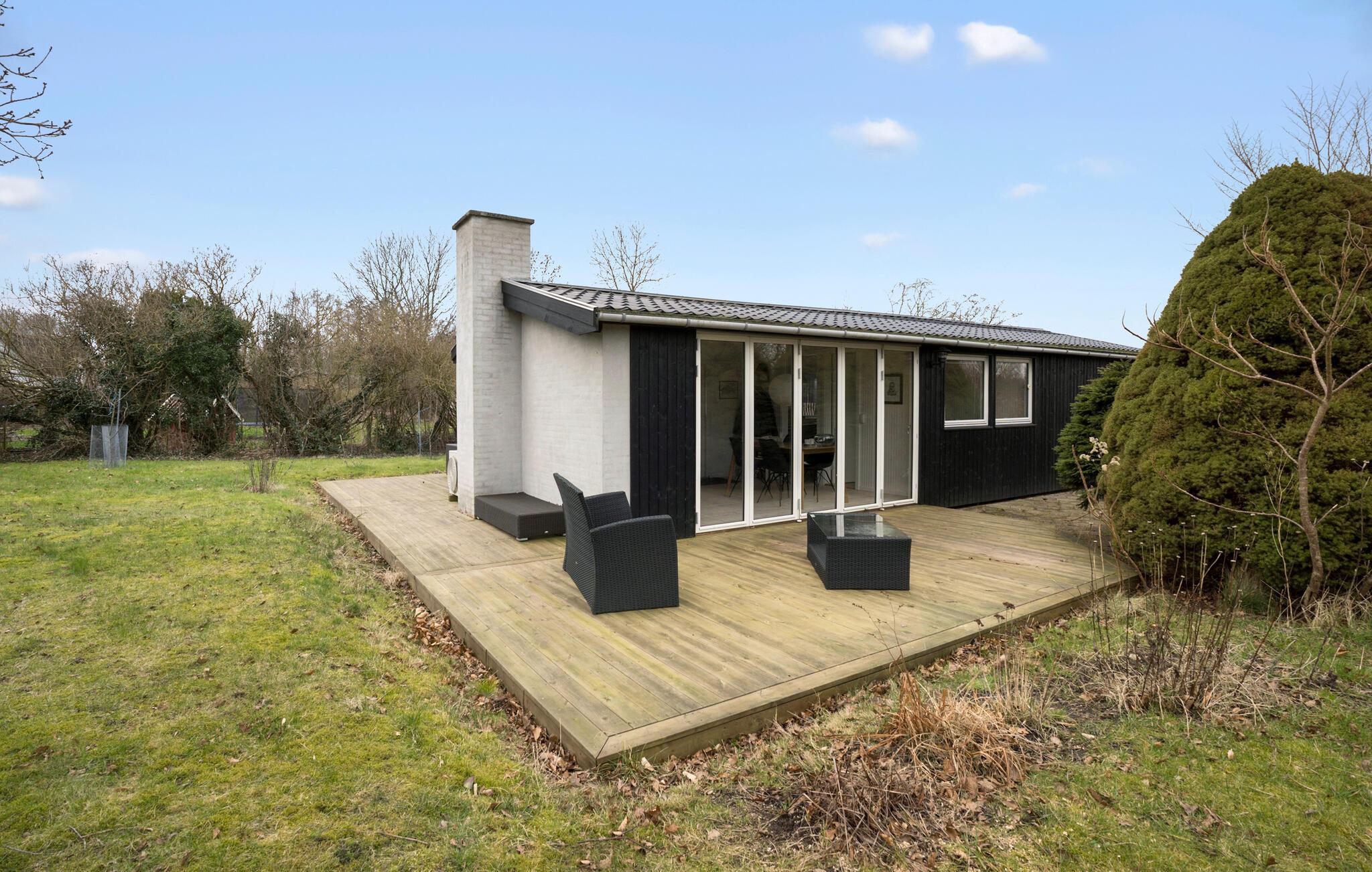 Genießen Sie die Ruhe und das charmante Ambiente dieses gemütlichen Ferienhauses mit großer Holzterrasse unweit des Lammefjords.