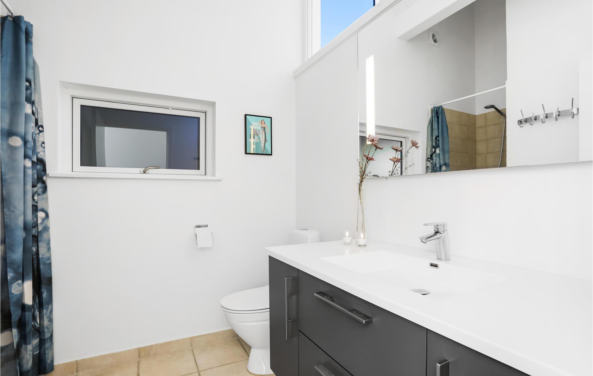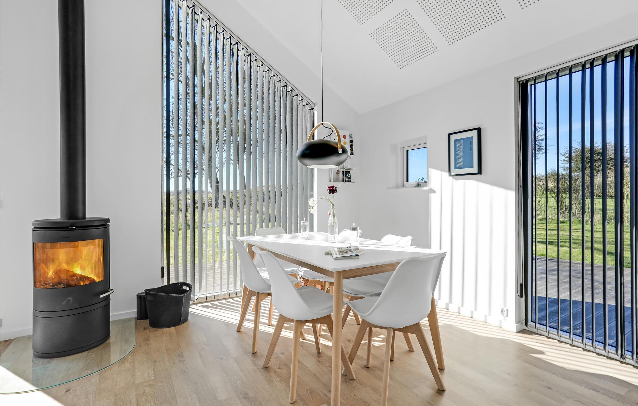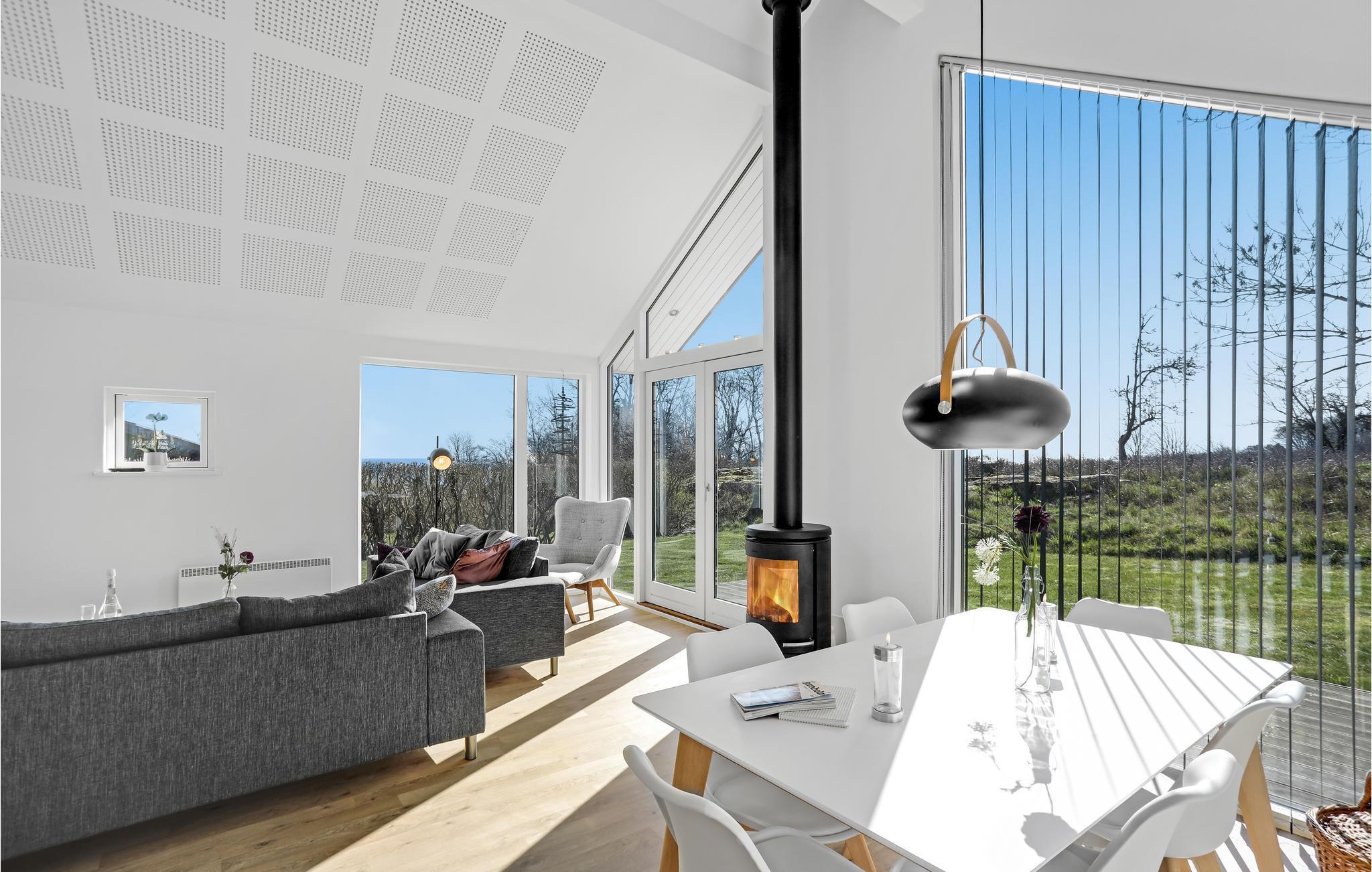 Das Haus ist hell und modern eingerichtet. Eine geräumige und sehr gemütliche Atmosphäre entsteht durch die Offenheit der Räume bis unter den Dachgiebel. Das schöne Wohnzimmer ist mit bequemen Sitzgelegenheiten, einem Holzofen für die kühlere Jahreszeit und einem Fernseher mit Apple TV für die abendliche Unterhaltung ausgestattet. Große Fenster lassen viel Licht herein und eröffnen einen schönen Blick auf das Meer und die grüne Umgebung. In der offenen, gut ausgestatteten Küche lassen sich köstliche Mahlzeiten leicht zubereiten. Im Badezimmer des Hauses befindet sich eine Fußbodenheizung.