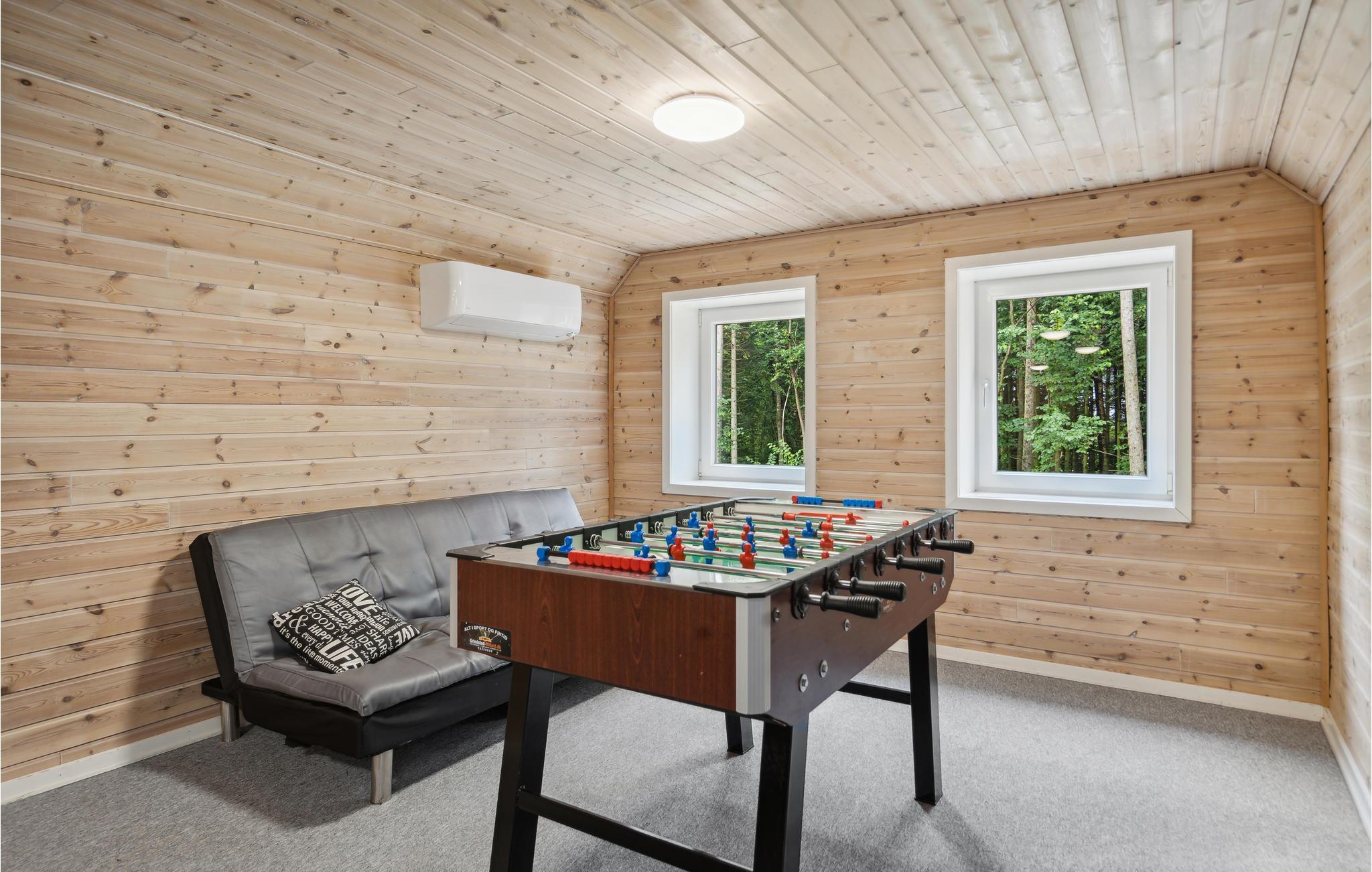 Das Ferienhaus verfügt über einen Kaminofen, der mit Holzpellets beheizt wird und so zu niedrigeren Heizkosten beiträgt. Im Spielraum haben Sie Pooltisch, Airhockey und Tischfußball. Zum Haus gehört auch ein geschlossener, teilweise überdachter Innenhof mit Tischtennis und anderen Spielen.