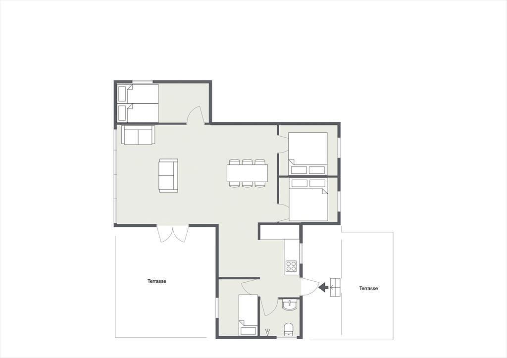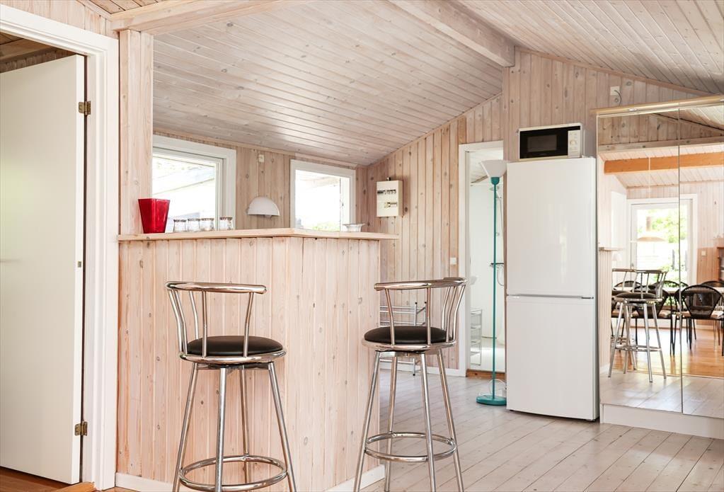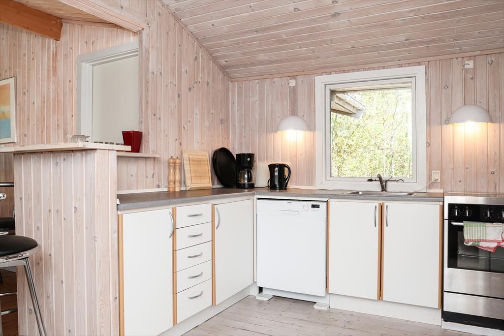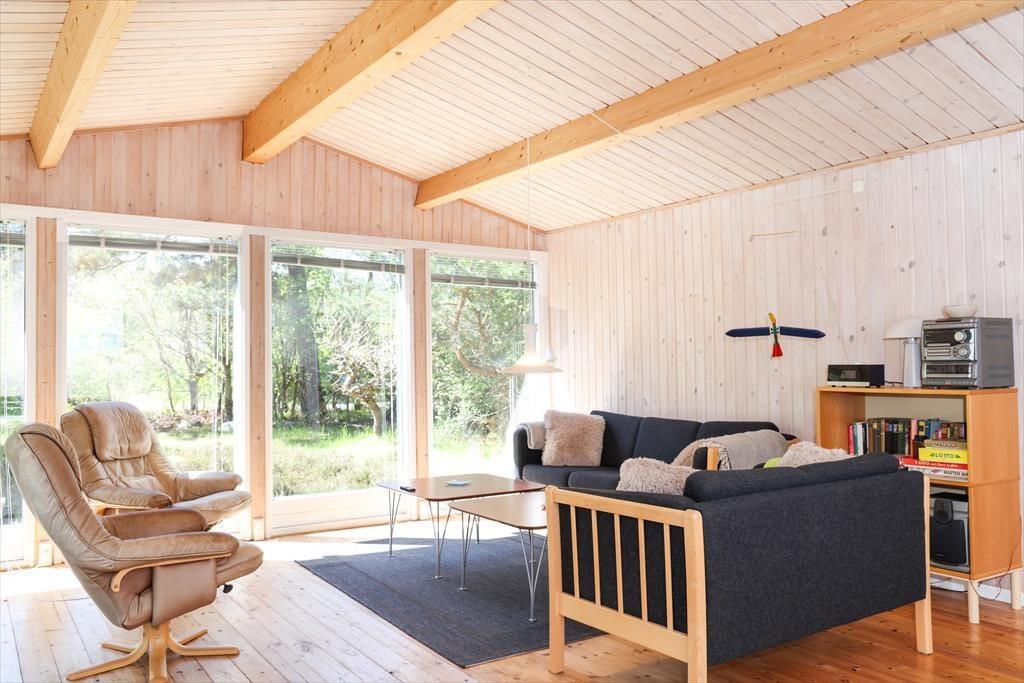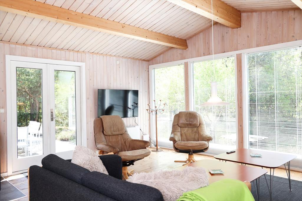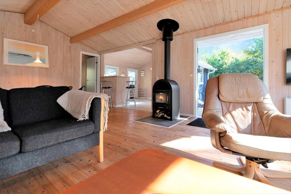Dieses schöne Ferienhaus ist im Innenraum hell und geräumig. Um den Couchtisch herum gibt es gemütliche Sitzplätze für alle Mitreisenden. Von hier aus genießt ihr die Aussicht in den grünen Garten durch die große Fensterpartie. Ob ihr gemeinsam kocht oder du das Kochen alleine übernimmst, so nimmst du dennoch Teil an der Gruppendynamik, da die Küche offen mit dem Wohnraum verbunden ist.