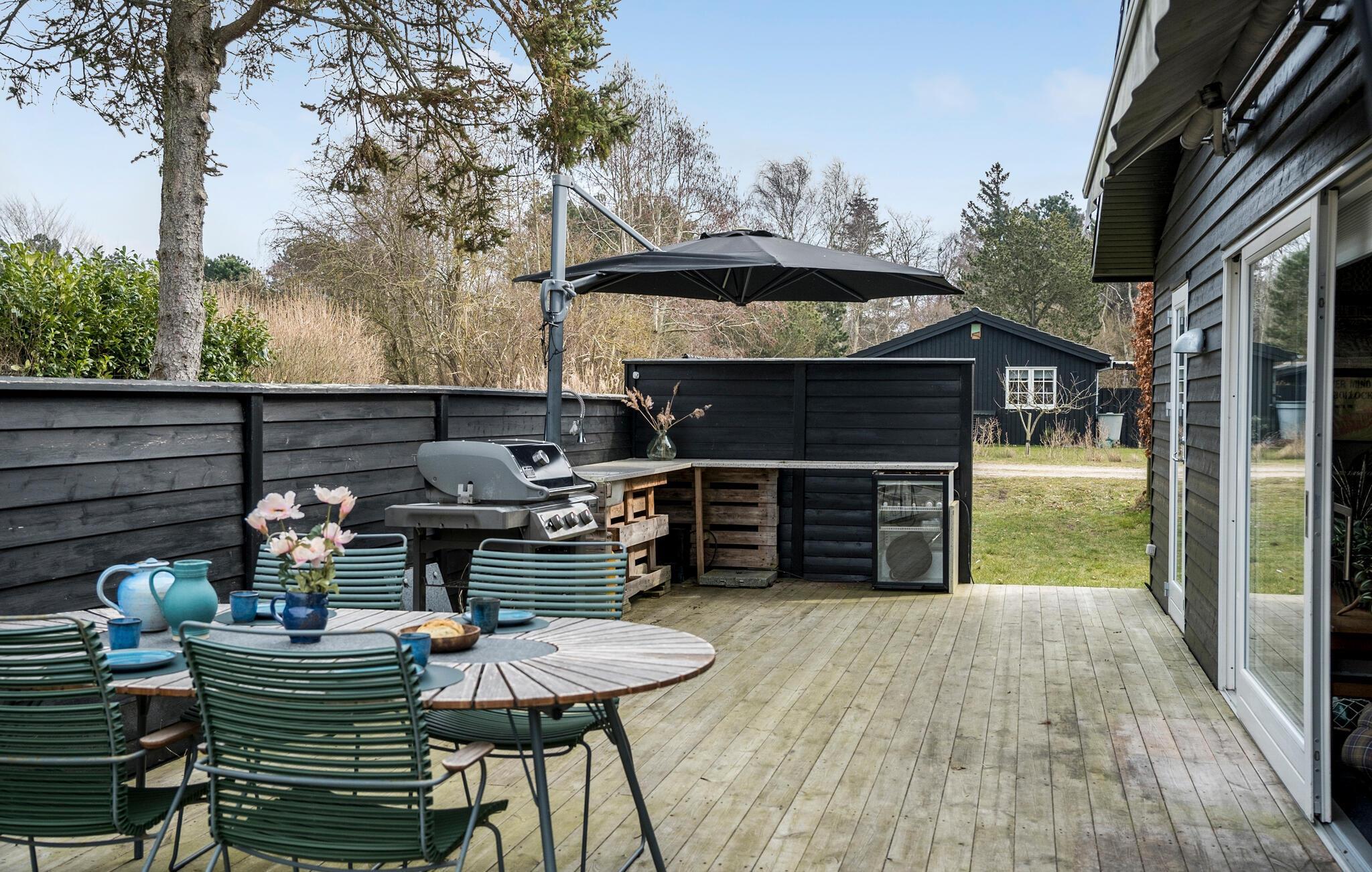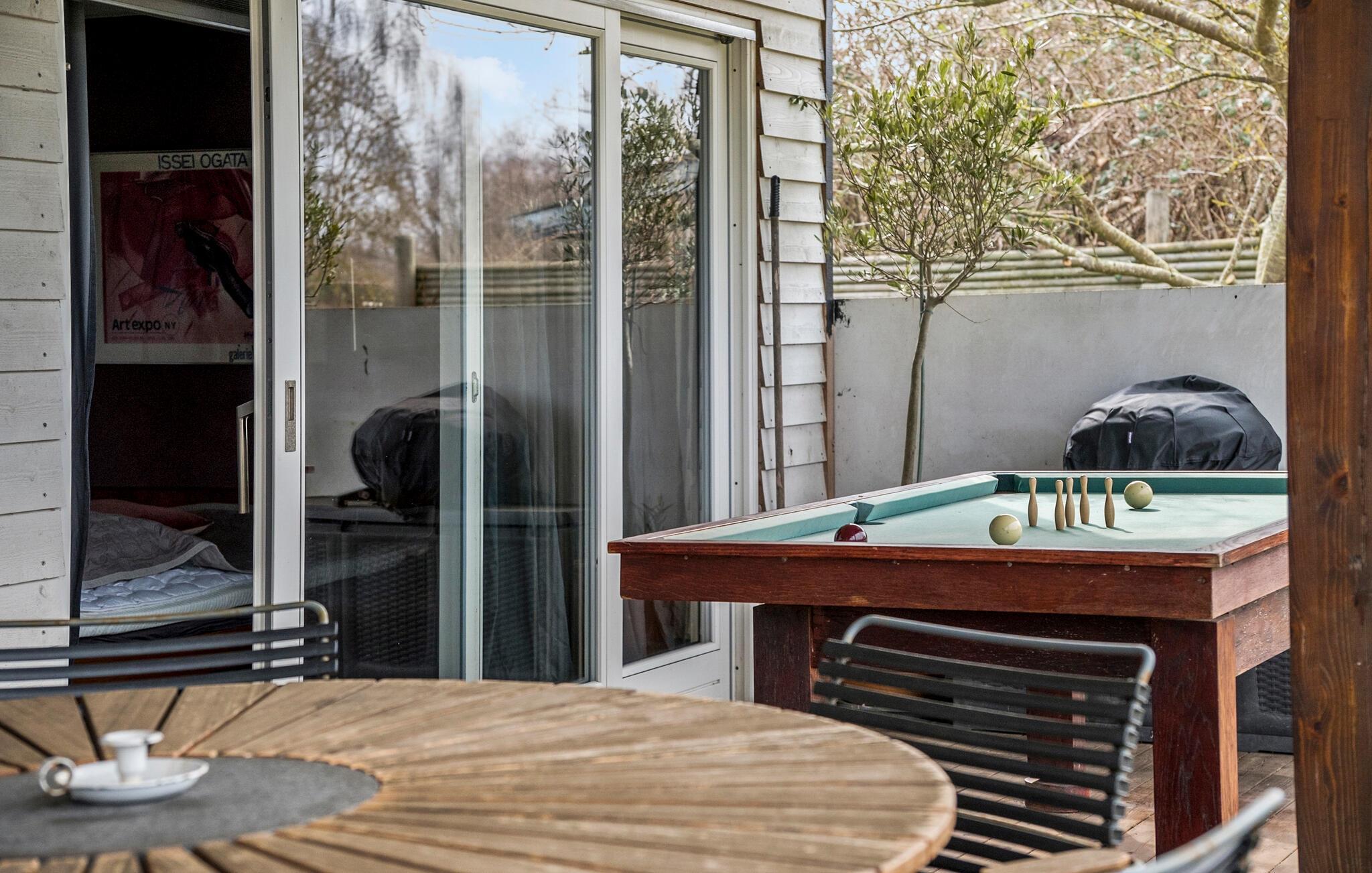 Im Außenbereich erleben Sie erholsame Stunden auf der großen Holzterrasse mit Grill, gemütlichen Sitzmöbeln und Sonnenliegen. Genießen Sie entspannte Grillabende, spielen Sie eine Partie Billard im Freien oder veranstalten Sie im Garten spannende Kubb-Wettkämpfe. Eine urige Feuerstelle im Grünen lädt ein, den Tag gemeinsam ausklingen zu lassen.