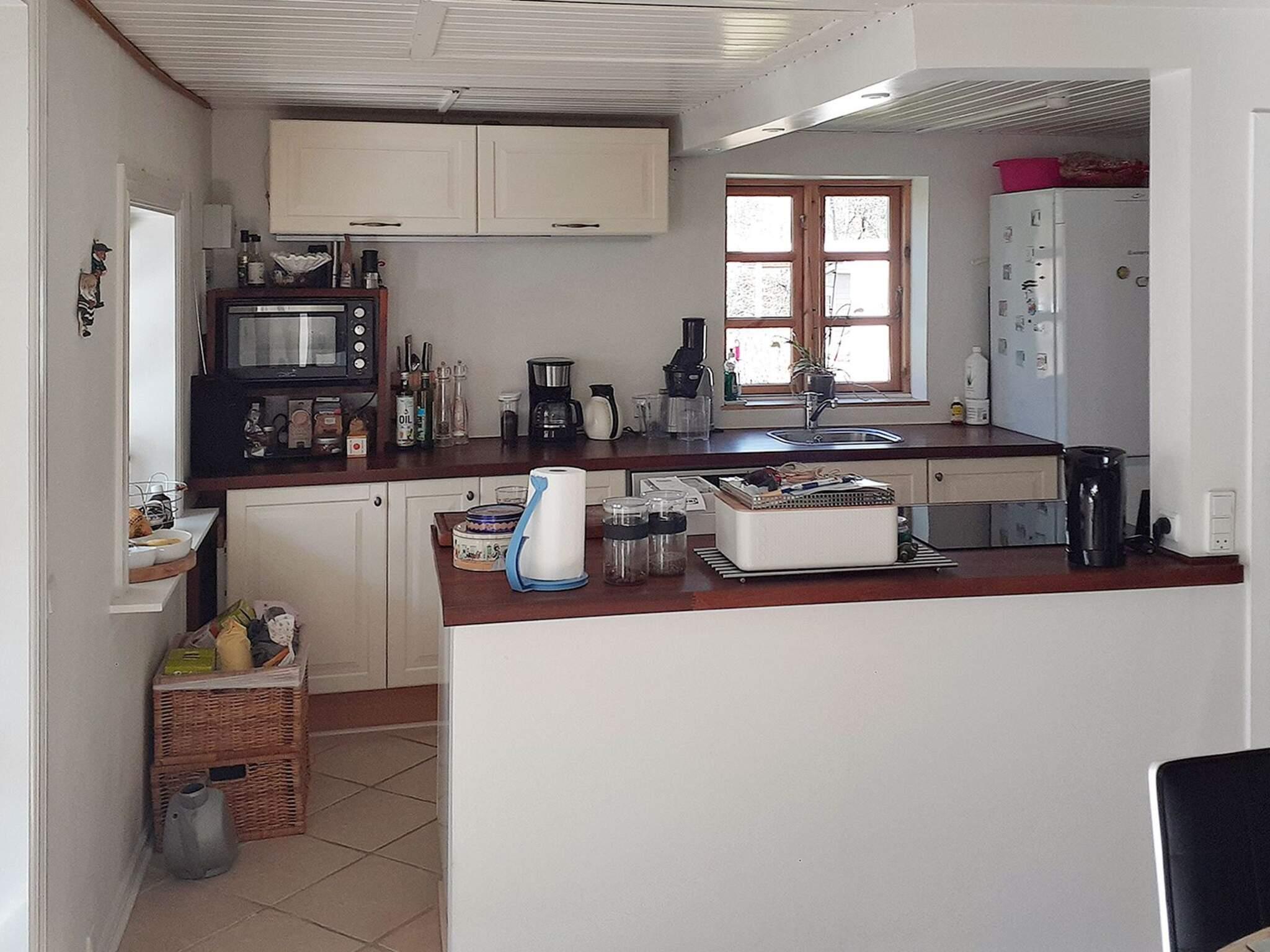 In Verbindung mit der offenen Küche gibt es einen Zugang zur verglasten Veranda und weiter zum kleineren Teil des Hauses, in dem sich eine Toilette und ein praktischer Hauswirtschaftsraum befinden.