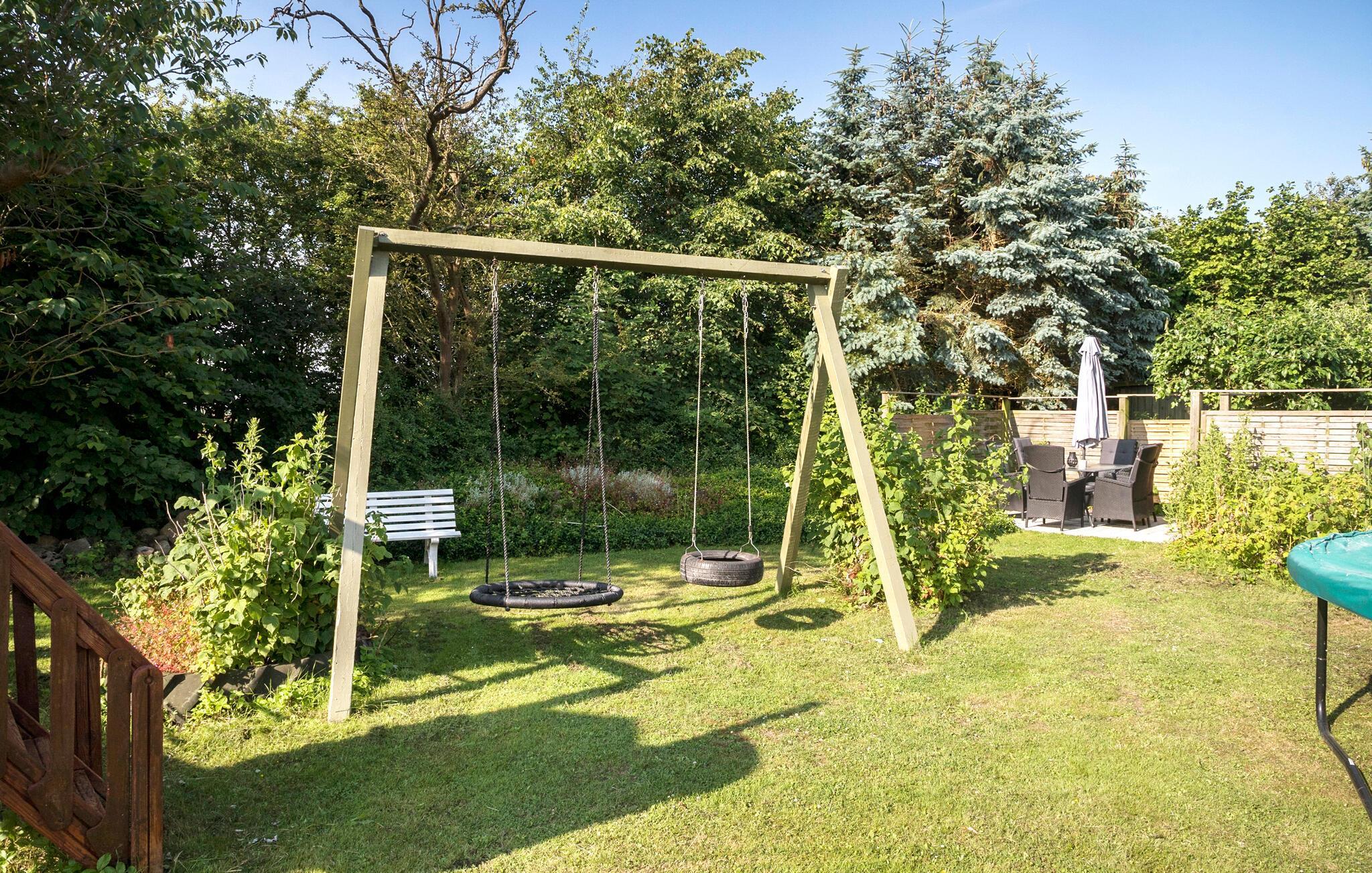 Der Außenbereich ist eine wahre Spielwiese für Groß und Klein. Spielen Sie eine Runde Fußball mit der ganzen Familie und schauen Sie Ihren Kindern beim Spielen auf dem Spielplatz und beim Hüpfen auf dem Trampolin zu.