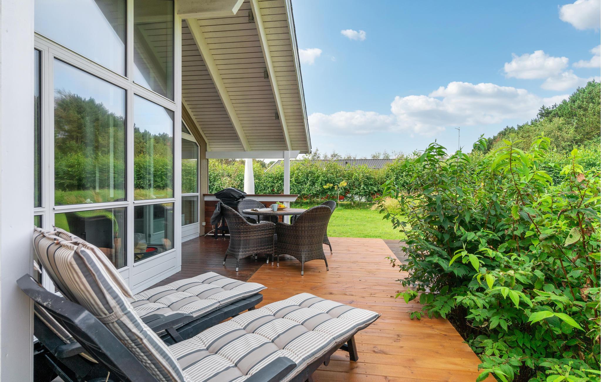 In den hellen Räumen des komfortablen Hauses können Sie mit der ganzen Familie herrlich entspannen. Die Holzverkleidung und moderne Einrichtung sorgt für eine wohnliche Atmosphäre, die Glasfront lässt viel Tageslicht ins Innere des Hauses. Kochen Sie hier mit Blick in den Garten, genießen Sie die Mahlzeiten gemeinsam am langen Esstisch, ebenfalls mit einem wunderbaren Blick in den Garten. Machen Sie es sich später auf dem Sofa bequem, nach einem herrlichen Urlaubstag, den Sie am Strand oder mit einem Ausflug verbracht haben, können Sie abends im Kaminofen anfeuern und noch lange gemütlich zusammensitzen.