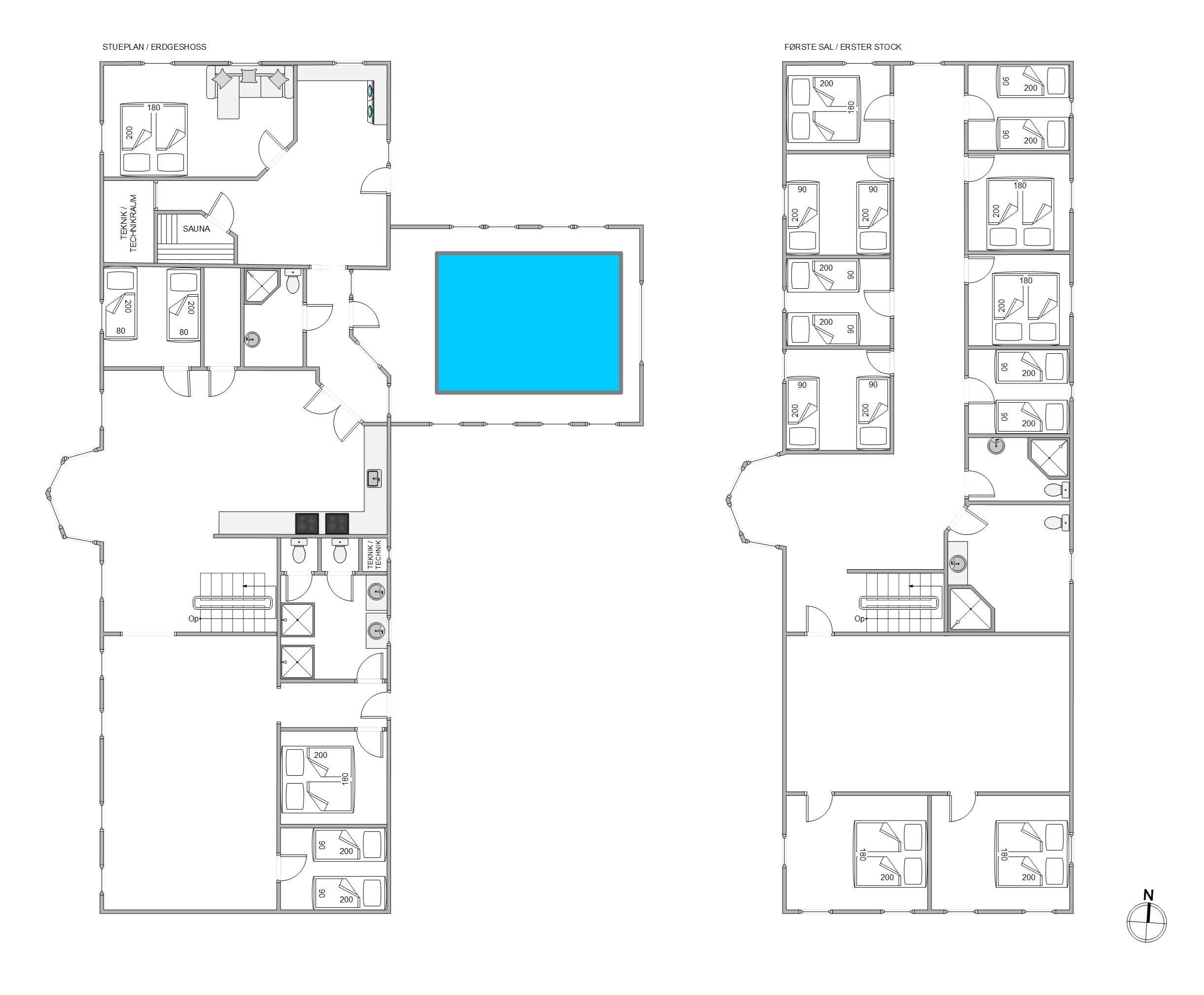 There are 14 bedrooms with comfortable beds – 5 bedrooms with double beds and 9 rooms with single beds (which can be combined into doubles), plus a double sofa bed. The holiday home features 4 bathrooms with 5 shower cubicles and 5 WCs in total. Three of the four bathrooms have floor heating, and three hairdryers are provided.