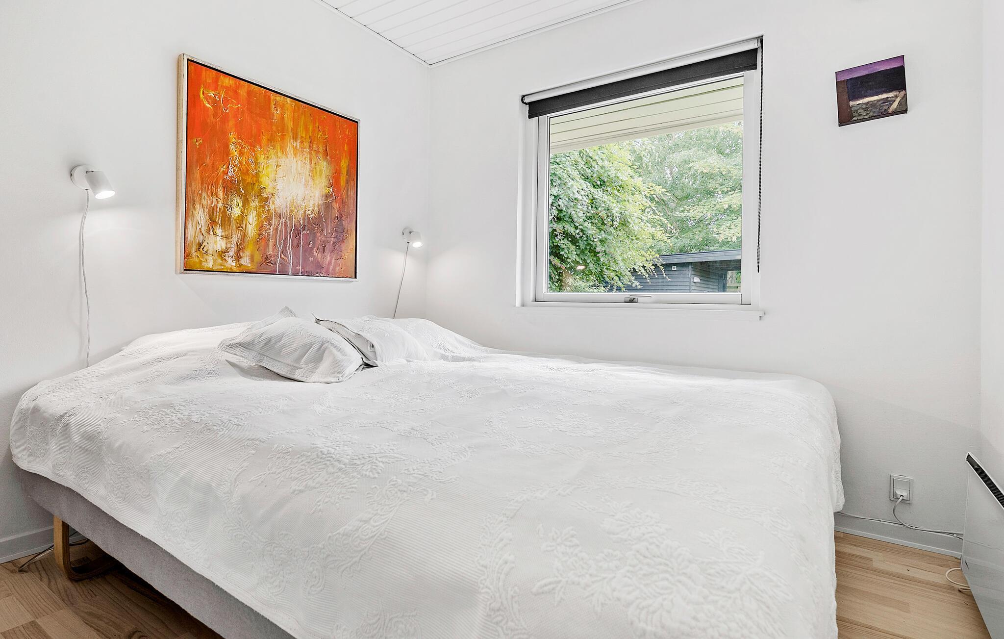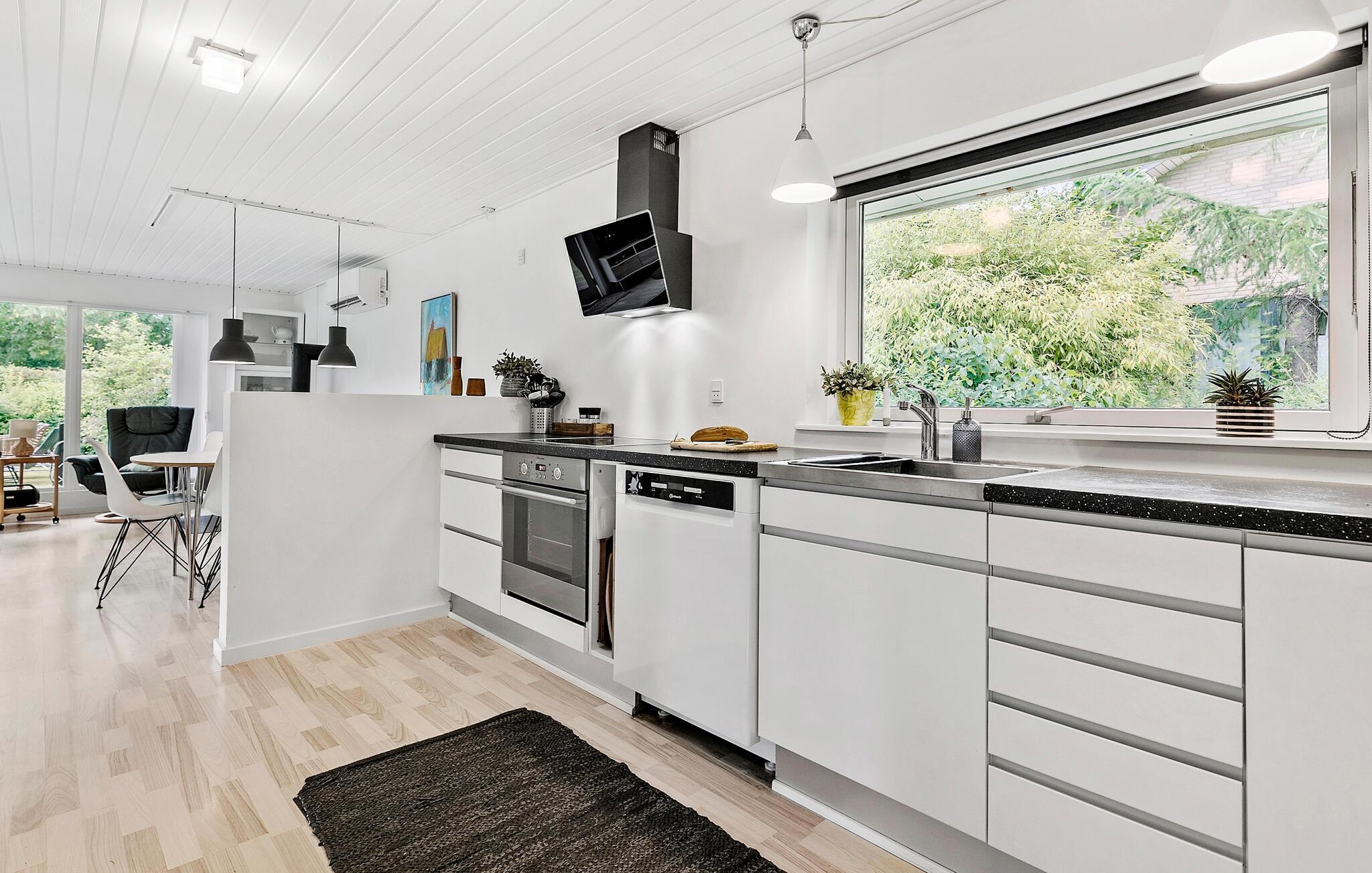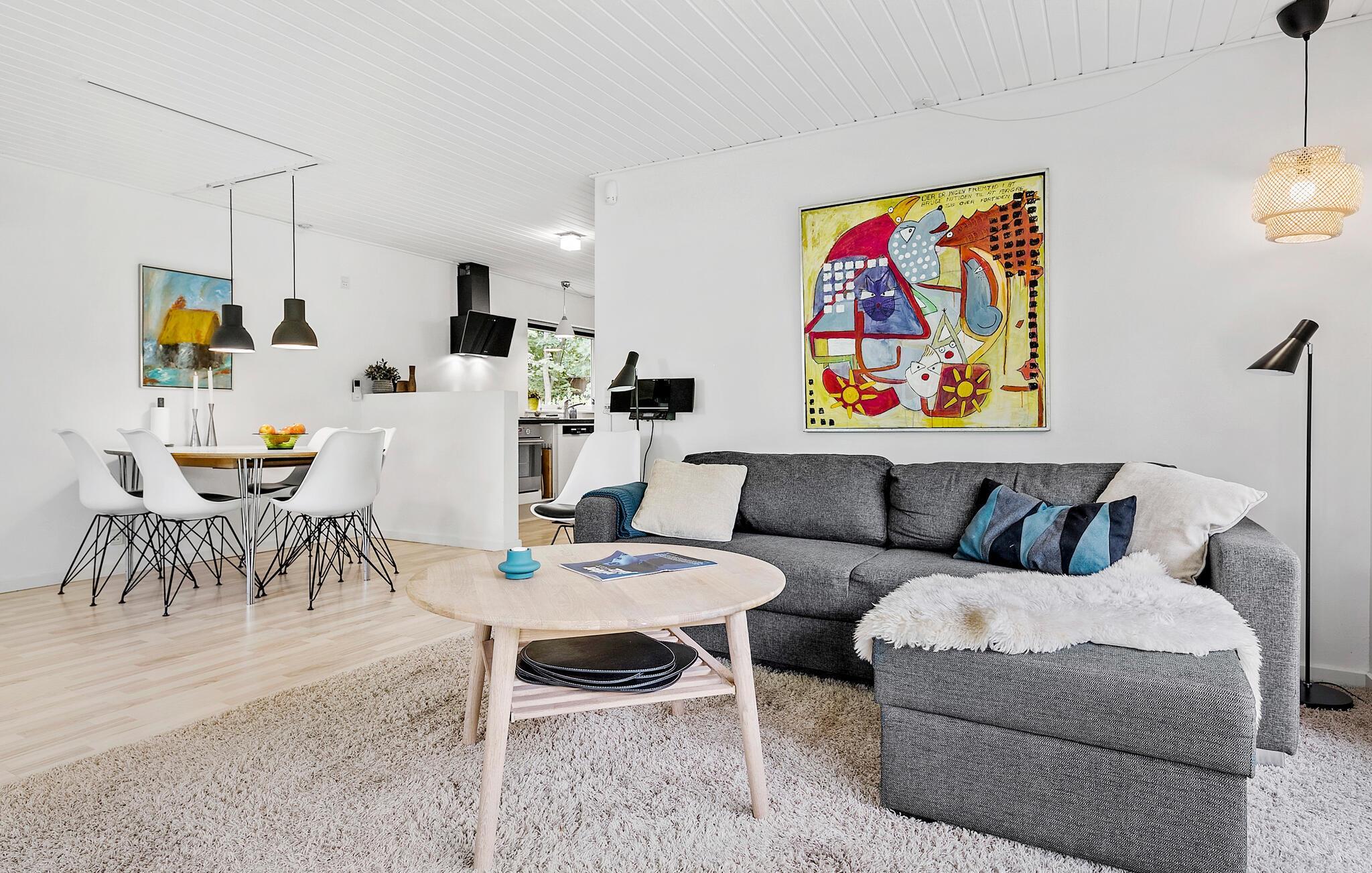 Am Skæring Strand begrüßt Sie dieses charmante Ferienhaus zu einem entspannten Urlaub mit vielen schönen Ausflugsmöglichkeiten. Genießen Sie Ihr Frühstück an dem stilvollen Esstisch und lassen Sie den Blick über den gepflegten Garten schweifen. Die Einrichtung des Innenbereichs ist komfortabel und elegant zugleich. Im lichtdurchfluteten Wohnzimmer können Sie es sich auf dem Sofa gemütlich machen oder in den bequemen Sesseln entspannen. Ein Kamin sorgt für wohlige Wärme an kühleren Abenden.