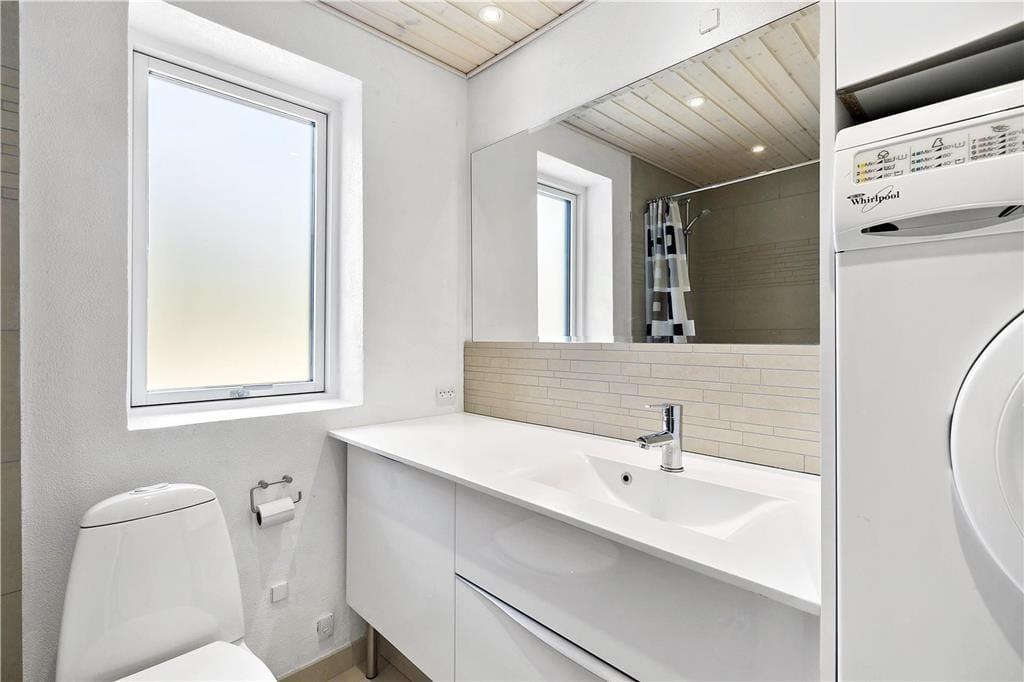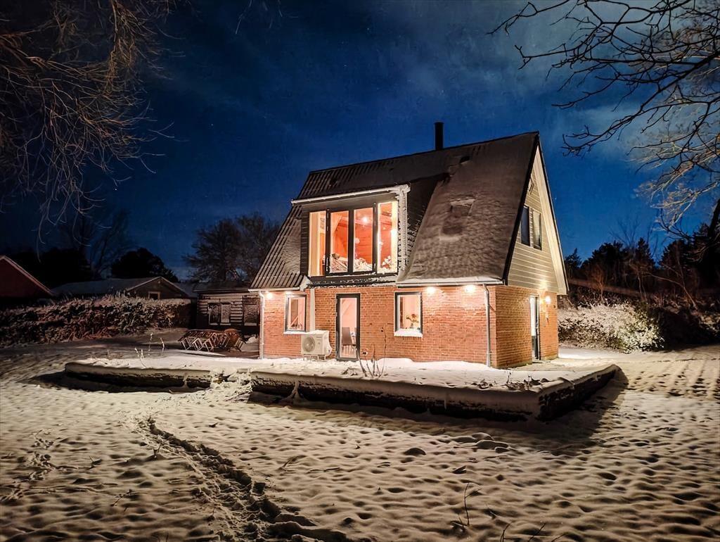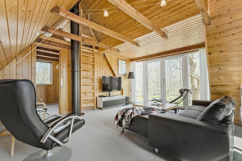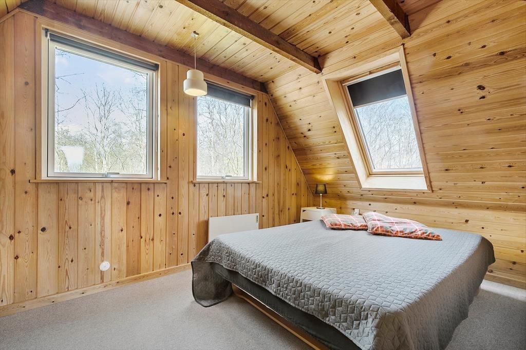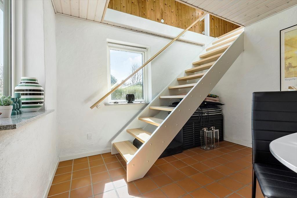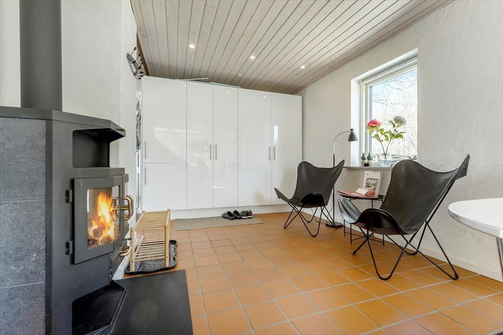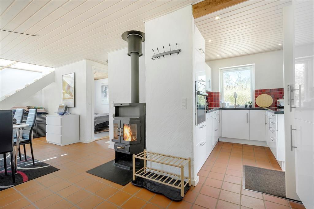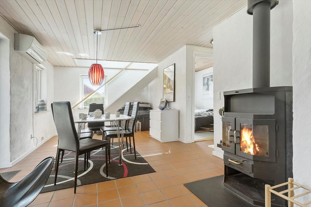 Dieses zweigeschossige, gemütliche Ferienhaus befindet sich in Strandnähe. Das Erdgeschoss begrüßt dich mit einer schönen Küche, die unter anderem einen Geschirrspüler umfasst. Da die Küche offen mit dem Essbereich verbunden ist, genießt du selbst während der Zubereitung der täglichen Mahlzeiten die Nähe und Gesellschaft deiner Lieben, die am Esstisch in gemütlicher Runde beisammensitzen und beispielsweise Gesellschaftsspiele spielen. Unweit des Esstischs sind der behaglich wärmende Kaminofen und zwei Sitzgelegenheiten platziert. Hier kannst du dich in aller Ruhe niederlassen, auf die tanzenden Flammen blicken und die schöne Ferienhausstimmung in vollen Zügen genießen. Das ansprechend renovierte Badezimmer überzeugt mit einer Duschnische. Das Erdgeschoss bietet darüber hinaus eine Fußbodenheizung, eine Waschmaschine und einen Schlafraum mit einem Doppelbett. Eine Holztreppe führt dich vom Essbereich hinauf in das obere Stockwerk. Hier nehmen dich ein gemütlicher Wohnraum mit einem Fernseher und ein großer Schlafraum mit einem Doppelbett in Empfang. Zwei weitere Schlafplätze stehen auf dem gemütlichen Schlafboden bereit. Letzterer wird sich insbesondere bei deinen Kindern großer Beliebtheit erfreuen. Stundenland werden die Jüngsten hier Höhlen bauen und spielen. Der Fernseher des Wohnraums ist mit Chromecast ausgerüstet, sodass du mittels deines Smartphones oder deines Tabletts deine privat abonnierten Streamingdienste nutzen kannst.