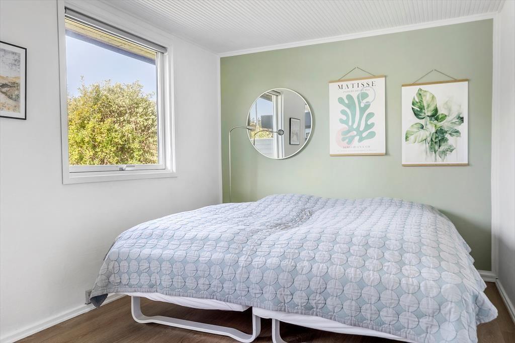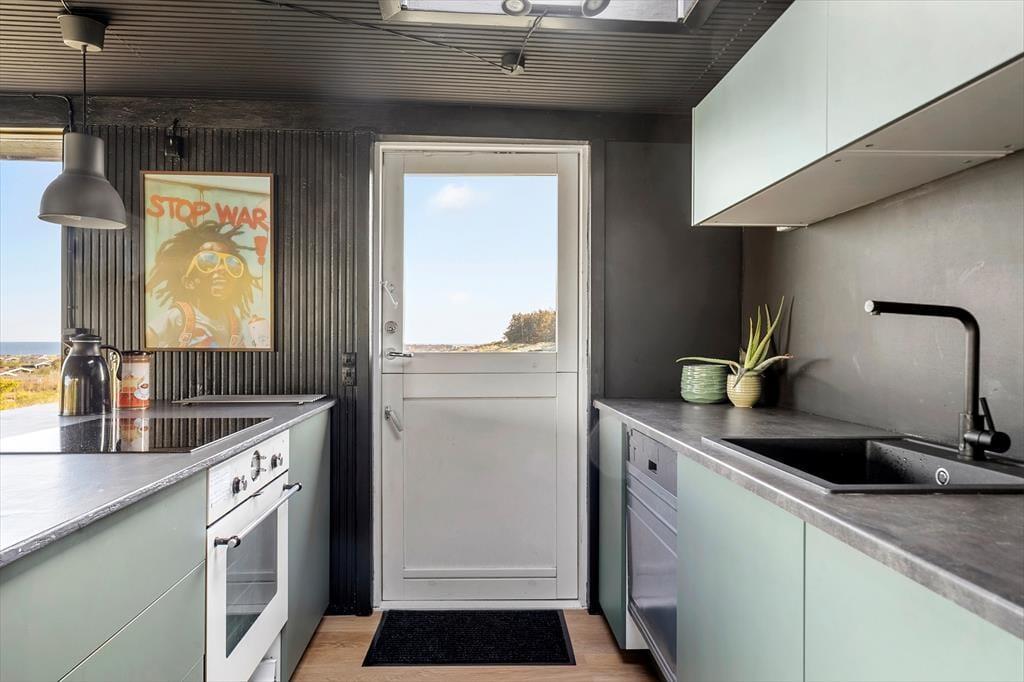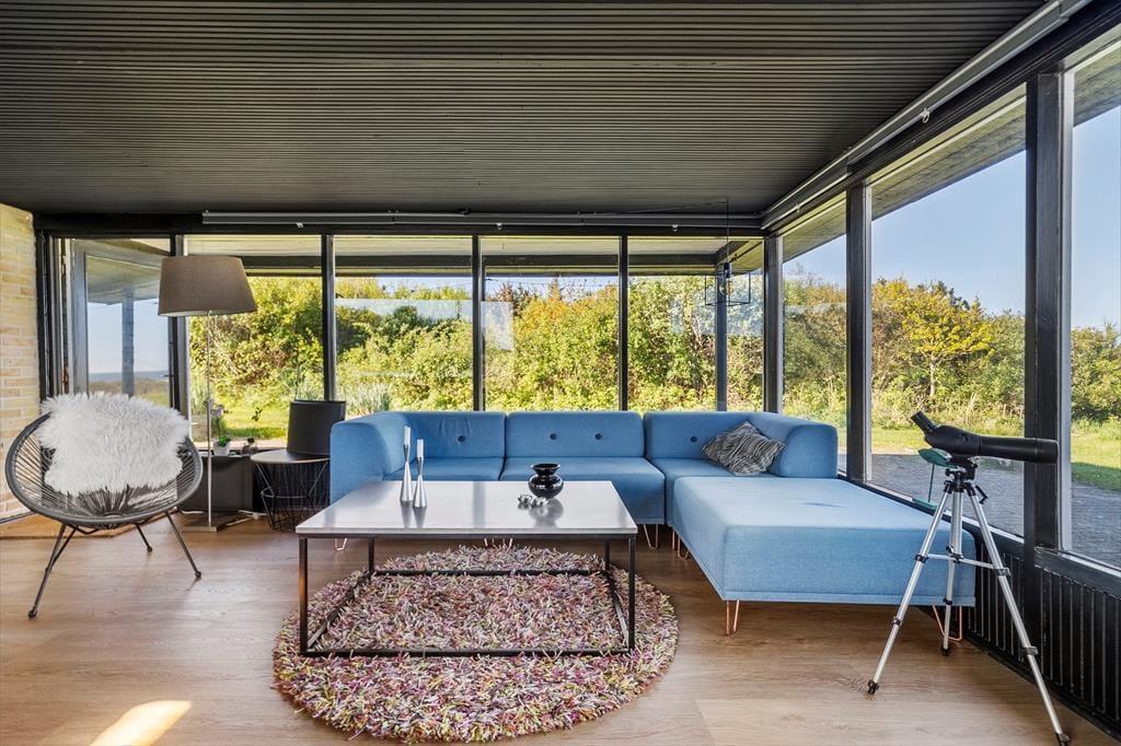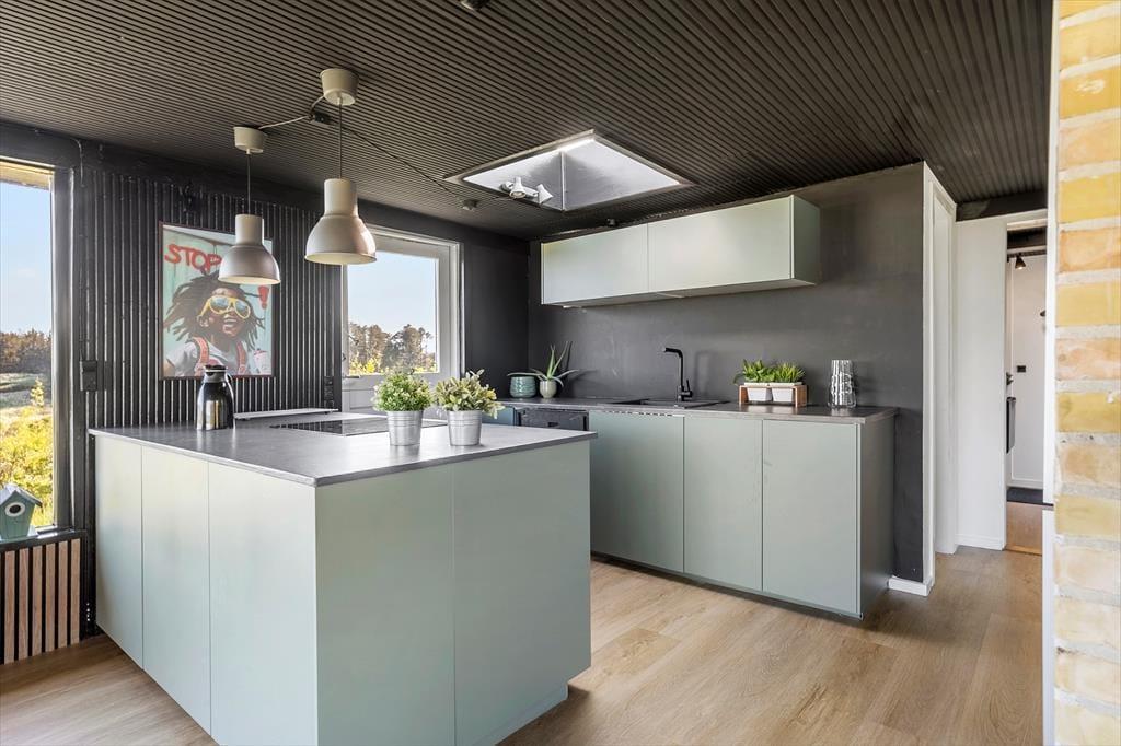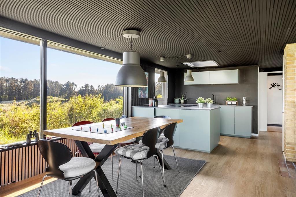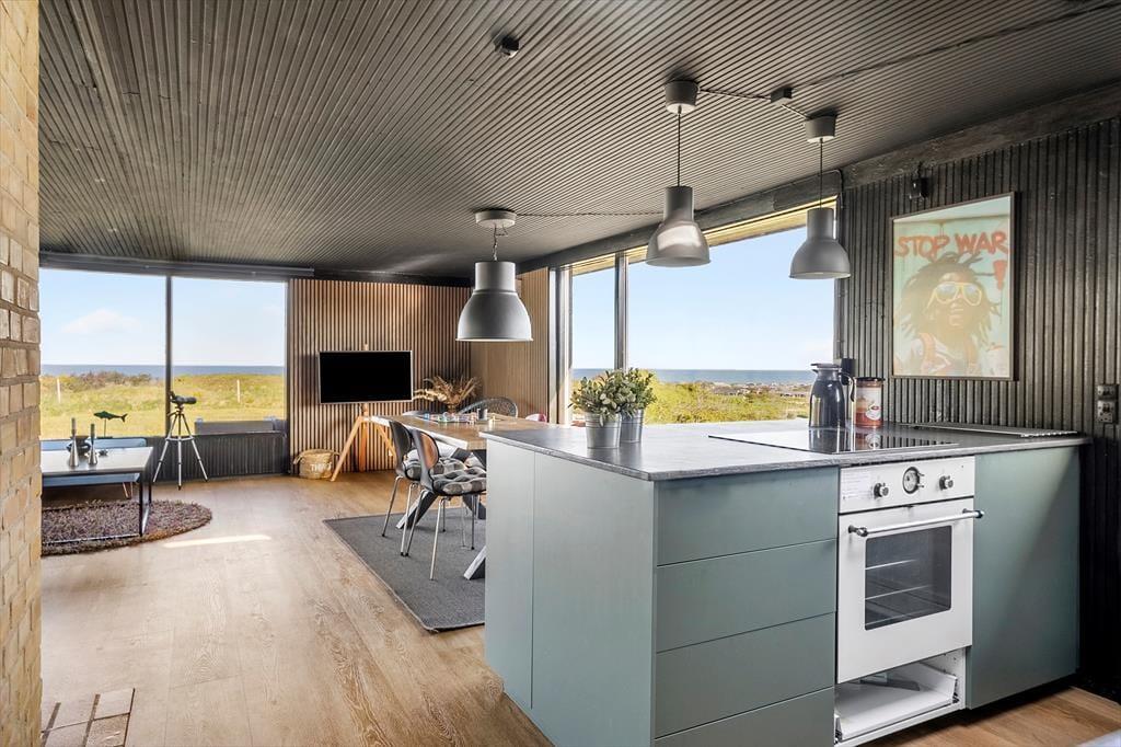 Das Ferienhaus steht hier seit 1965, und obwohl es laufend modernisiert wurde, sieht man ihm die jahrelange Nutzung an. Dennoch ist klar zu erkennen, dass sich die heutigen Eigentümer liebevoll darum kümmern – die Einrichtung ist modern und geschmackvoll. Große Fensterfronten tragen ebenfalls zum luftigen Raumgefühl bei, denn im Wohnbereich fällt das Licht aus drei Himmelsrichtungen ein – gleichzeitig eröffnet sich ein fantastischer Meerblick, egal ob Sie es sich auf dem Sofa gemütlich machen, am Esstisch sitzen oder im offenen Küchenbereich kochen. Bei klarem Wetter reicht der Blick von Hirtshals Fyr bis Rubjerg Knude – und wenn draußen der Wind tost, können Sie den Kaminofen anheizen und die Wärme genießen, während Sie den Wellen in der Bucht von Skallerup zusehen.