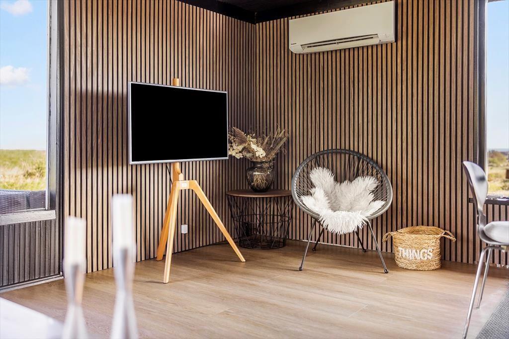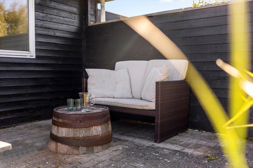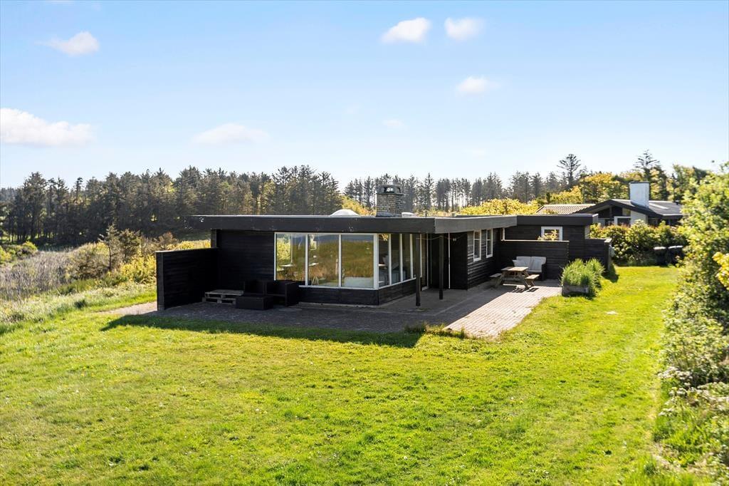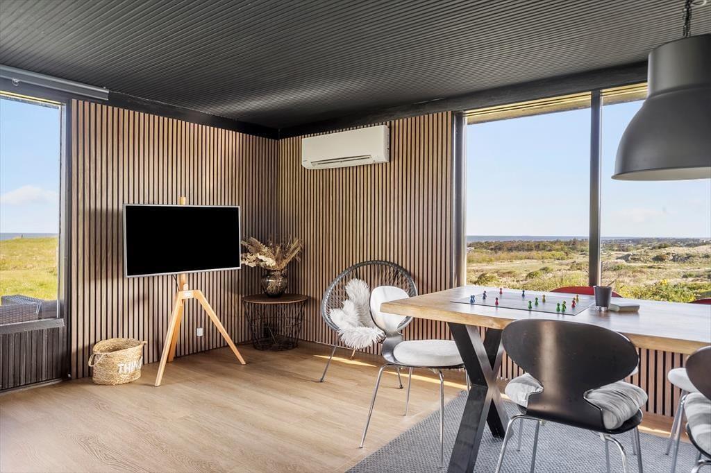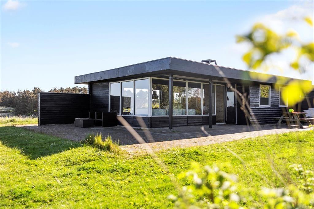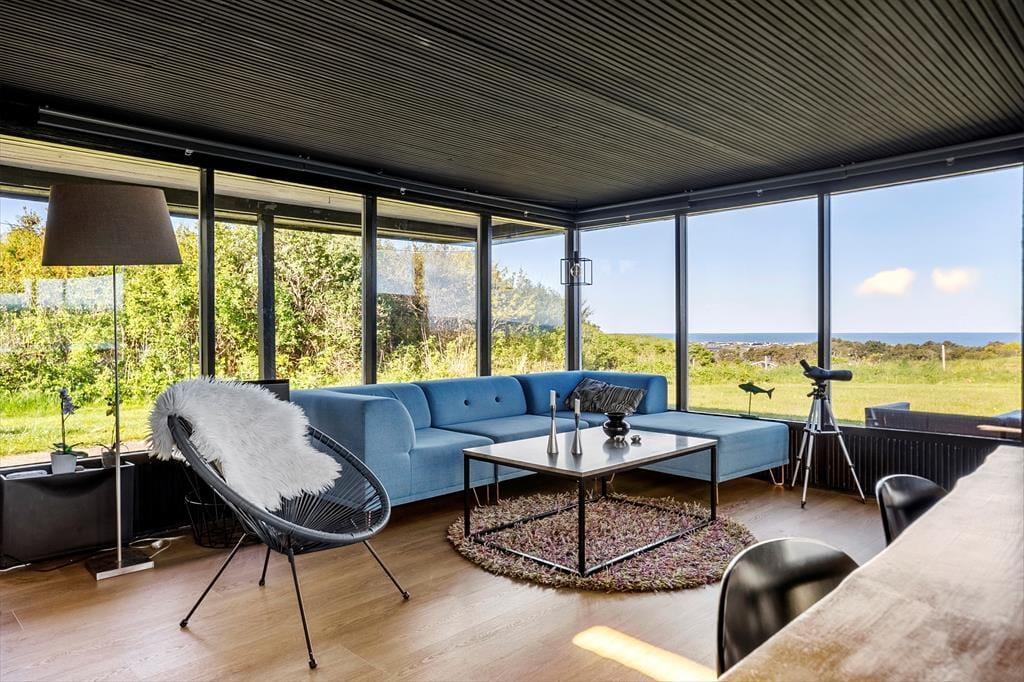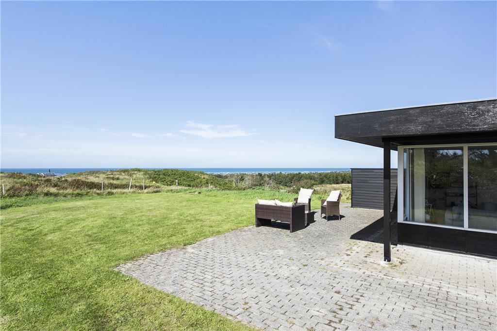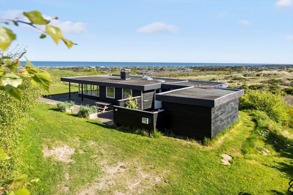 Dieses Ferienhaus genießt eine herrlich erhöhte Lage bei Skallerup Klit: Es liegt ungestört am Ende eines kleinen Weges, und vom Wohnzimmer sowie von der Terrasse aus können Sie über die wilde Küstenlandschaft und die Nordsee blicken.