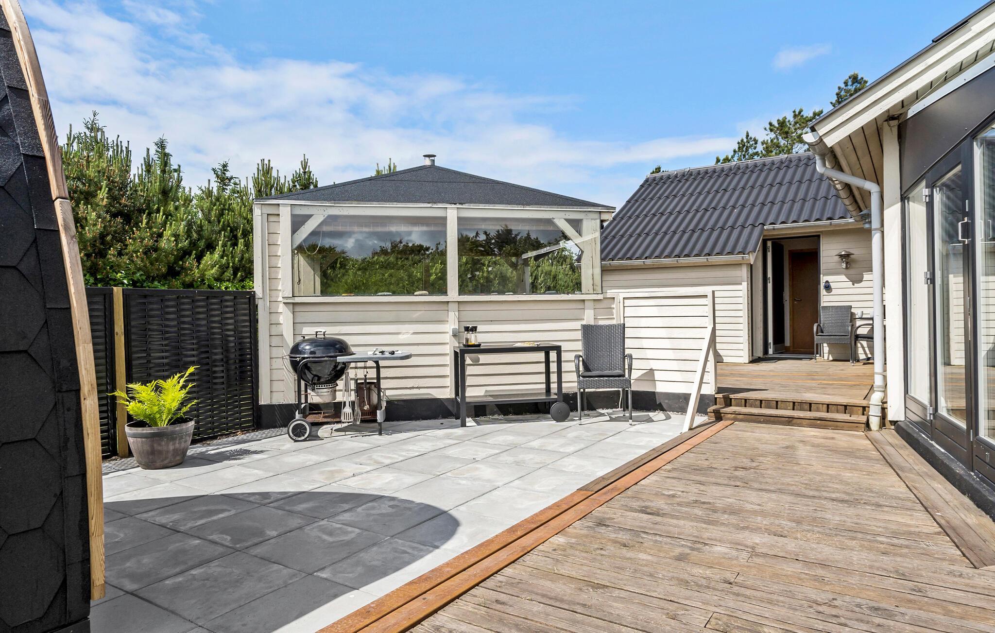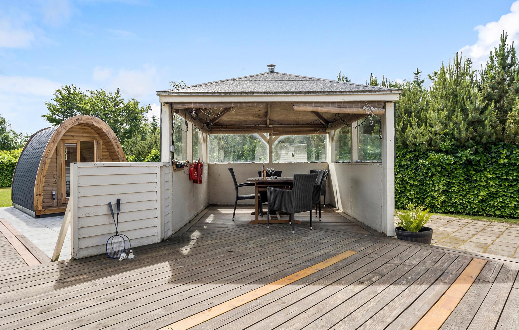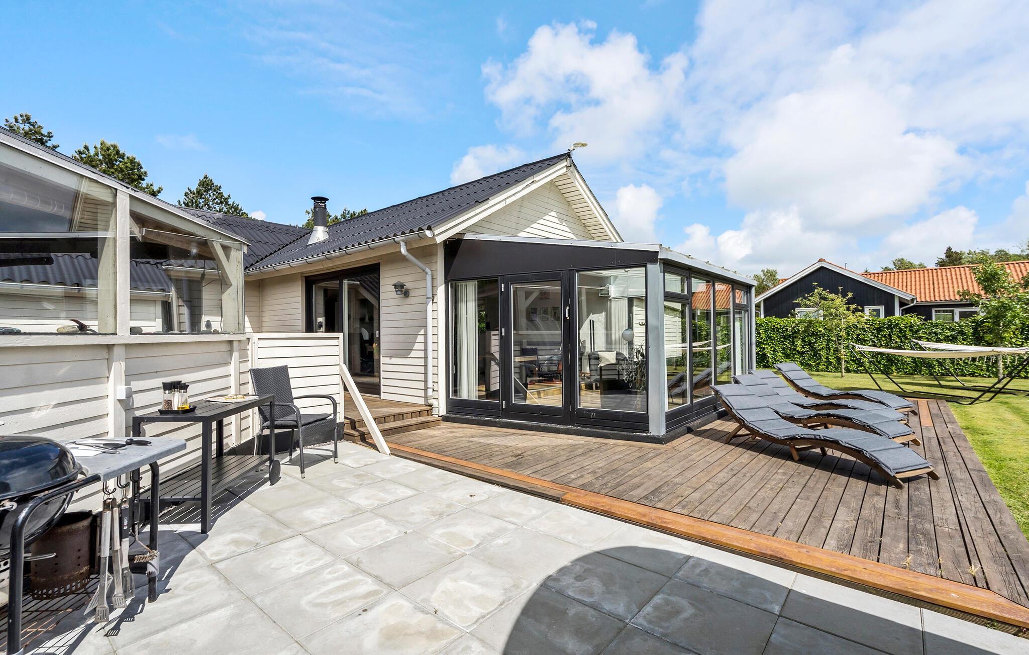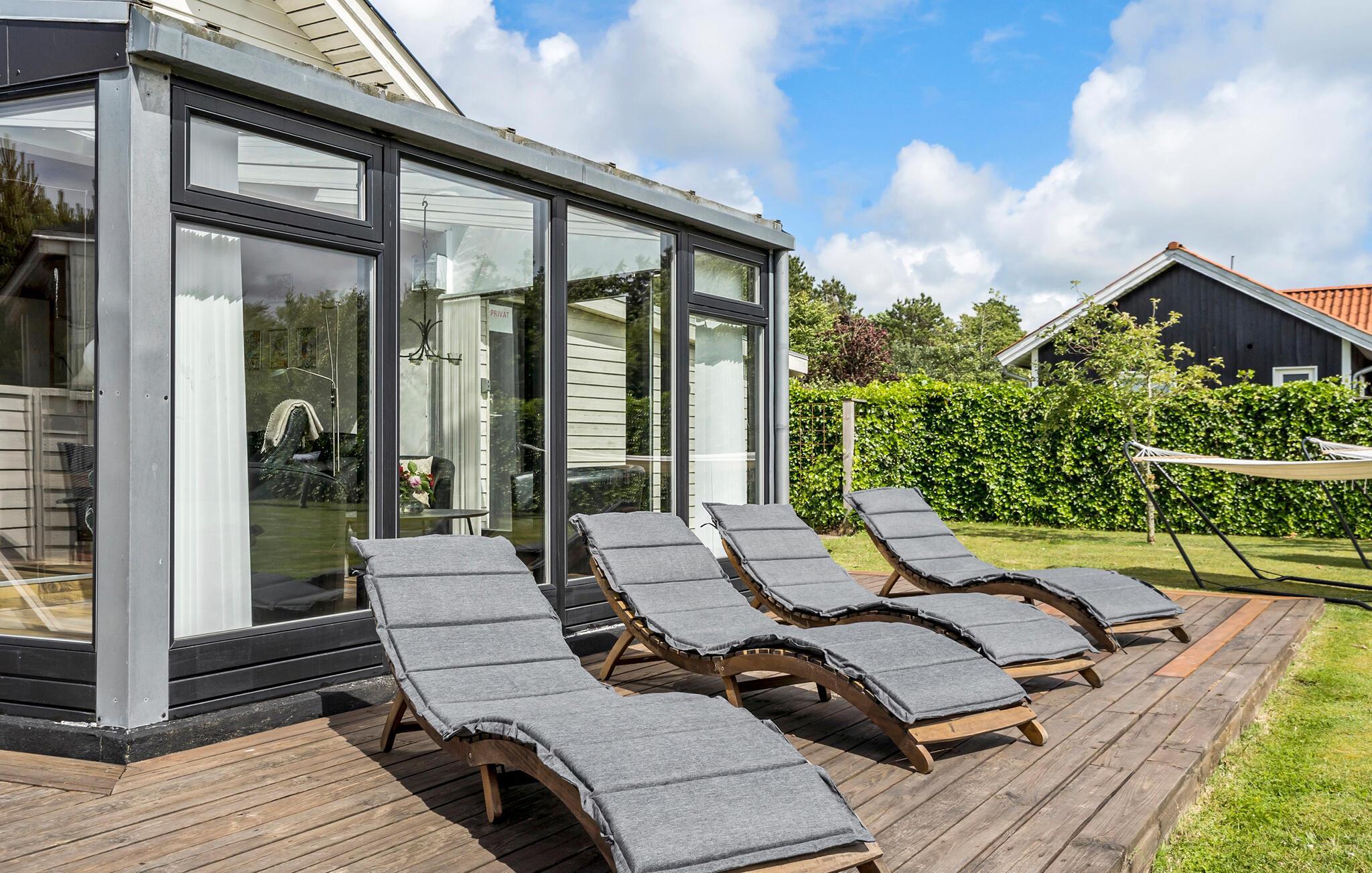 Entspannen Sie auf der großzügigen Terrasse Ihres Ferienhauses, die mit bequemen Liegestühlen ausgestattet ist. Speisen können Sie auf dem überdachten Teil der Terrasse.