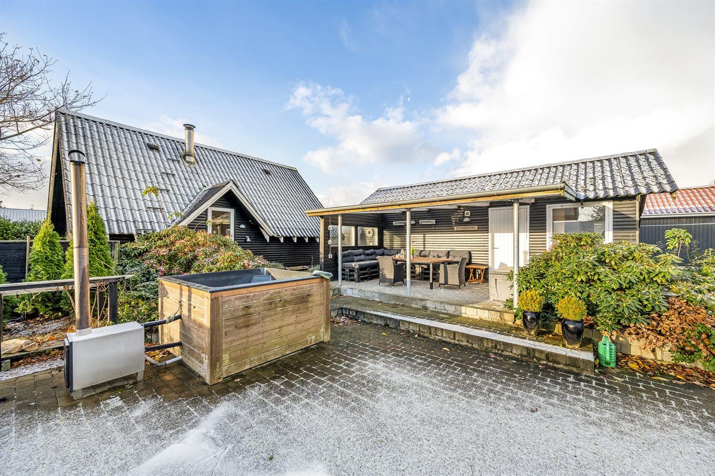 The holiday home is situated on a 801 m² natural site. Situated 150 m from inlet. Nearest shop is 7500 m away. A terrace belong to the holiday home. Furthermore the house has a covered terrace. Situated 500 m from a playground. Parking place by the holiday home.