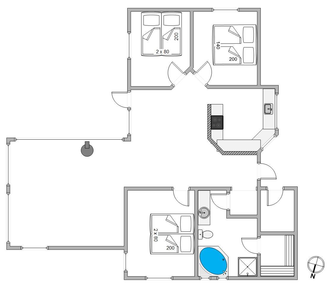 The open-plan kitchen, dining and living area forms the heart of the holiday home. The well-equipped kitchen is perfect for cooking together, and afterwards you can relax in the living area. Here you'll also find the wood-burning stove, providing warmth during the cooler months and creating a perfect holiday atmosphere.