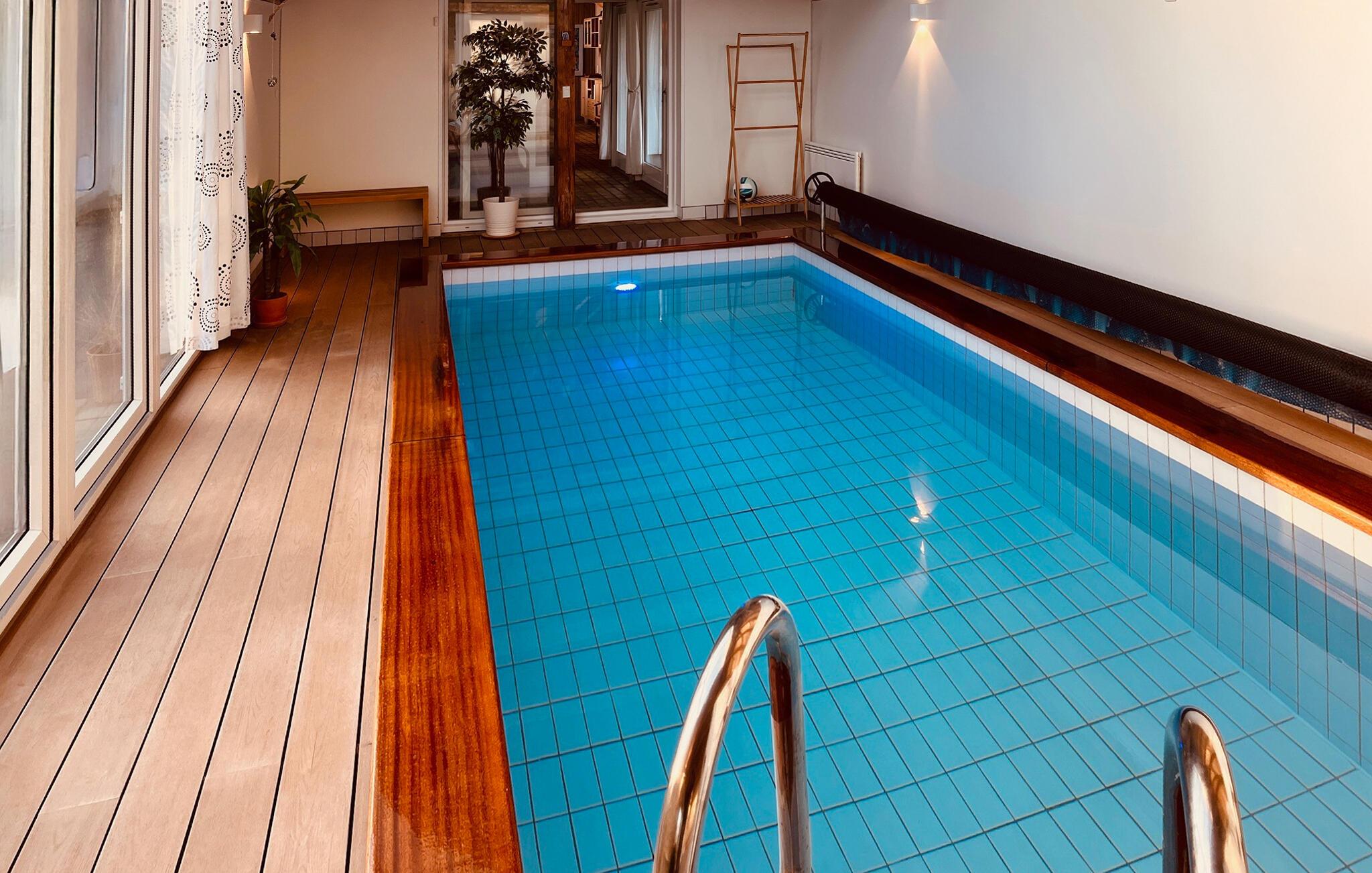Willkommen in diesem großzügigen Ferienhaus, in dem Sie mit Ihren Liebsten ein gemütlicher Wellness-Urlaub erwartet. Ziehen Sie Ihre Bahnen im warmen Innenpool und gönnen Sie sich wohltuende Momente in der Sauna oder im Whirlpool. Freuen Sie sich auf gemeinsames Kochen in der Wohnküche und gesellige Mahlzeiten mit Blick ins Grüne. Abends lockt das einladende Wohnzimmer, um einen Film zu schauen oder gute Gespräche bei einem Glas Wein zu genießen.