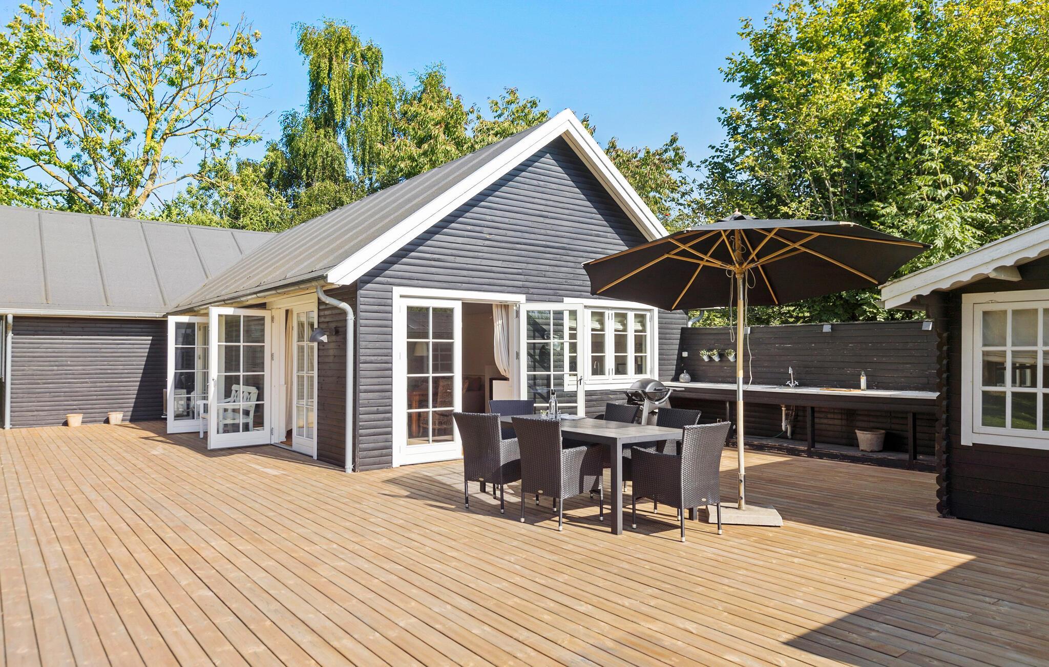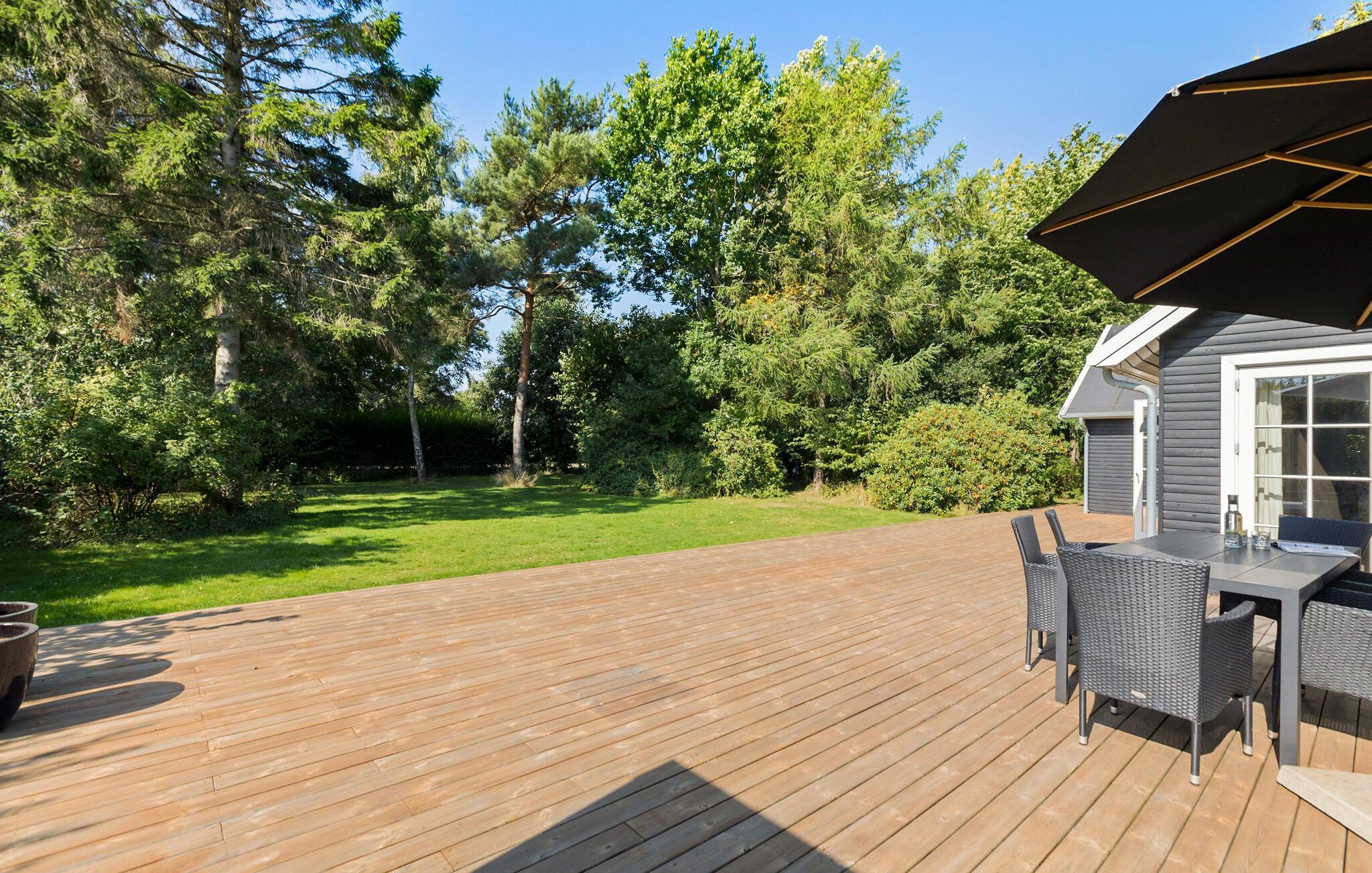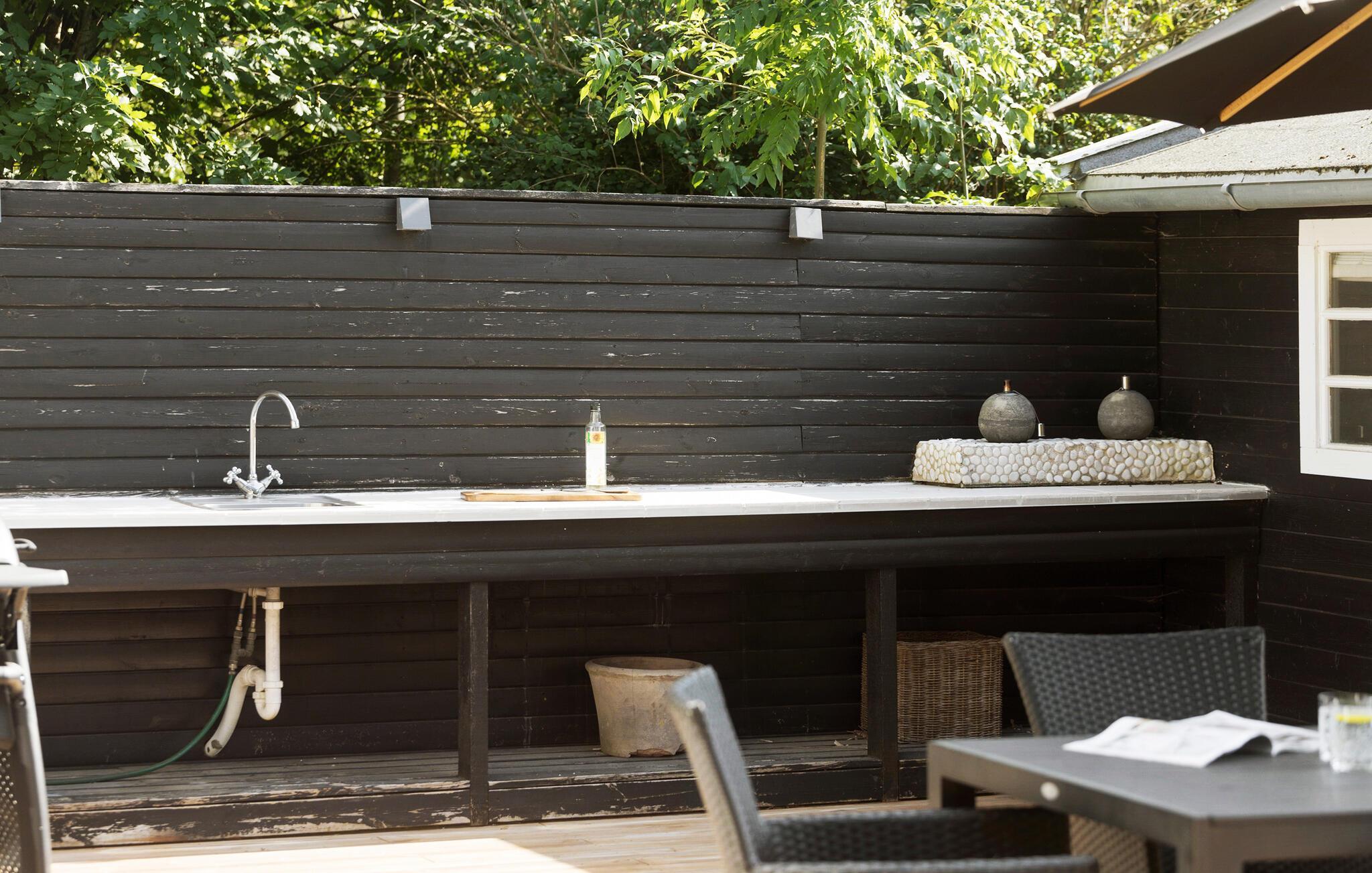 Genießen Sie aber auch die weitläufige Holzterrasse mit toller Außenküche, die Ihnen sowohl kaltes als auch warmes Wasser bietet. Zaubern Sie leckere Gerichte im Freien, kommen an der Tafel zusammen und schauen Ihren Kindern beim Spielen im Garten zu.