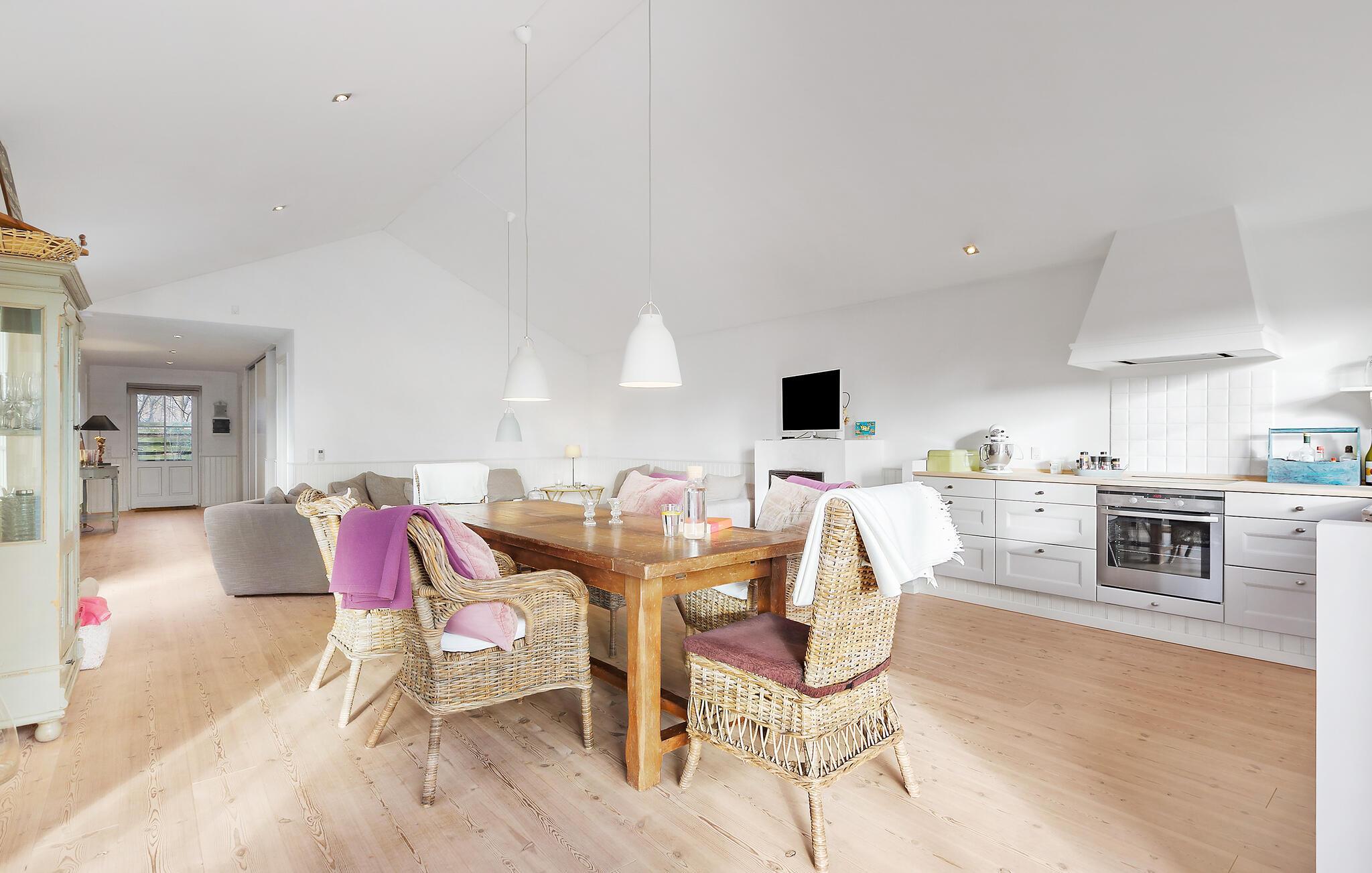 Freuen Sie sich auf Ihren Urlaub in diesem einladenden und stilvollen Ferienhaus. Dank der hochwertigen Einrichtung und Ausstattung wird der offene und helle Wohnraum der Treffpunkt der ganzen Familie, nachdem Sie erholsame Nächte in den gemütlichen Schlafzimmern verbracht haben. Während die Erwachsenen die Schlafzimmer bevorzugen, werden Ihre Kinder mit Freude die steile Treppe hinaufklettern und Ihr Nachtlage auf dem Dachboden aufschlagen. Gemeinsames Kochen, Spielen am Esstisch oder das Relaxen auf dem Sofa, begleitet von einem knisternden Kaminfeuer, sind die besten Bedingungen, die Ihren Urlaub zu einem Erfolg machen.