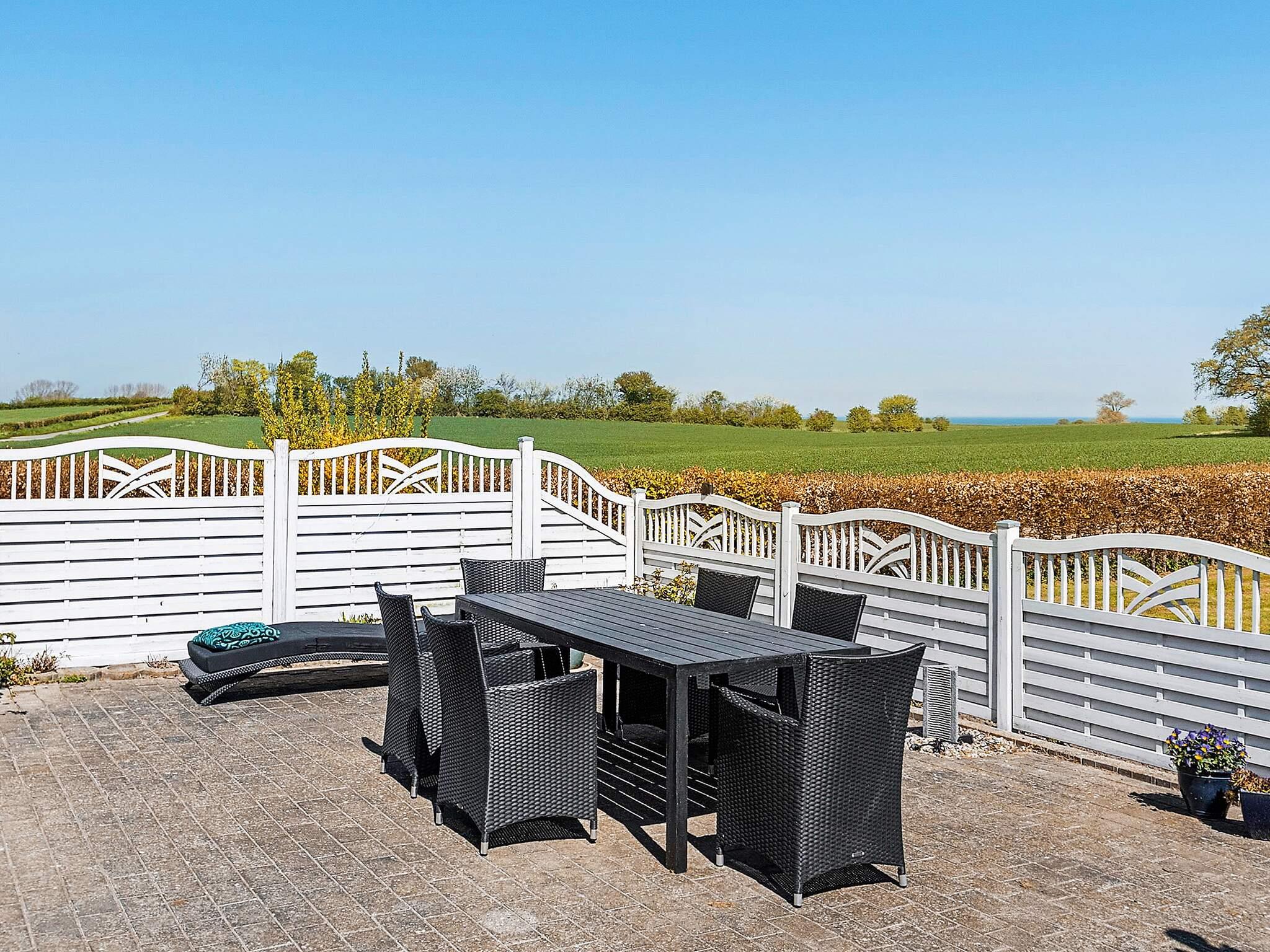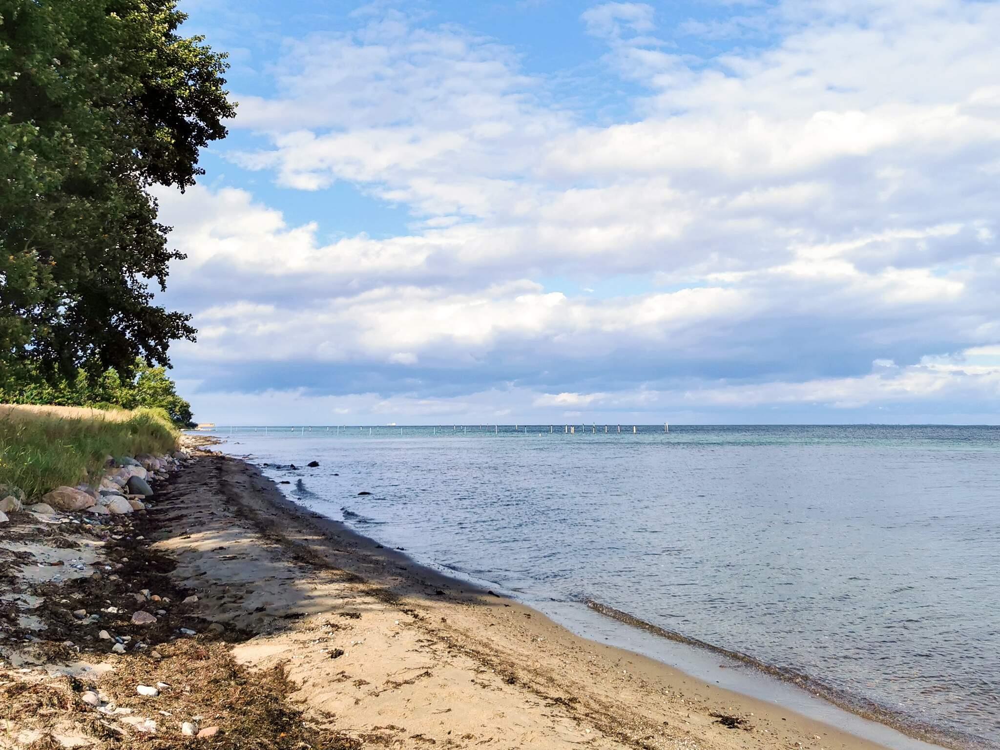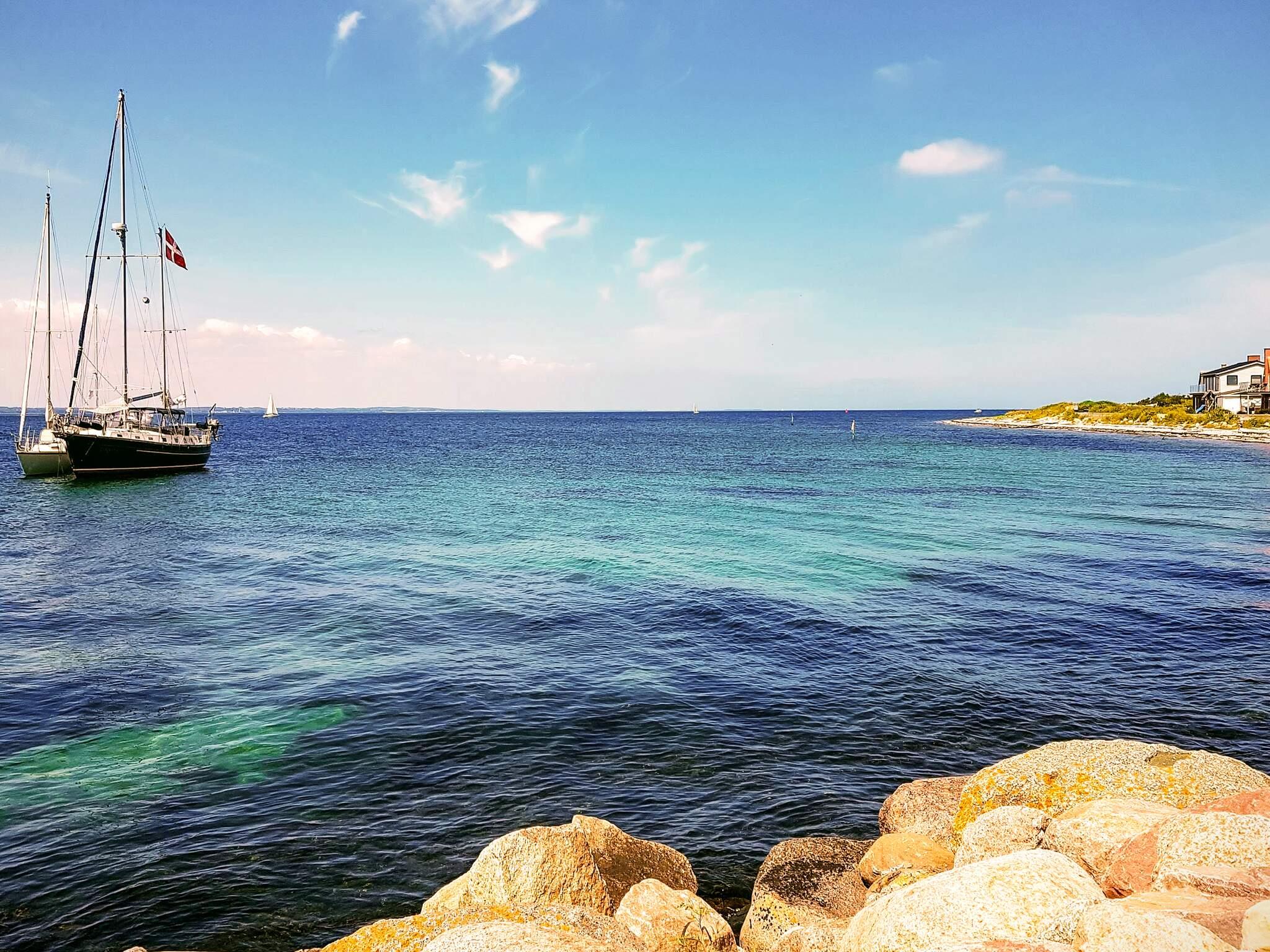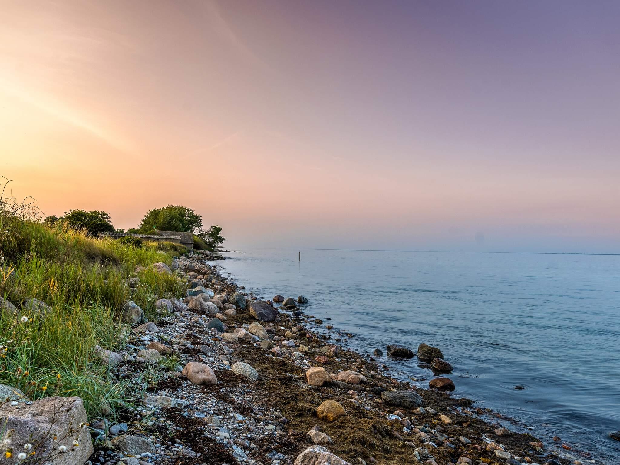 Ferienhaus in ländlicher Umgebung bei Snøde, mit schönem Blick über Felder und Wiesen und zur Meeresenge Langelandsbæltet an Horizont.
