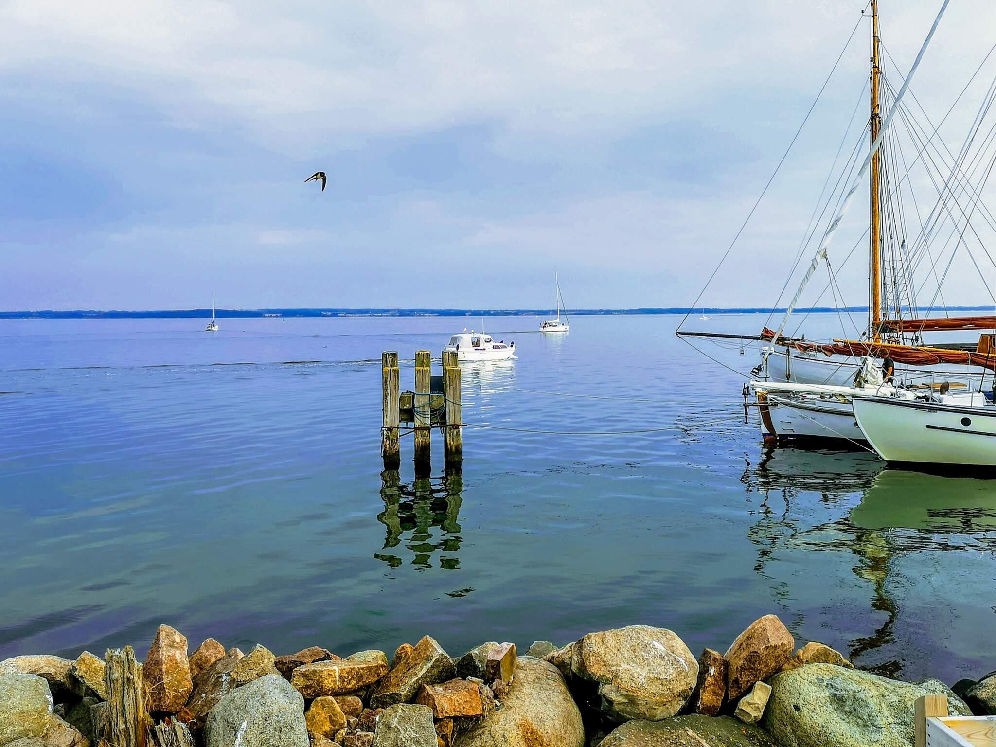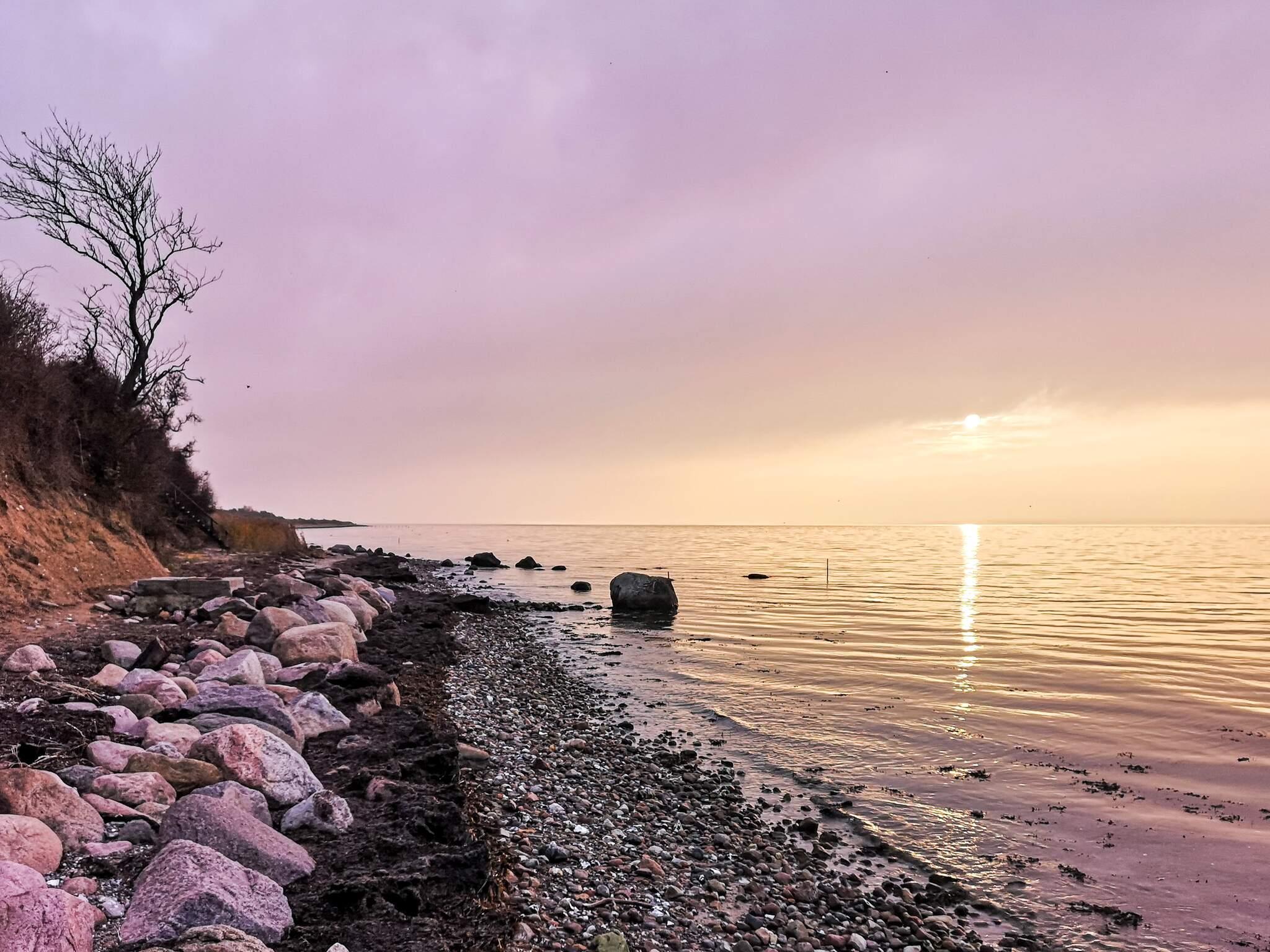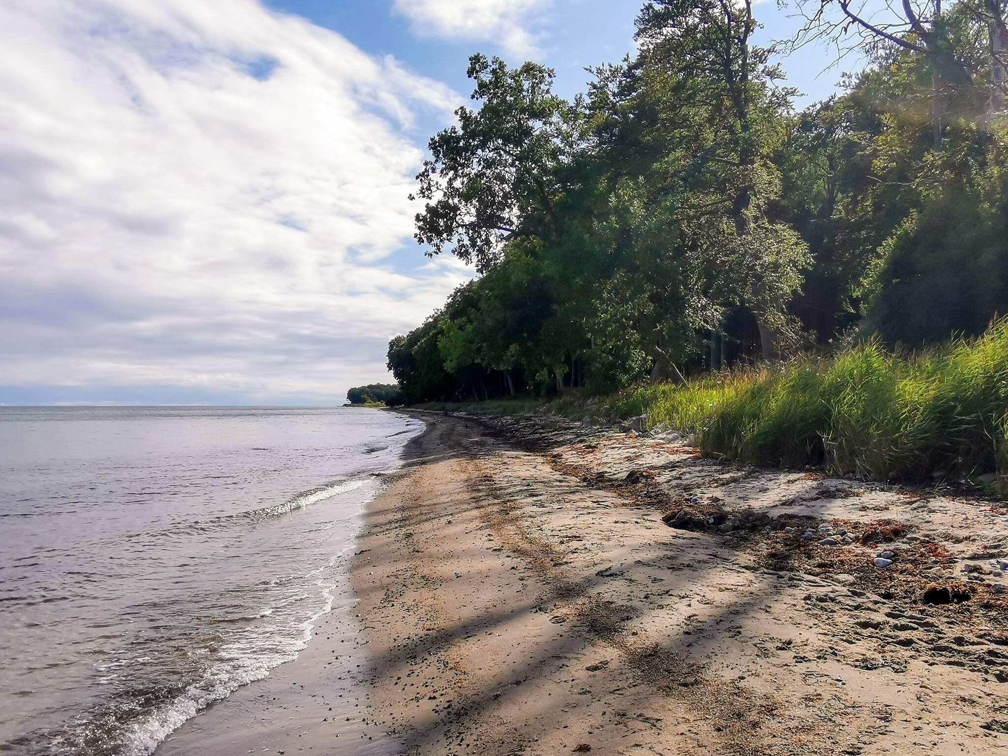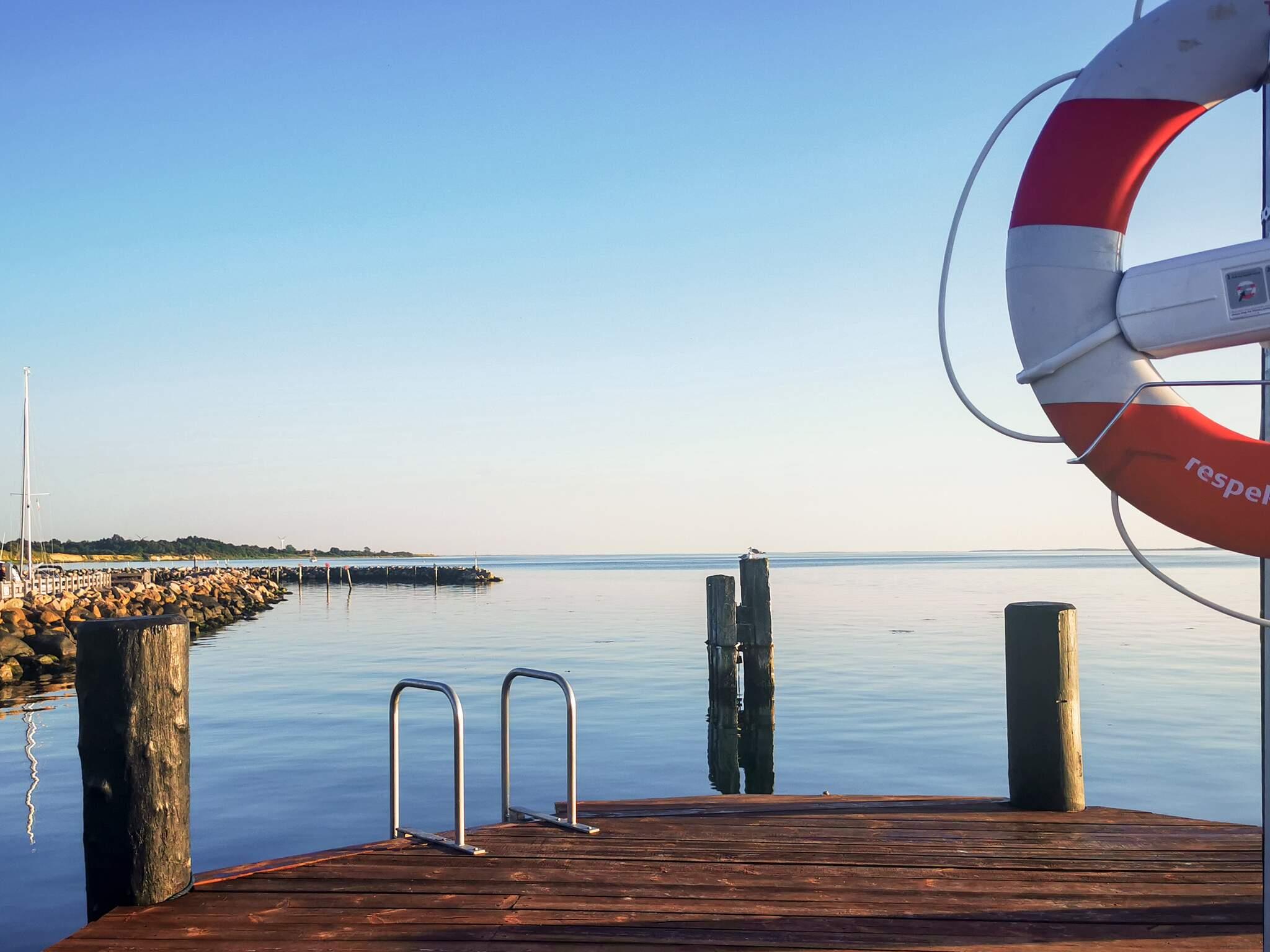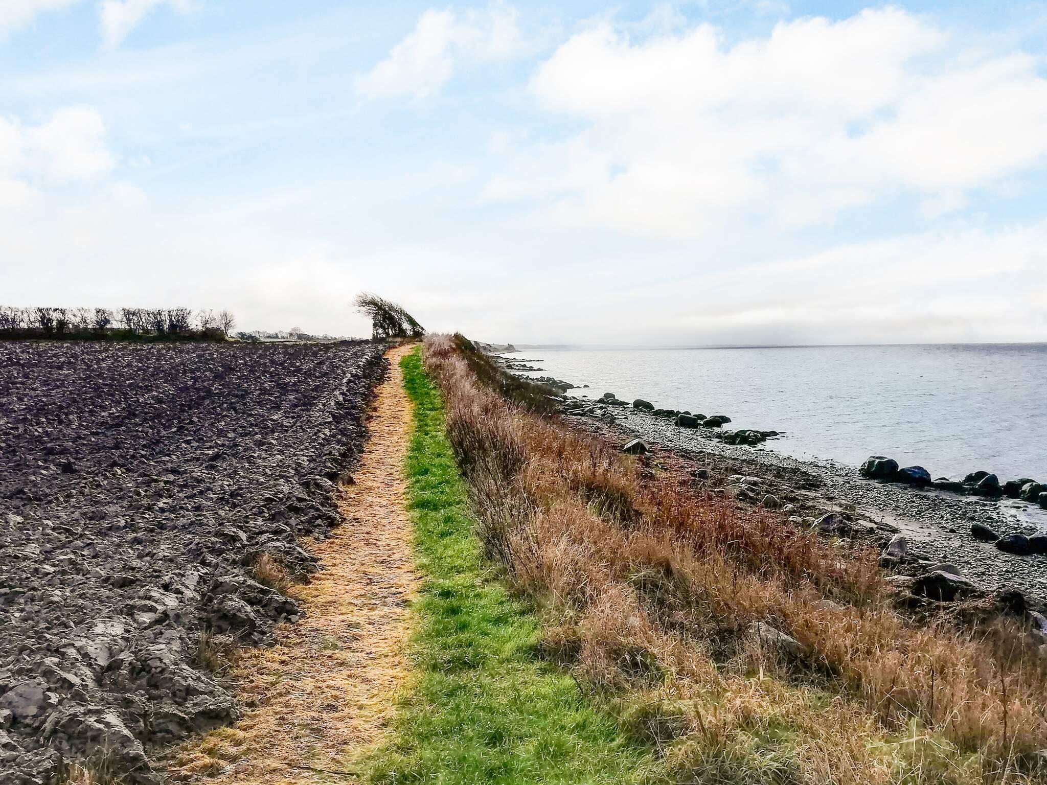 Ferienhaus in ländlicher Umgebung bei Snøde, mit schönem Blick über Felder und Wiesen und zur Meeresenge Langelandsbæltet an Horizont.