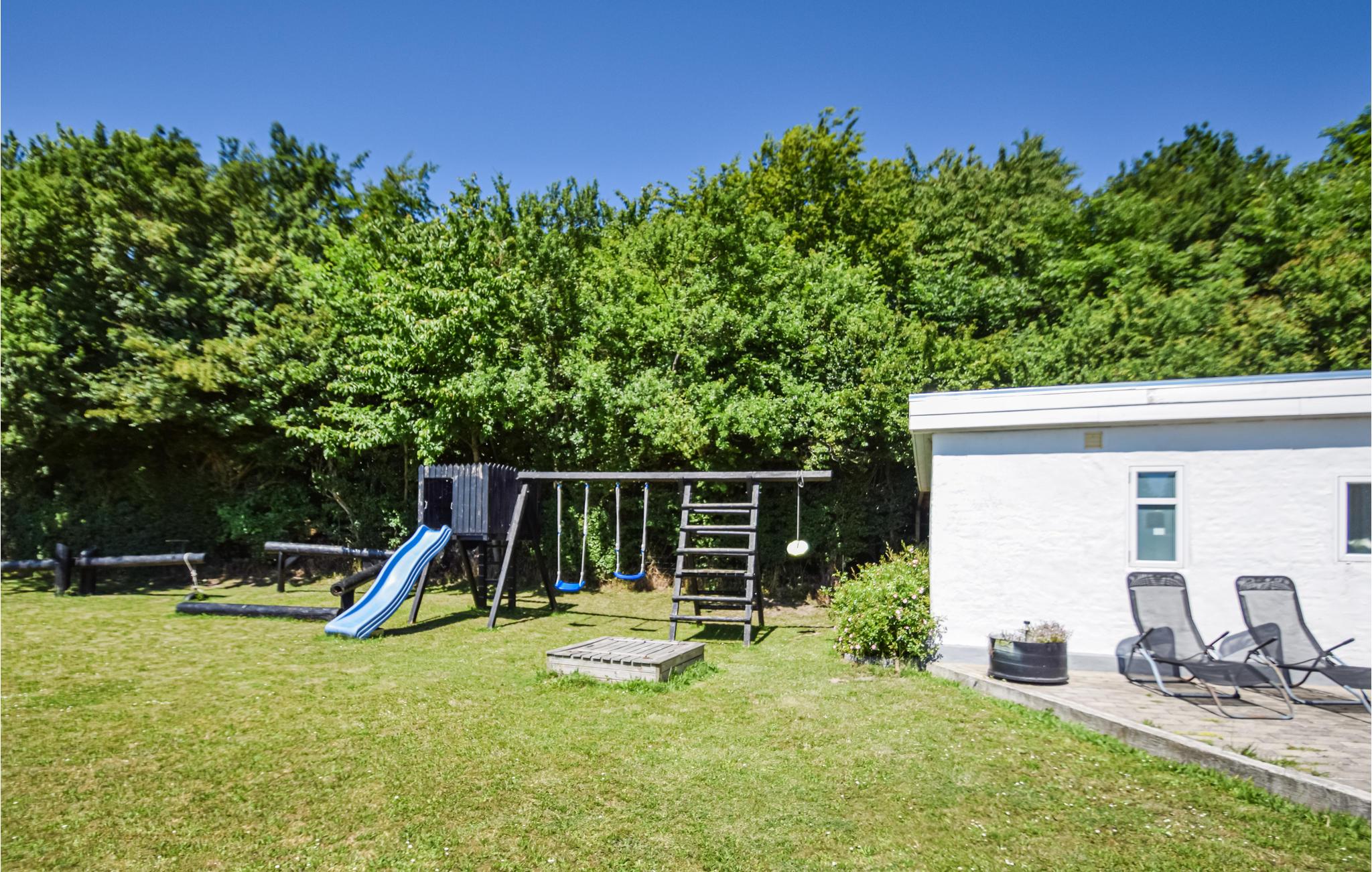 Gemütliches und gepflegtes Ferienhaus an einer Landstraße auf Nordlangeland, gut einen Kilometer von der Stadt Snøde entfernt. Der große Garten bietet mehrere Spielmöglichkeiten für Kinder und ist mit einer Hecke auf der einen und Bäumen auf der anderen Seite abgeschlossen.