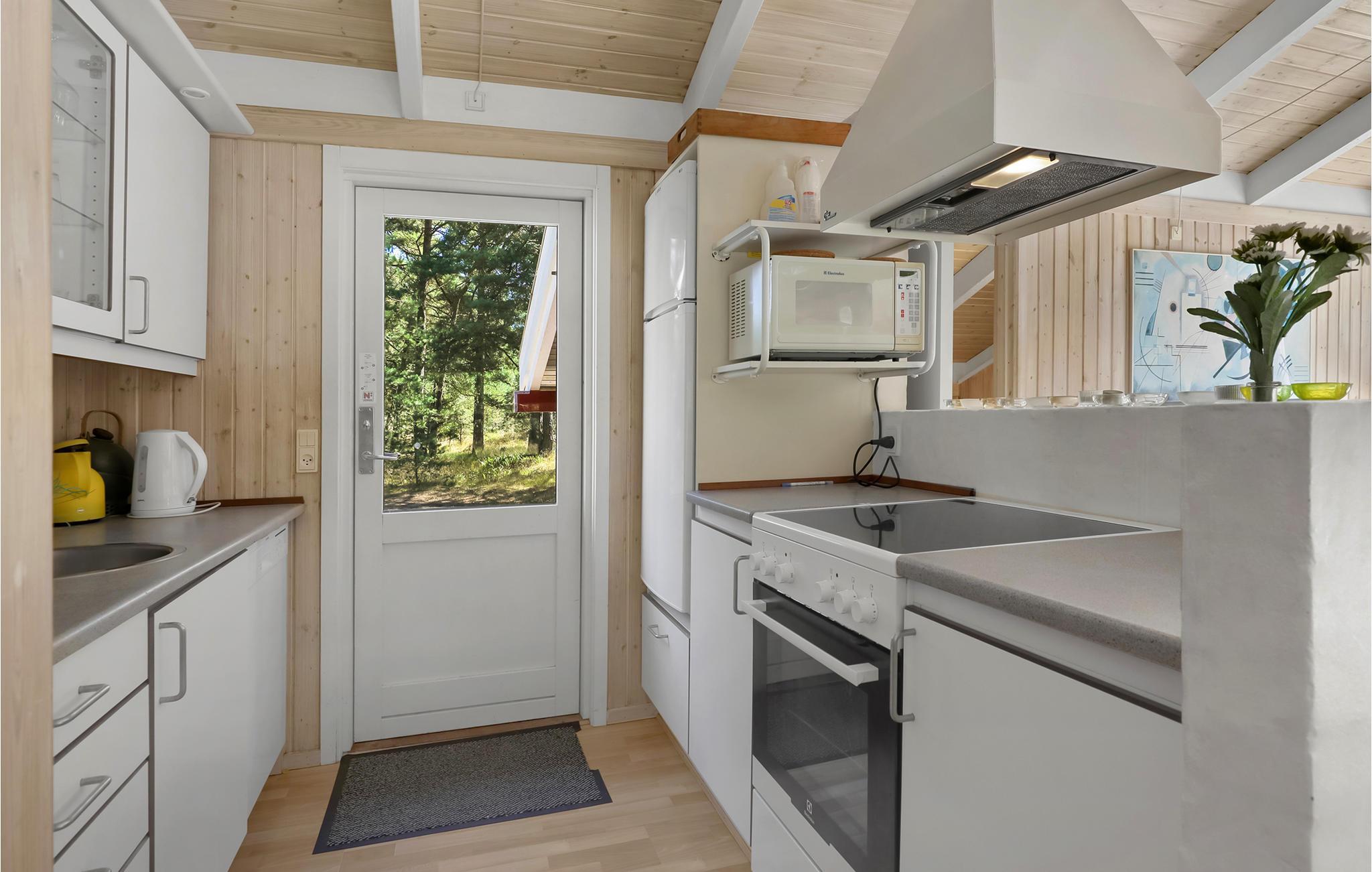 Es besteht aus erstklassigen Materialien, die zu einer einzigartigen Urlaubsatmosphäre beitragen. Im gemütlichen Wohnzimmer mit Holzofen befindet sich eine große Fensterfläche mit Zugang zu einer schönen, großen Holzterrasse, auf der Sie die frische Luft und die langen Sommerabende genießen können. In der offenen Küche gibt es alle nötigen Utensilien und Geröte, sodass Sie sich während des Aufenthalts um nichts kümmern müssen. Es gibt auch zwei Badezimmer, von denen eines über einen Whirlpool und eine Sauna verfügt.