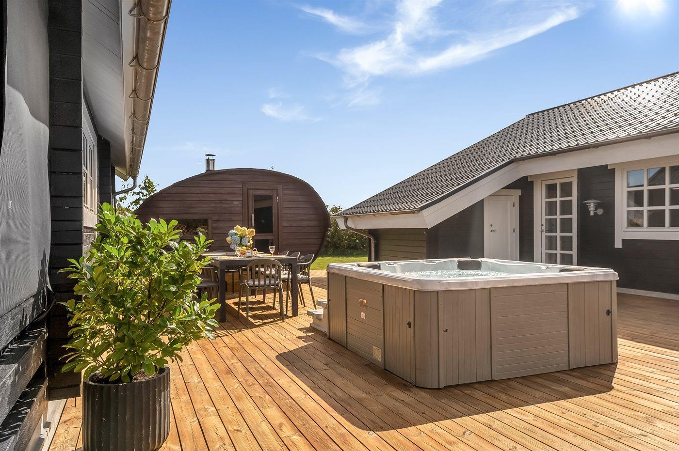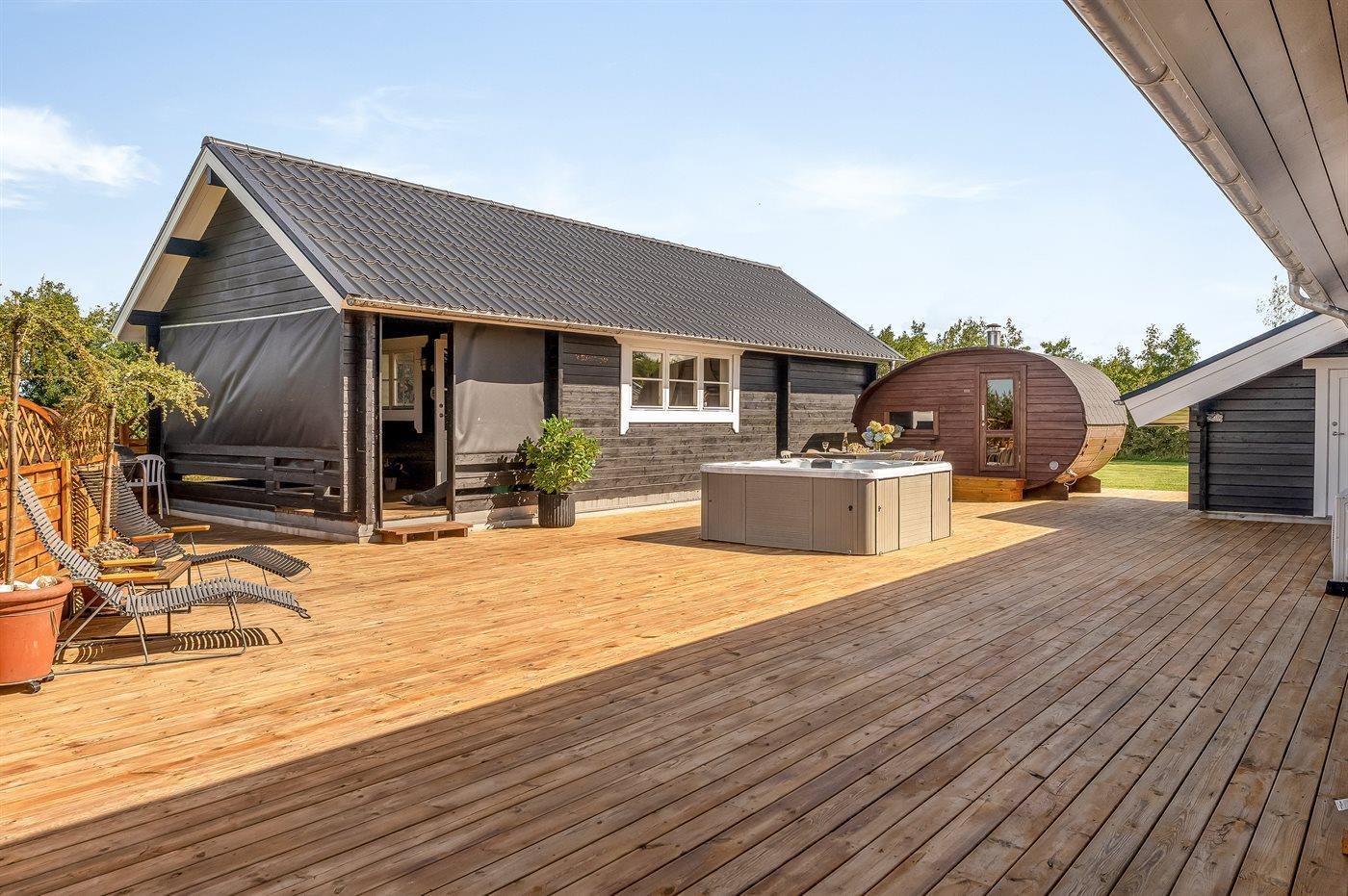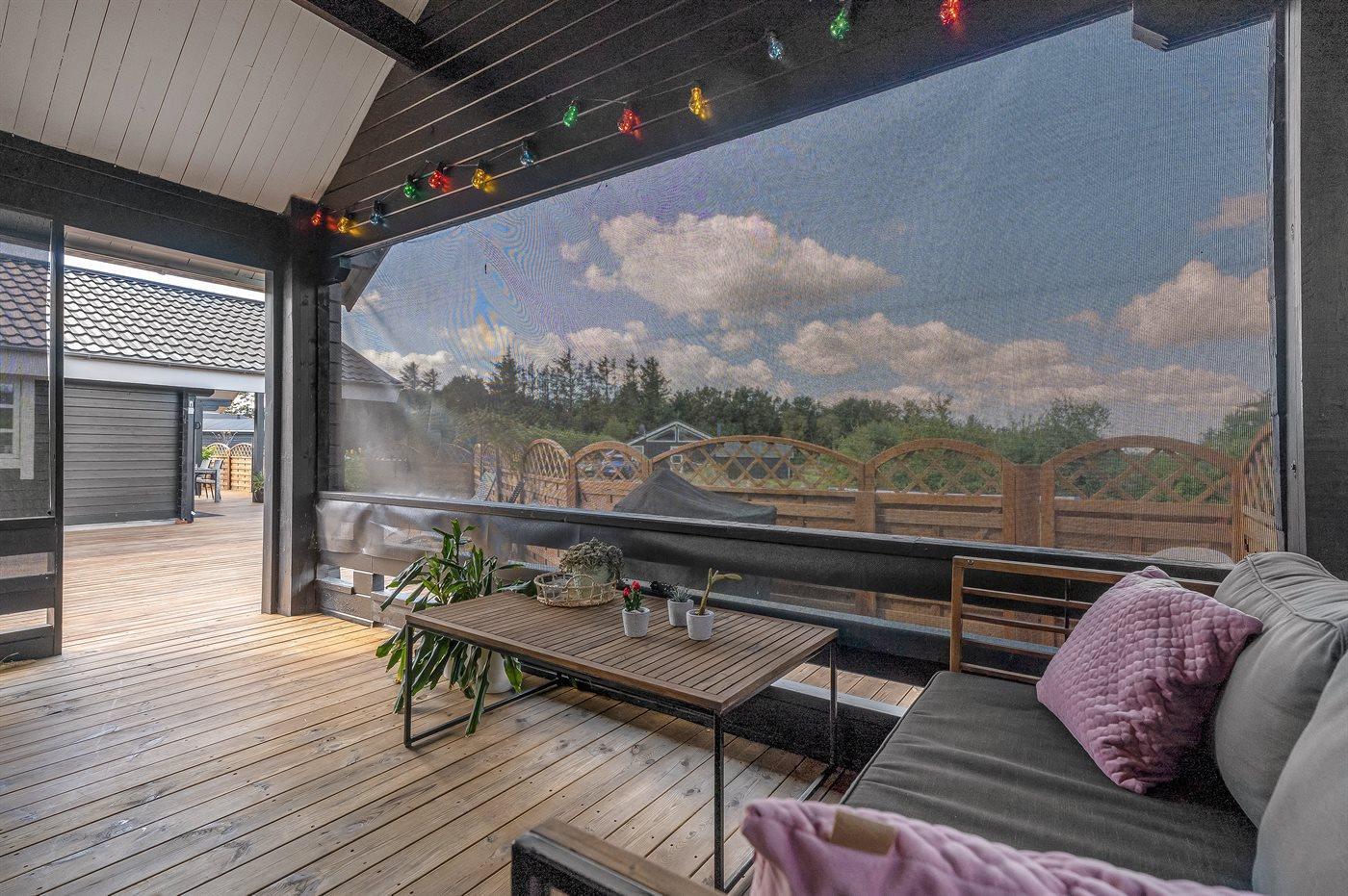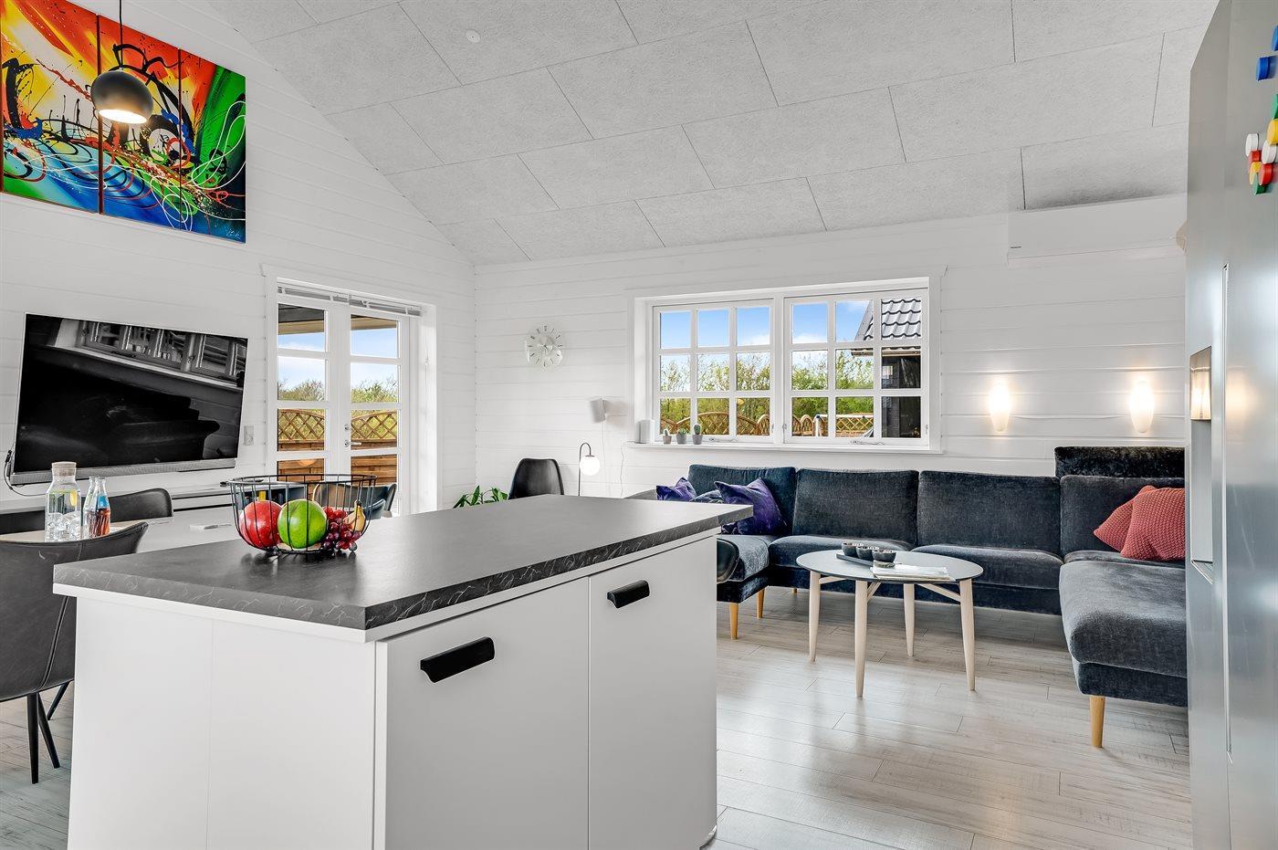 The holiday home is situated on a 2936 m² natural site. Situated 500 m from inlet. Nearest shop is 2000 m away. A terrace belong to the holiday home. Furthermore the house has a covered terrace. Football goal. Outdoor sauna. Parking place by the holiday home.