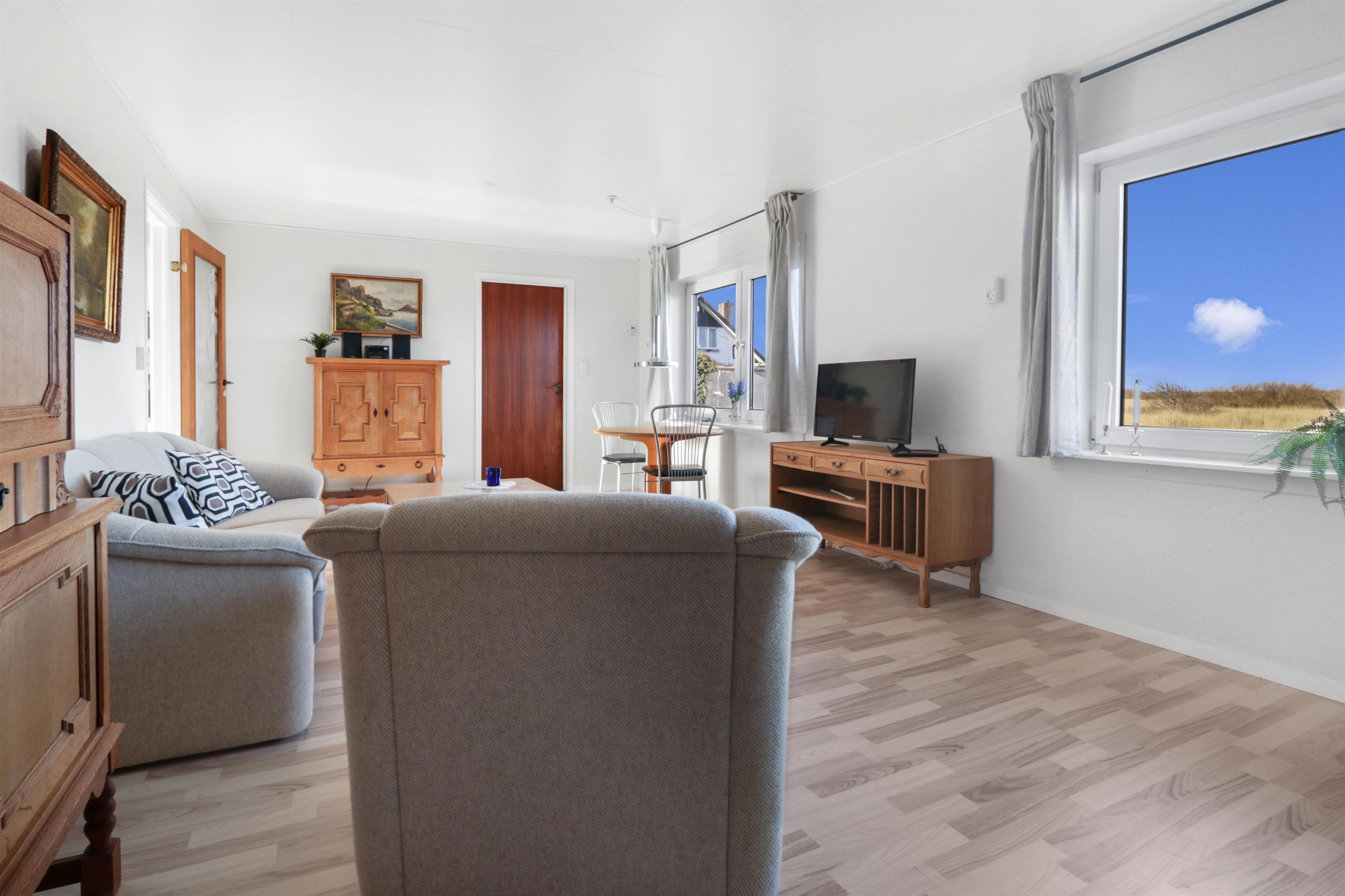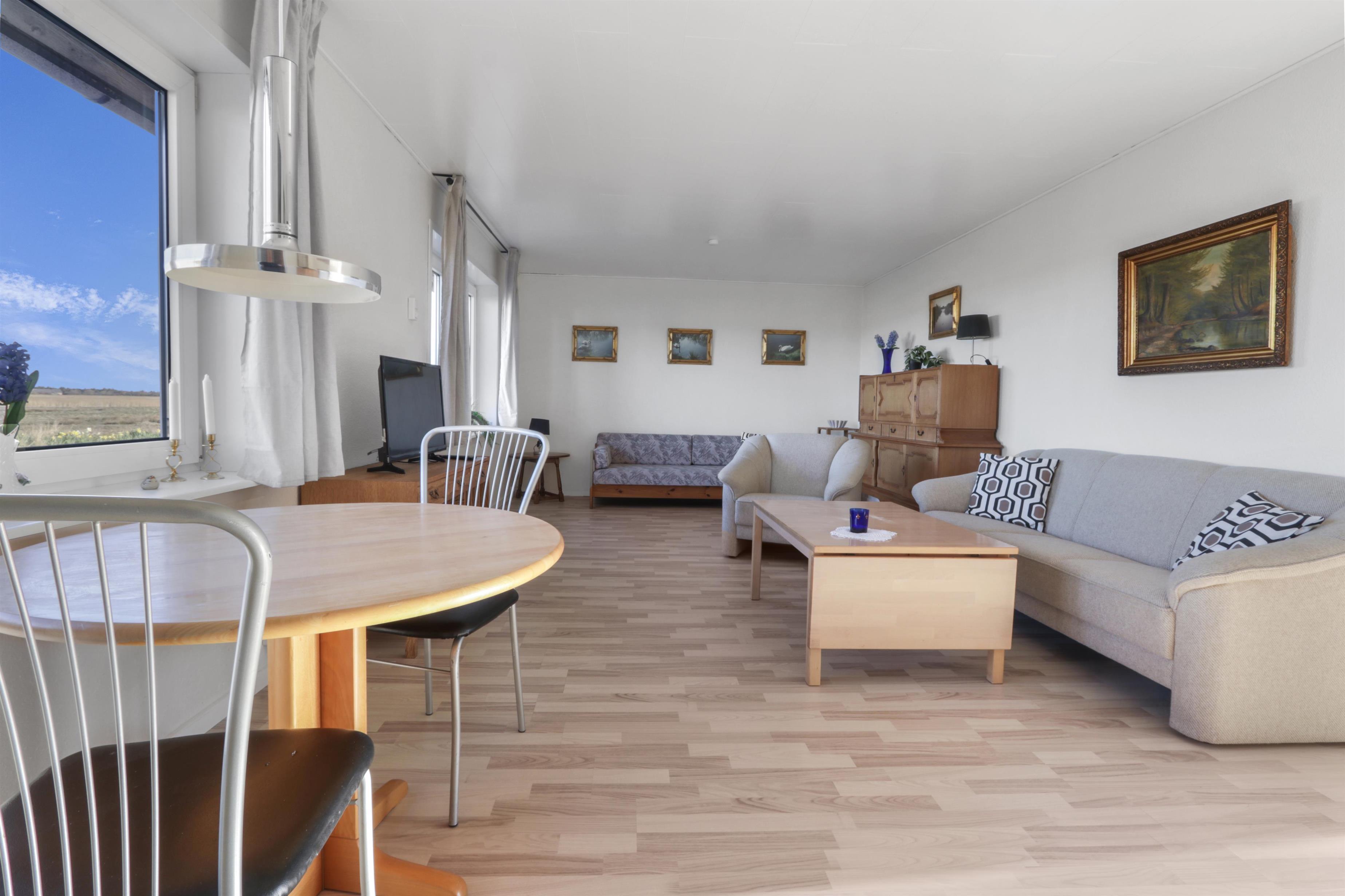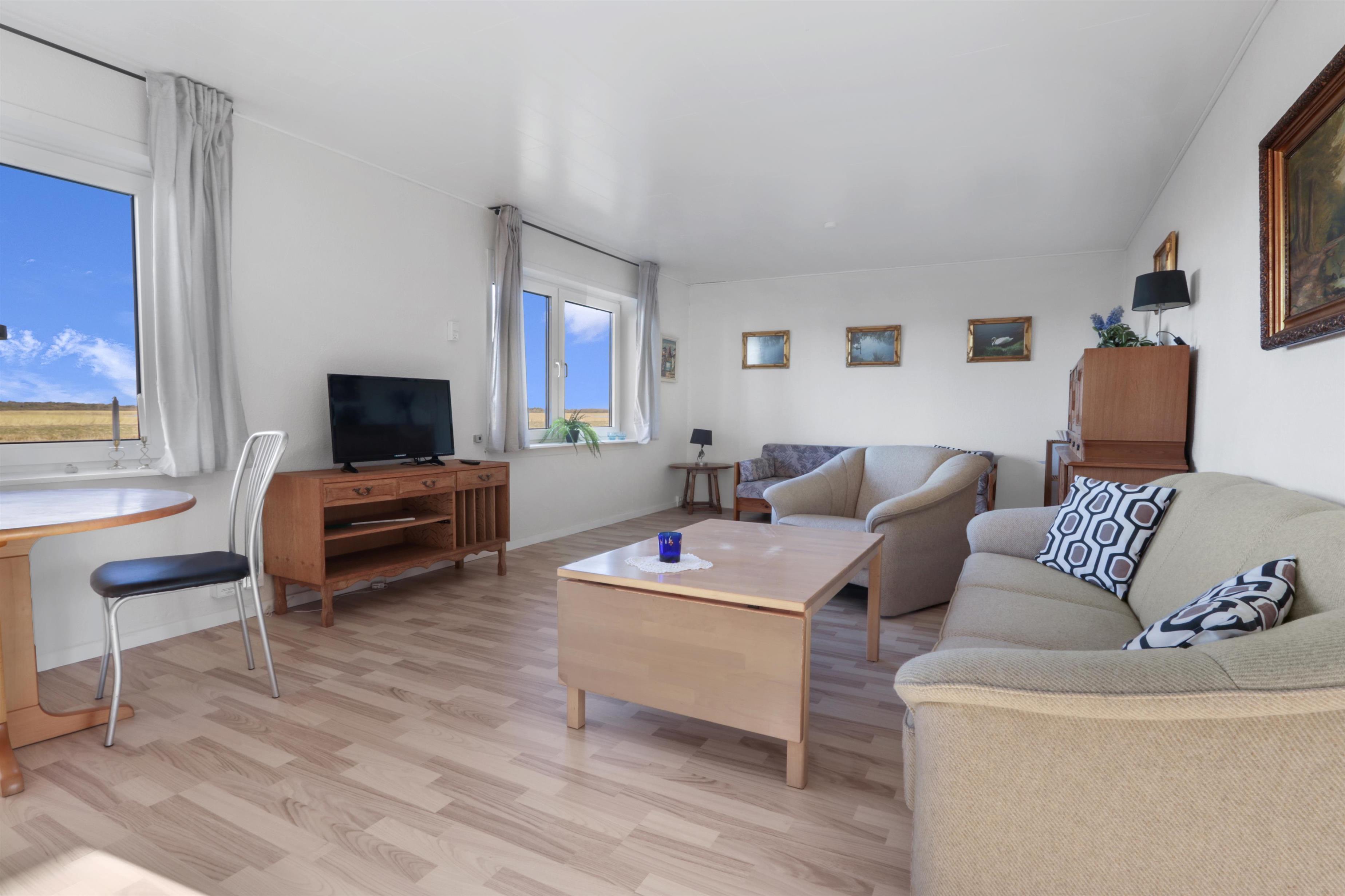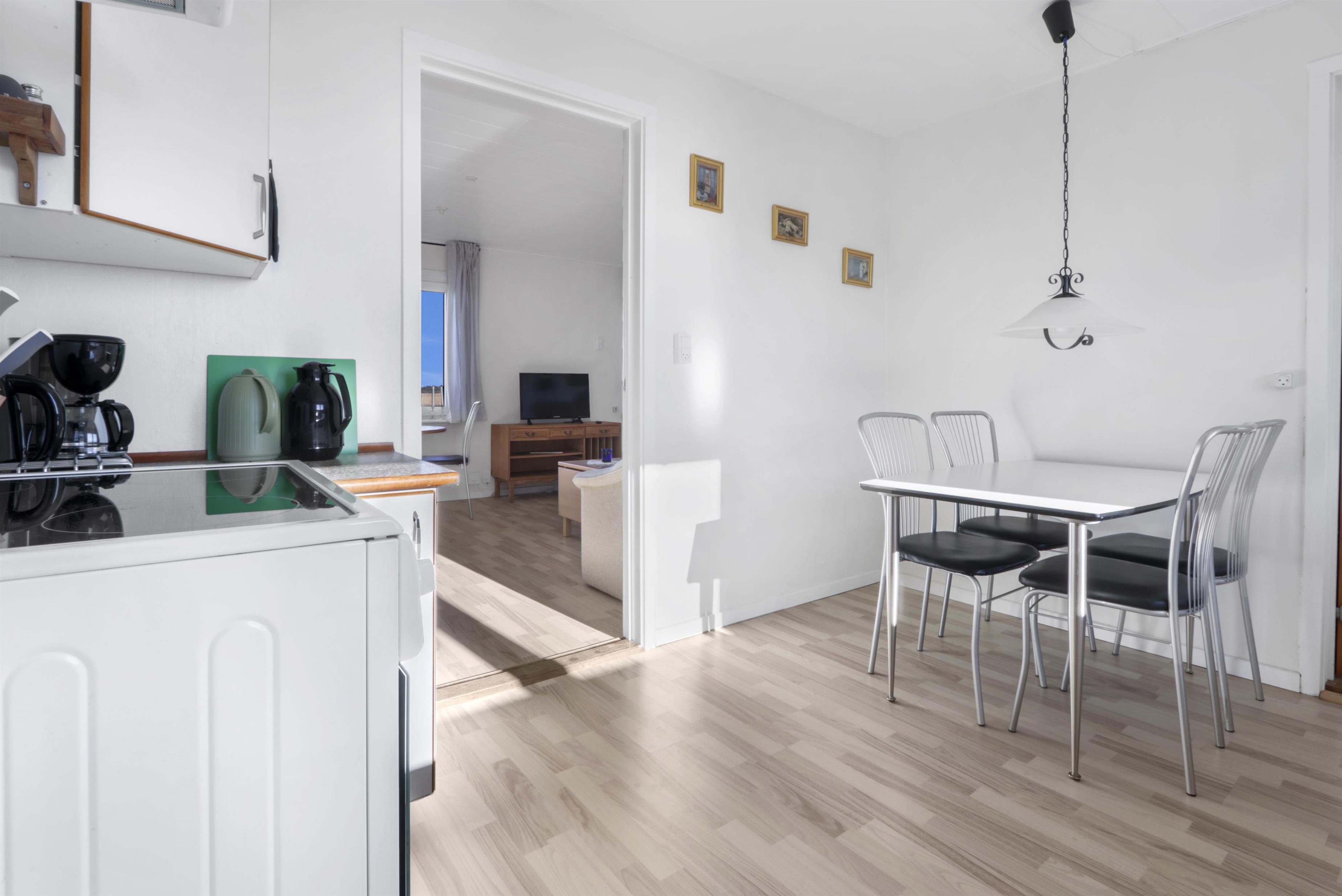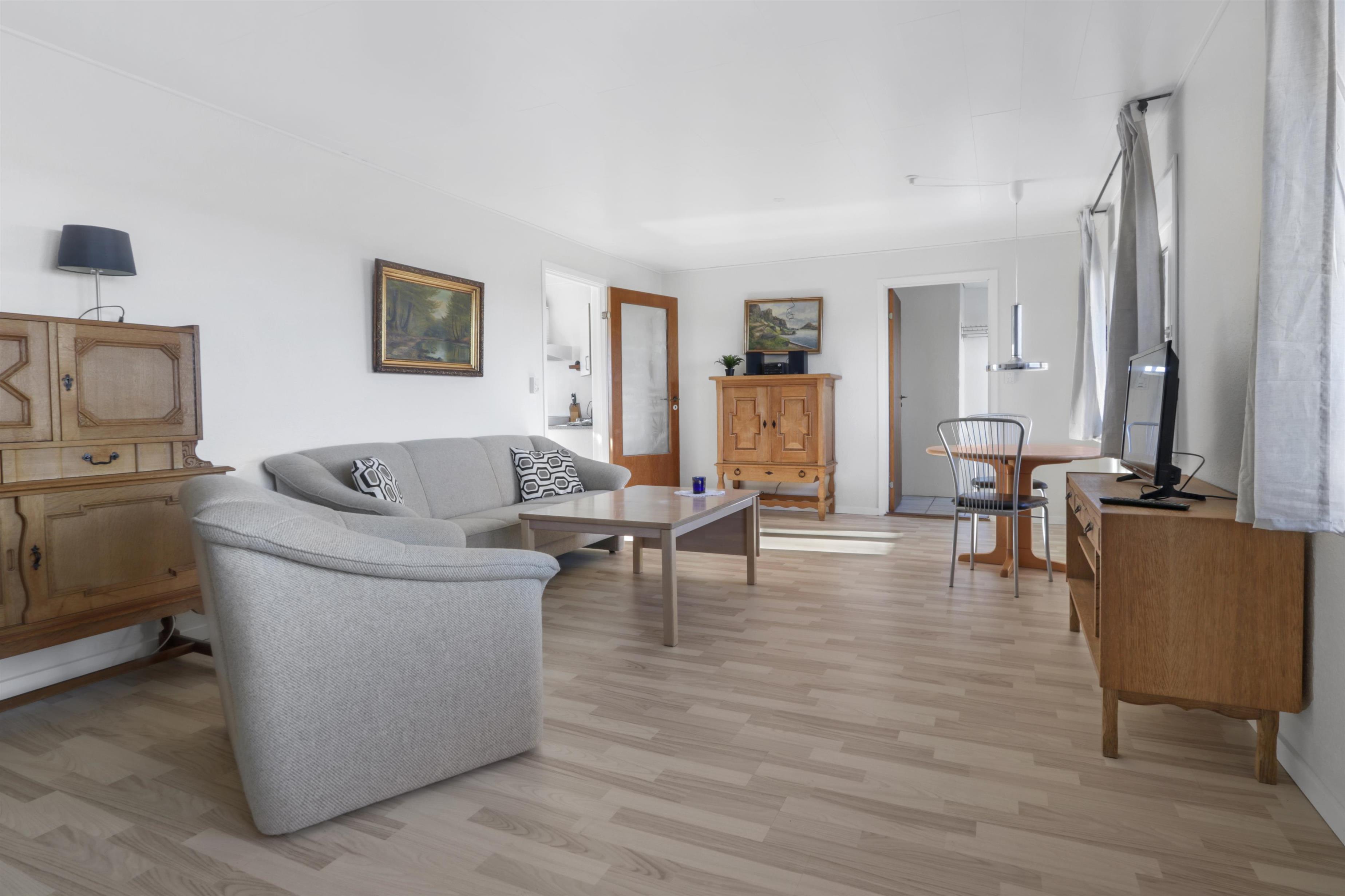 Die Wohnung ist schlicht und praktisch eingerichtet. Küche mit Essbereich, Glaskeramik-Kochfeld, Dunstabzugshaube, Geschirrspüler und Kühlschrank mit Gefrierfach. Von der Küche aus gibt es Zugang zu einem großen Schlafzimmer (1 Doppelbett). Wohnzimmer mit TV (deutsche und dänische Sender) und Schlafsofa (für 2 Personen). Renoviertes Badezimmer mit WC, Waschbecken, Dusche, Waschmaschine und Fliessenboden. Die gesamte Wohnung wird durch eine neue und nachhaltige Luft-Wasser-Wärmepumpe beheizt.