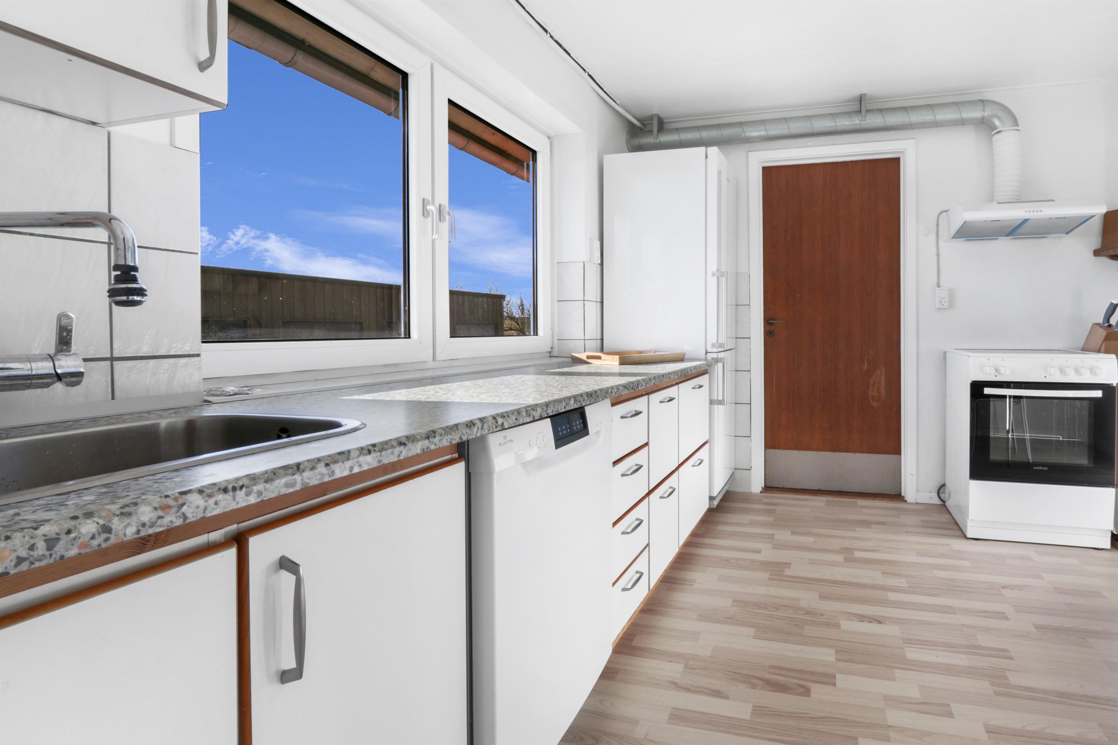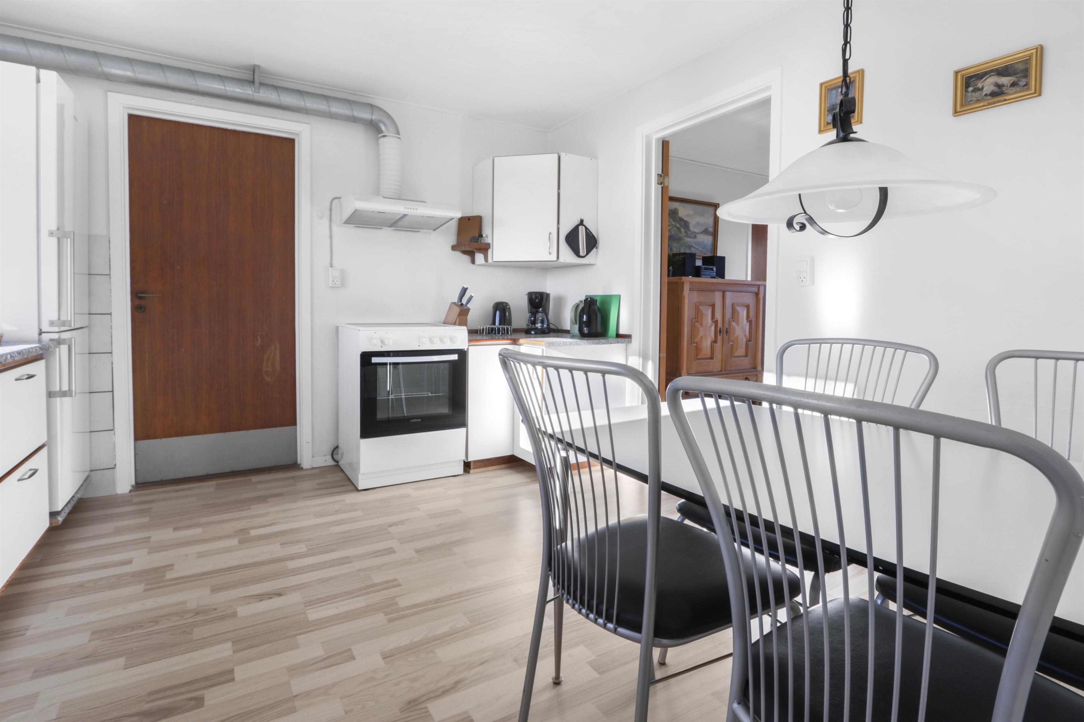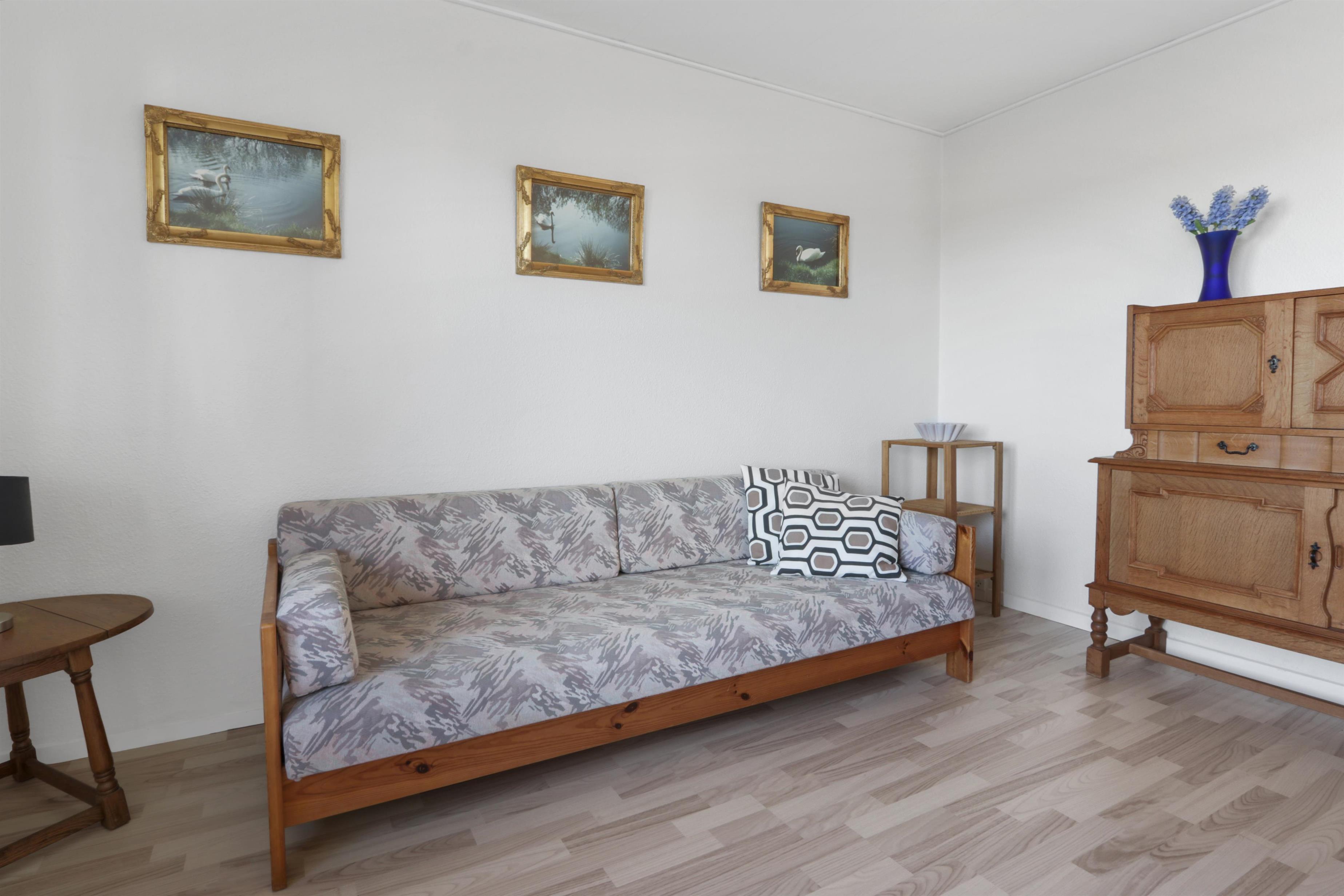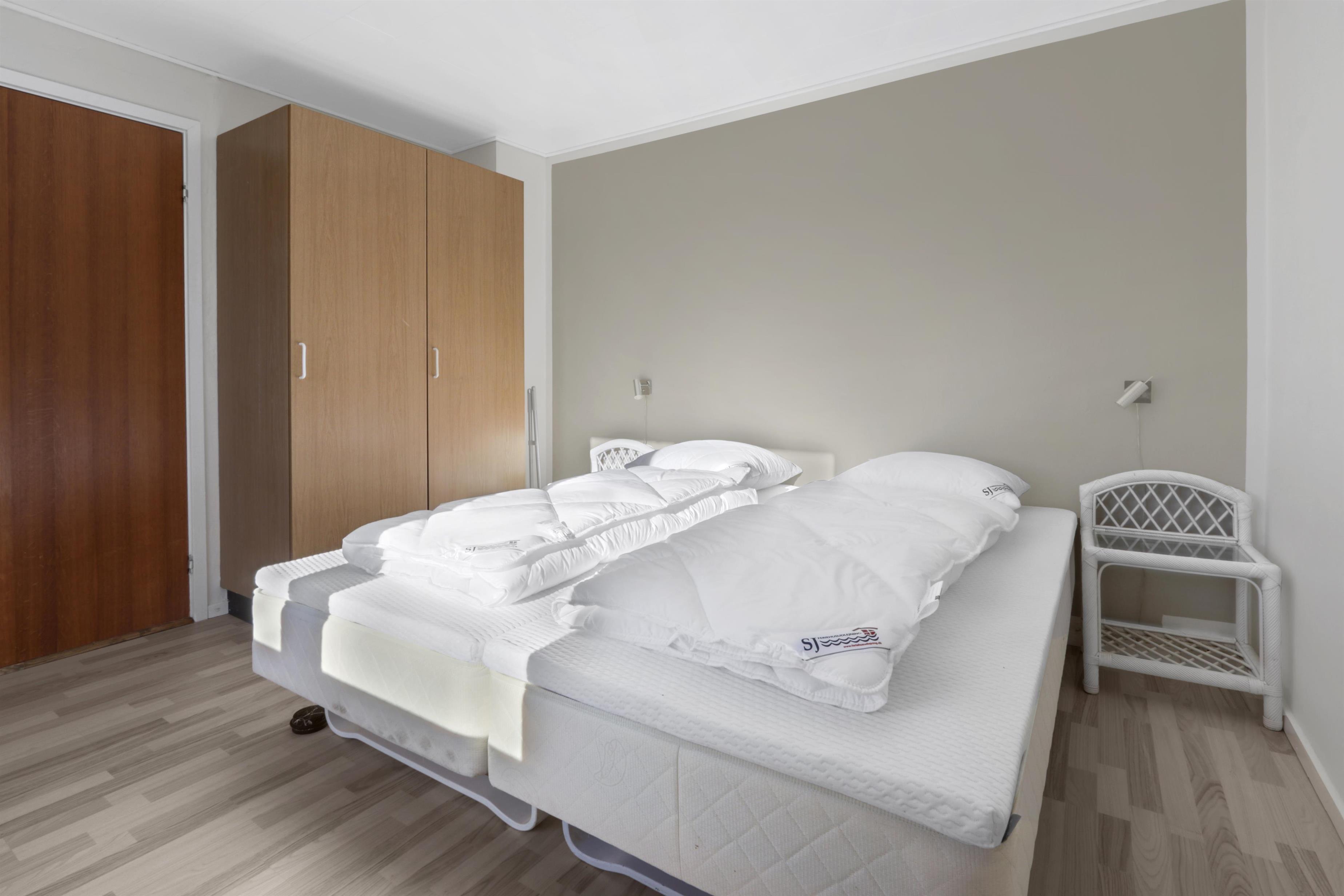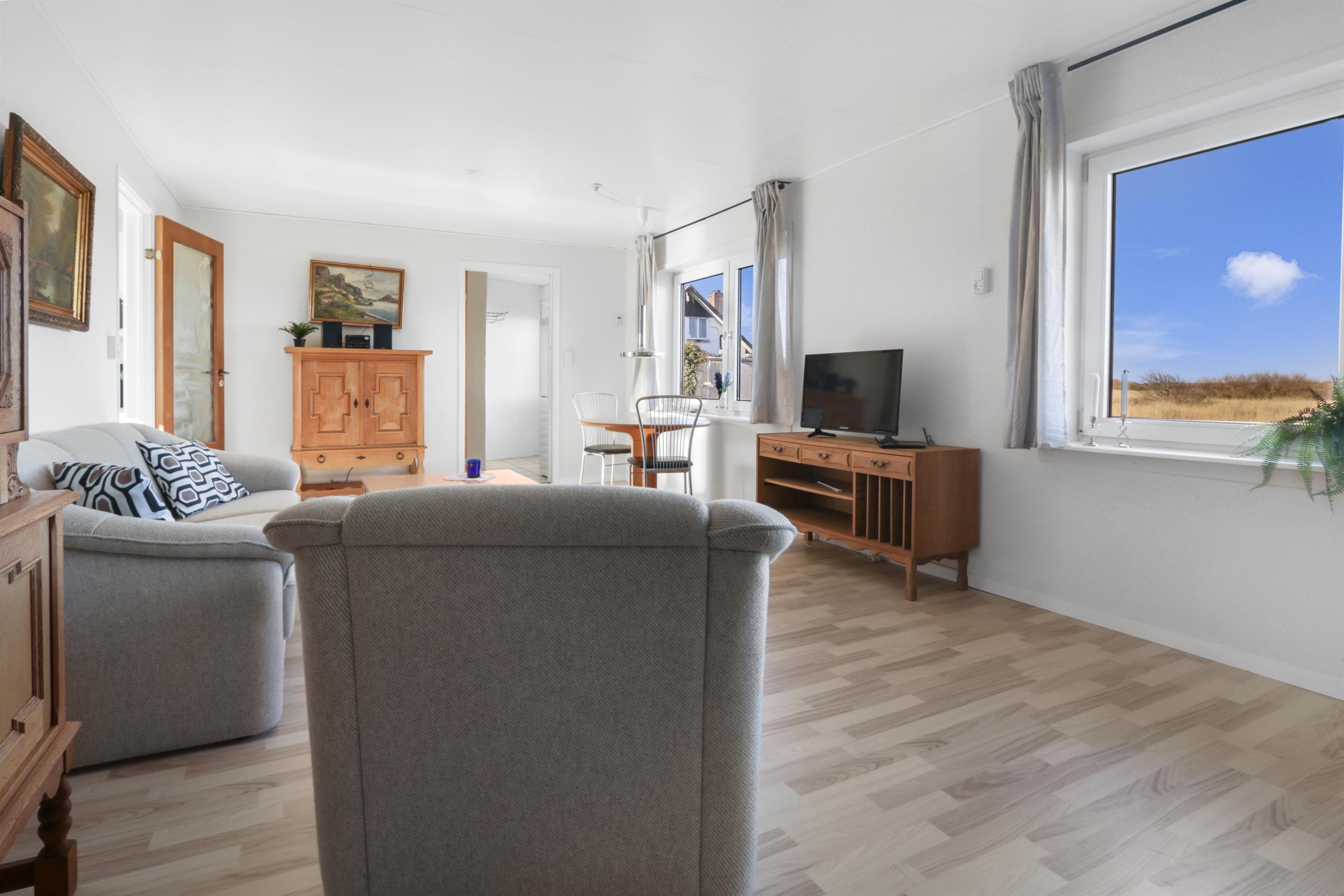Die Wohnung ist schlicht und praktisch eingerichtet. Küche mit Essbereich, Glaskeramik-Kochfeld, Dunstabzugshaube, Geschirrspüler und Kühlschrank mit Gefrierfach. Von der Küche aus gibt es Zugang zu einem großen Schlafzimmer (1 Doppelbett). Wohnzimmer mit TV (deutsche und dänische Sender) und Schlafsofa (für 2 Personen). Renoviertes Badezimmer mit WC, Waschbecken, Dusche, Waschmaschine und Fliessenboden. Die gesamte Wohnung wird durch eine neue und nachhaltige Luft-Wasser-Wärmepumpe beheizt.