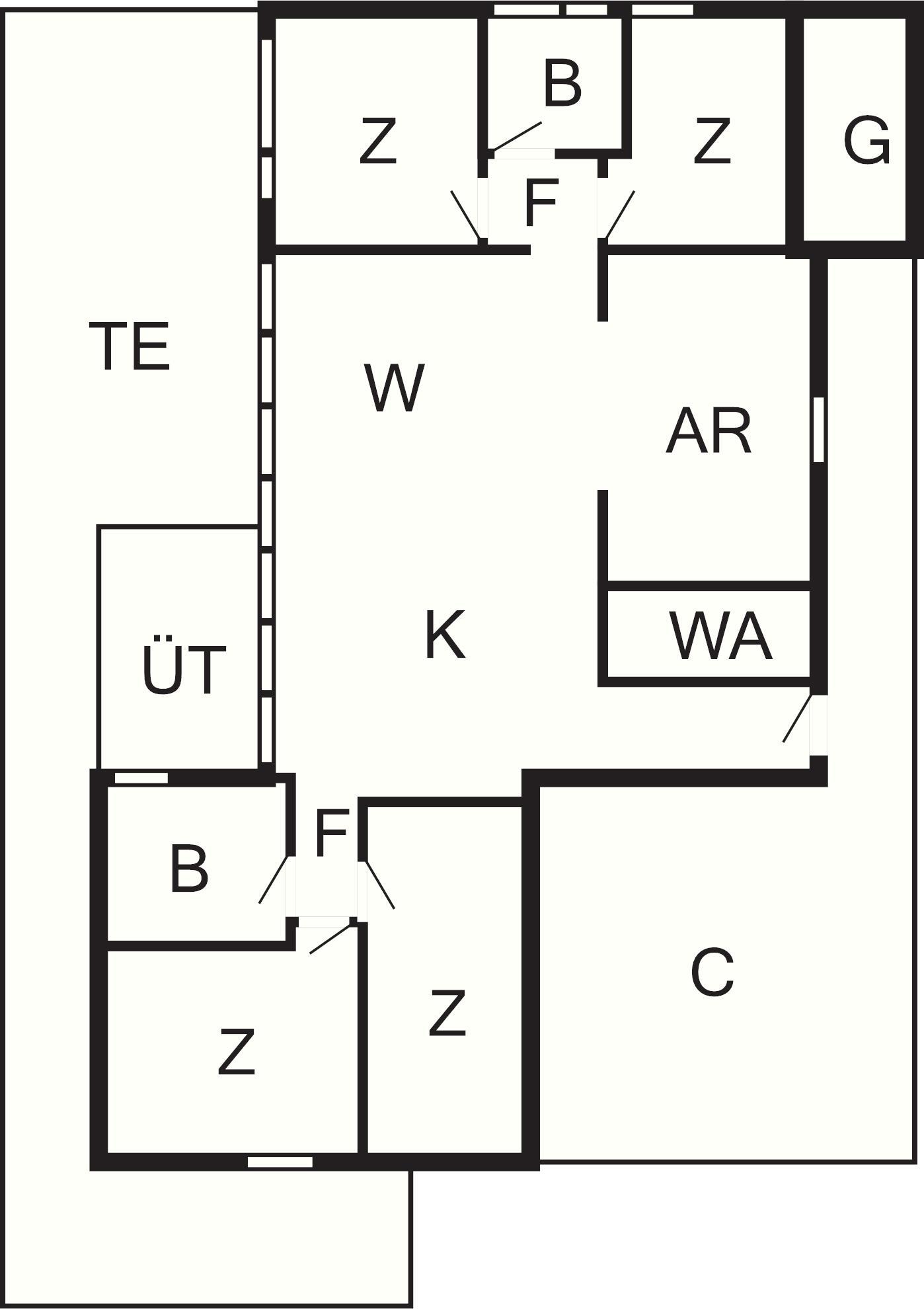 Die Raumverteilung eignet sich mit den zwei Schlafbereichen mit jeweils zugehörigem Bad auch gut für zwei befreundete Familien oder Generationen. Die Liege in einem der Zimmer ist 170 cm lang. In der Mitte befindet sich der geräumige Küchen-/Wohnbereich für die gemeinsamen Stunden. Die großen Fenster lassen viel Tageslicht ins Haus und bieten zusammen mit der erhöhten Lage eine schöne Panoramaaussicht über das Wasser im Fjord und zur Halbinsel Hornsherred.