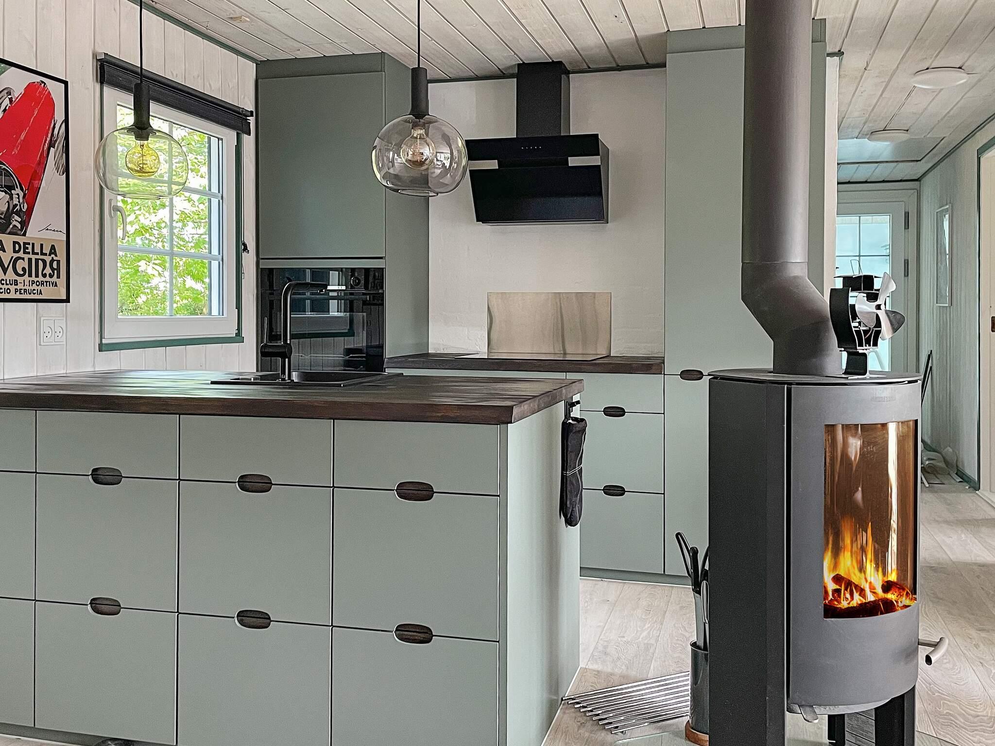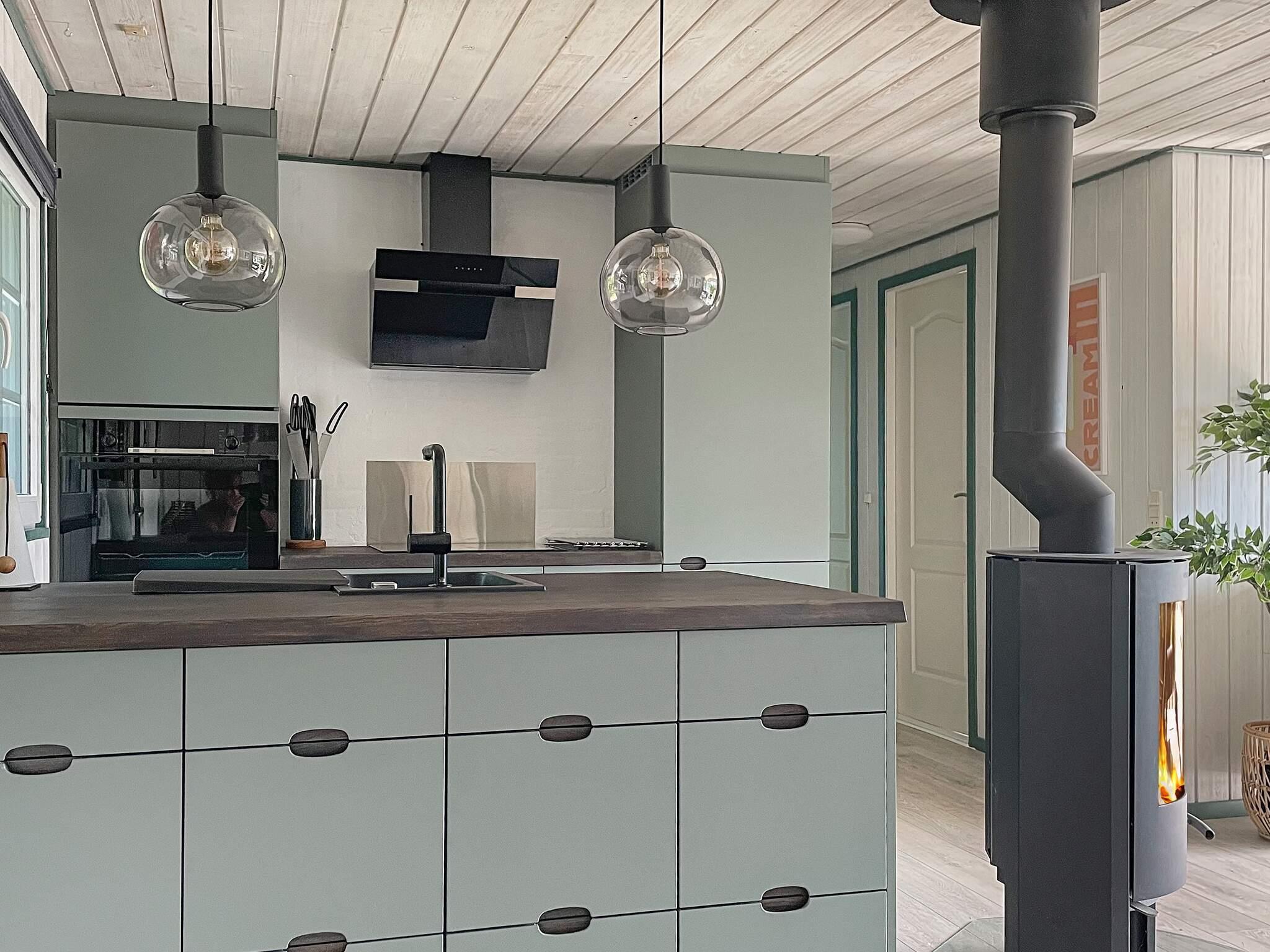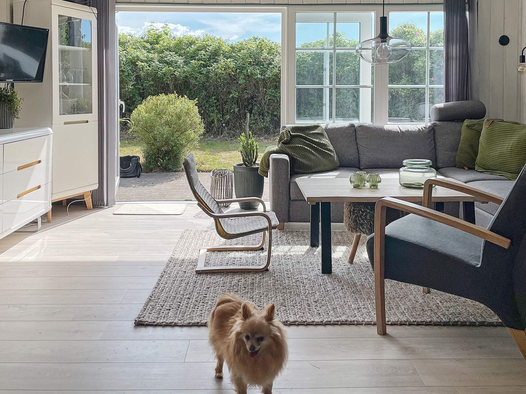 Das Ferienhaus verfügt über eine gut ausgestattete Küche und ein mit einem großen Ecksofa gemütlich eingerichtetes Wohnzimmer, offen kombiniert mit der Essecke.
