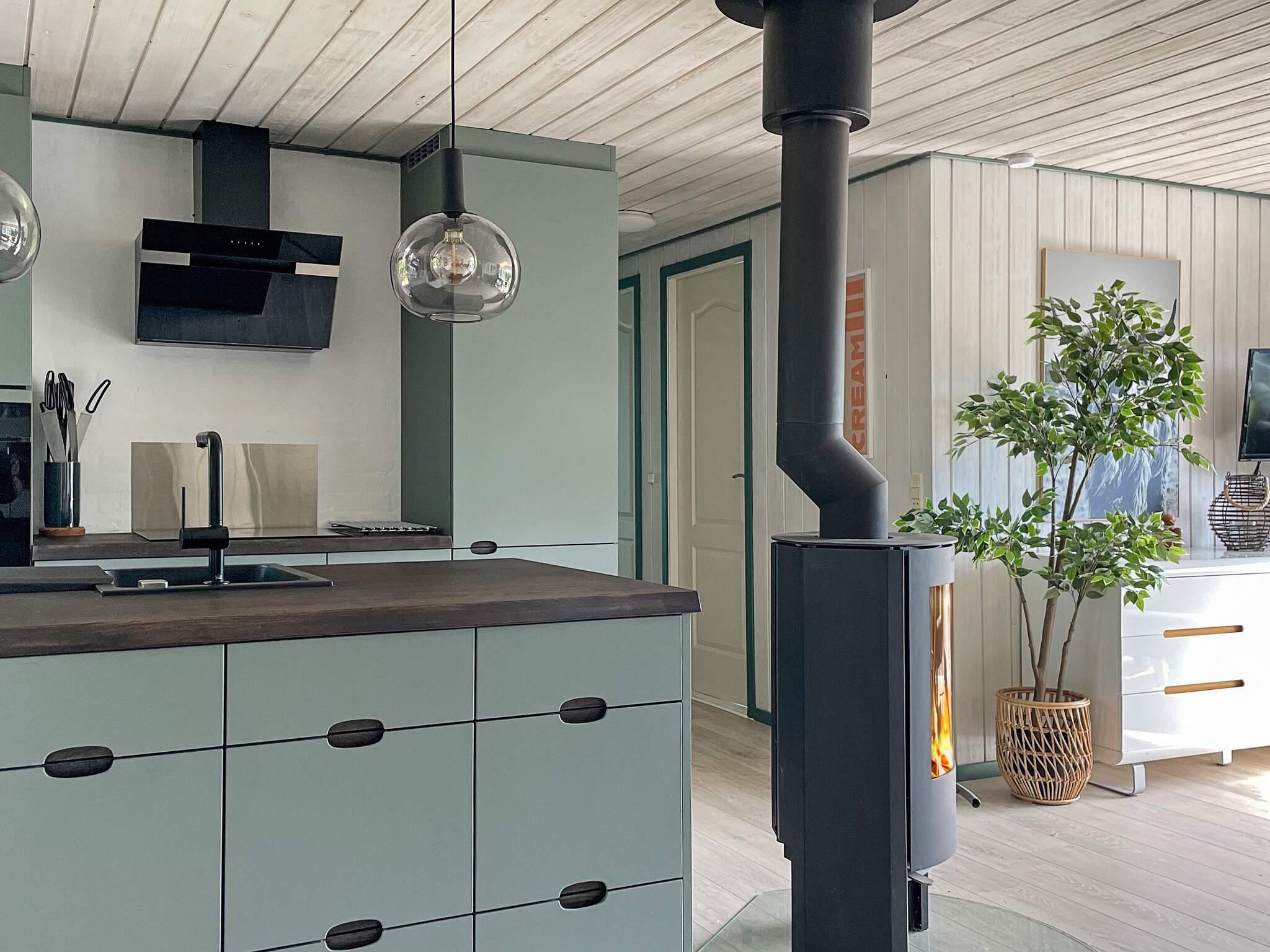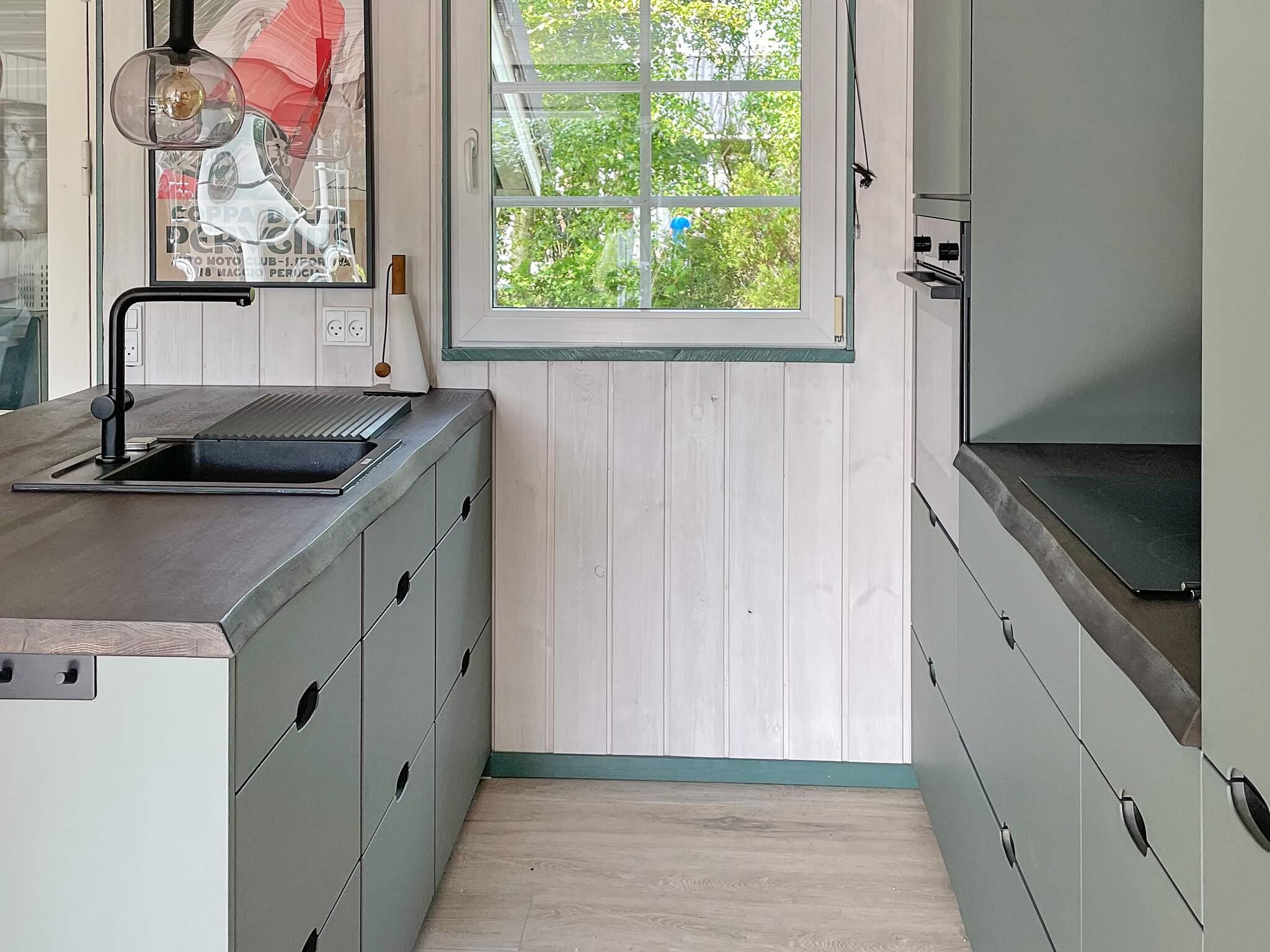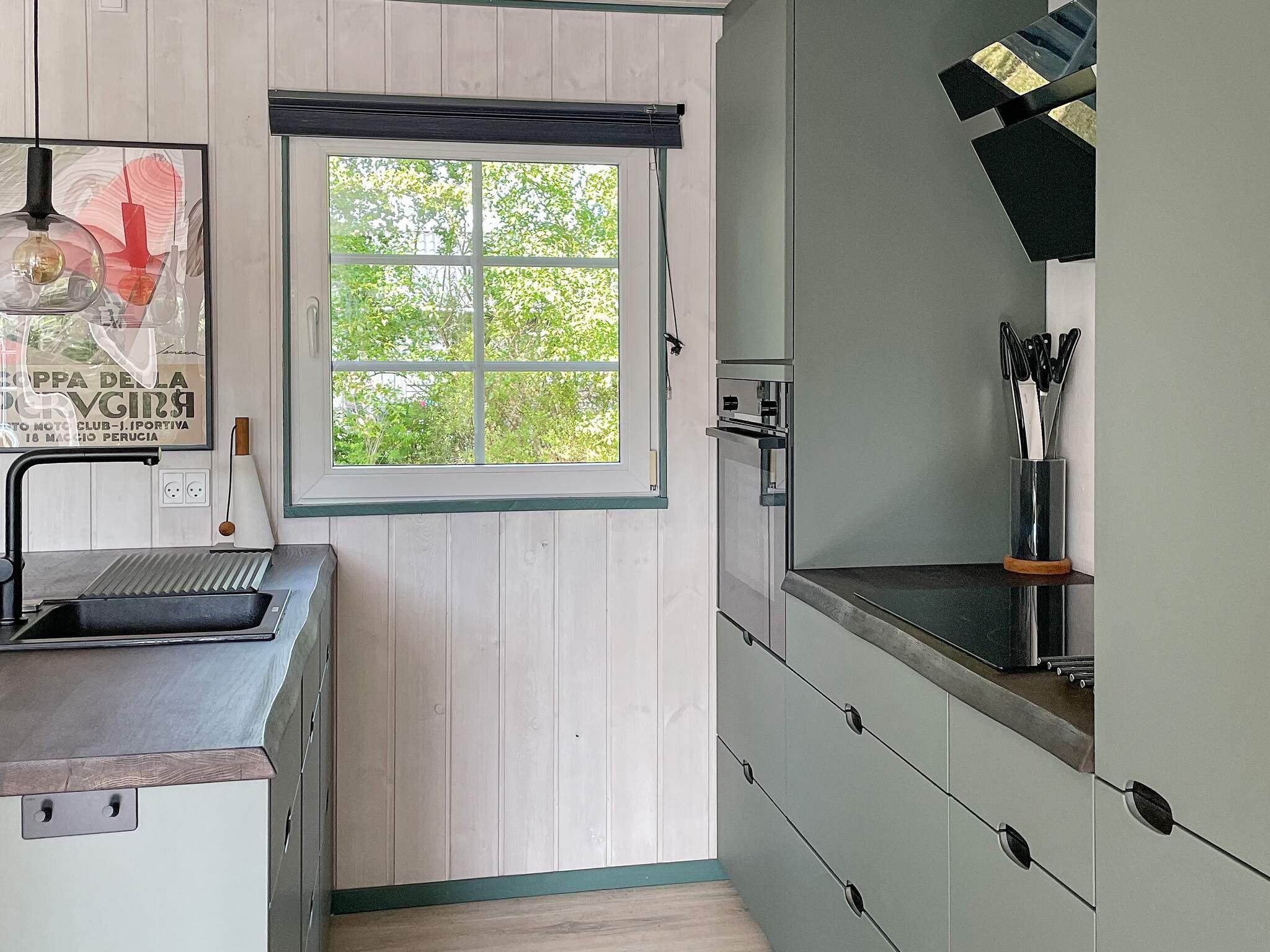 Das Ferienhaus verfügt über eine gut ausgestattete Küche und ein mit einem großen Ecksofa gemütlich eingerichtetes Wohnzimmer, offen kombiniert mit der Essecke.