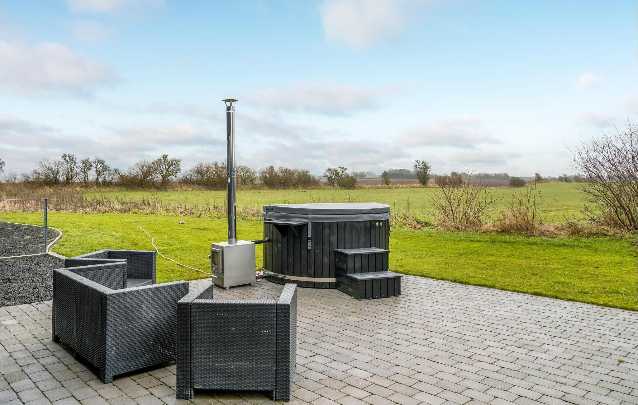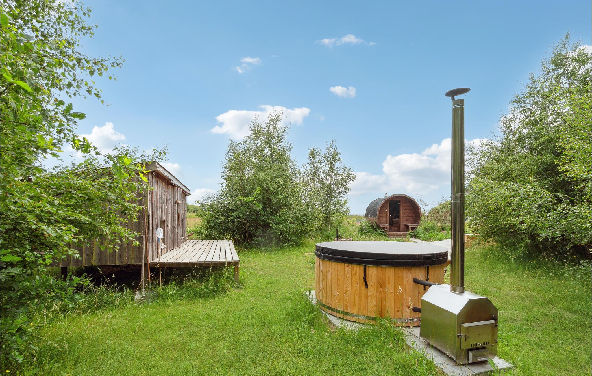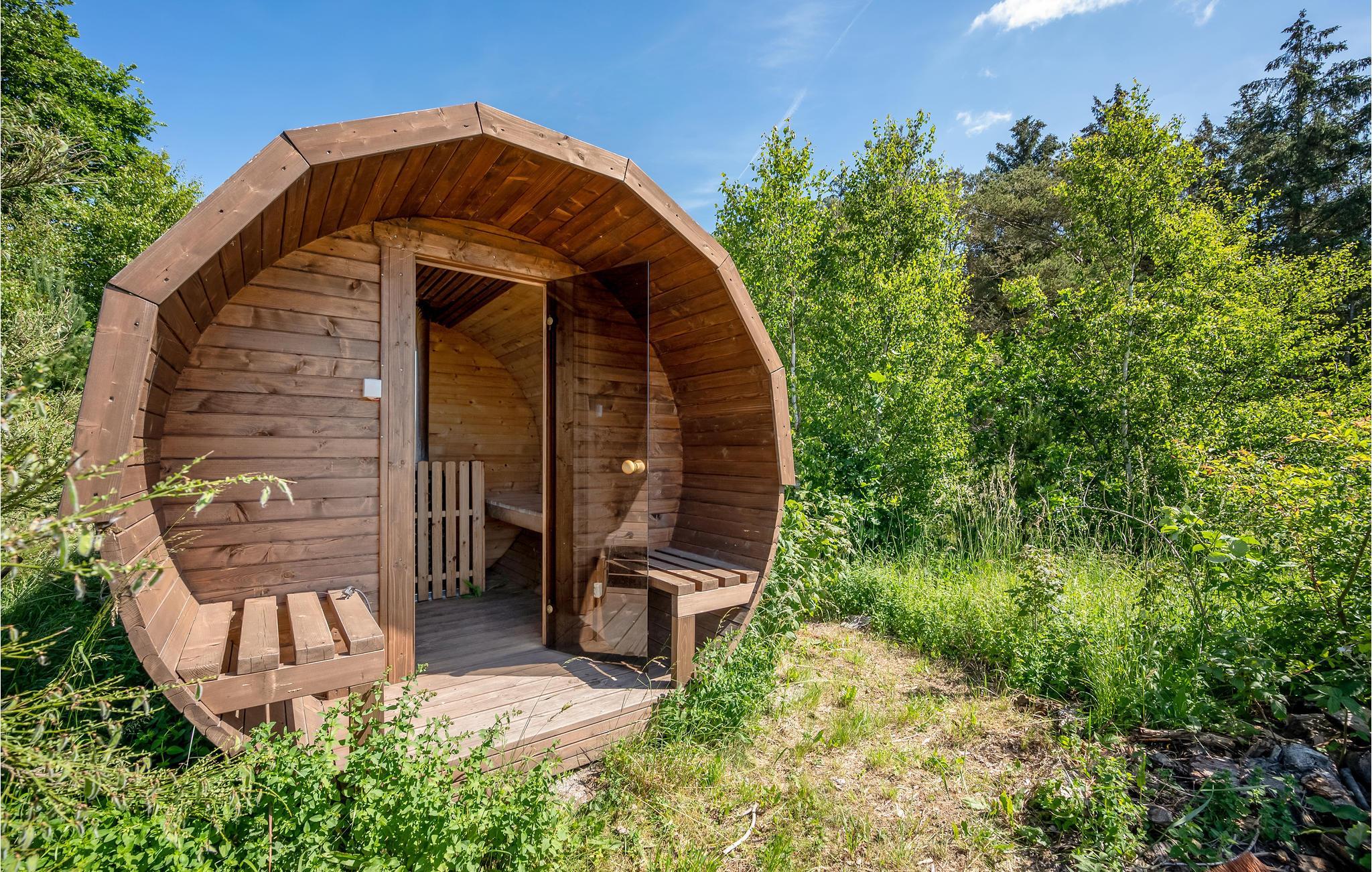 Entspannen Sie sich auf der Gartenterrasse. Hier können Sie frühstücken und später den Tag bei einem guten Glas Wein ausklingen lassen. Im Garten finden Sie einen fantastischen "Wildnis-Wellness"-Bereich mit einem finnischen Holzbad, einem Kaltwasserbad und einer Fass-Sauna für 8 Personen, so dass es leicht ist, sich zu entspannen und den Alltag zu vergessen. Neben dem Holzbad befindet sich ein wirklich schöner, geschlossener und isolierter Unterstand für 5/6 Personen mit 100 mm Isolierung, um Sie warm zu halten. Hier können Sie sich auch um die Feuerstelle versammeln und Marshmallows über dem offenen Feuer rösten. Das Ferienhaus liegt auf einem 2,5 Hektar großen, naturbelassenen Grundstück, auf dem Sie fernab von Nachbarn einen ganz privaten Urlaub genießen können.