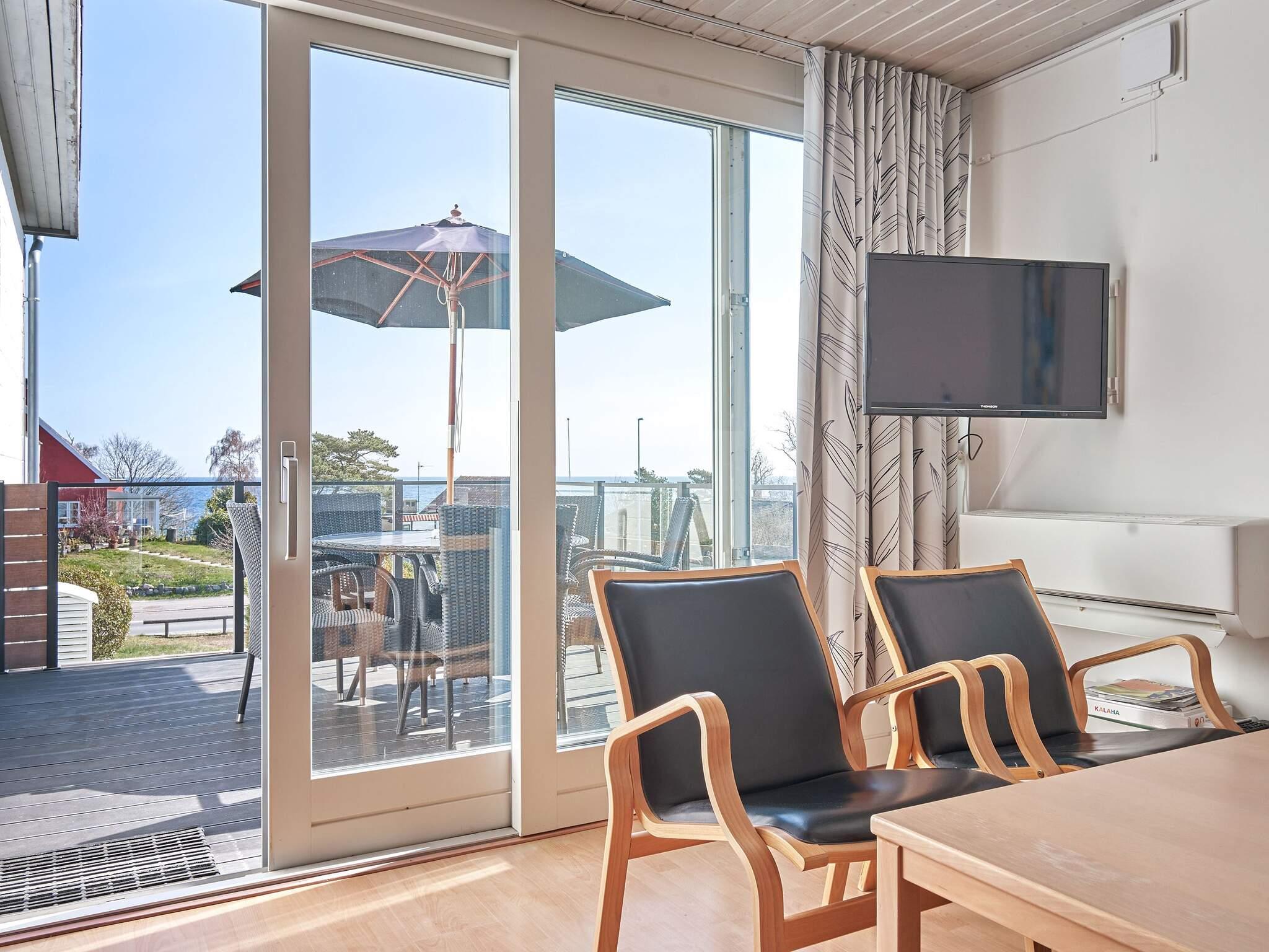 Diese geräumige Ferienwohnung liegt am Hang oberhalb von Sandkås mit schönem Meerblick von Wohnzimmer, Küche und Terrasse. Die Wohnung ist im nordischen, minimalistischen Stil eingerichtet und verfügt über eine offene Küche zum Ess- und Wohnzimmer, mit Zugang zur Terrasse mit Blick auf die Ostsee. Über den Verteilerkorridor gelangt man in das Badezimmer und zu den Schlafzimmern; ein größeres mit Doppelbett, das zweite aufgeteilt und mit drei Schlafplätzen in Betten.
