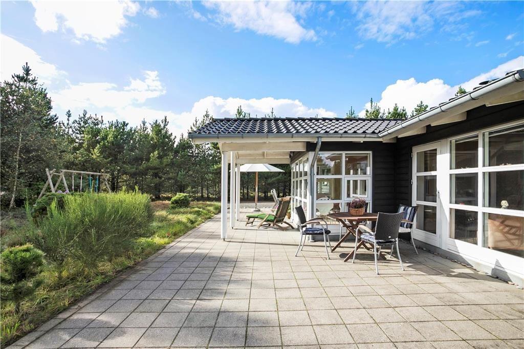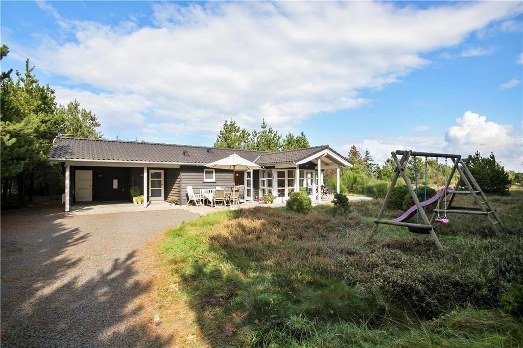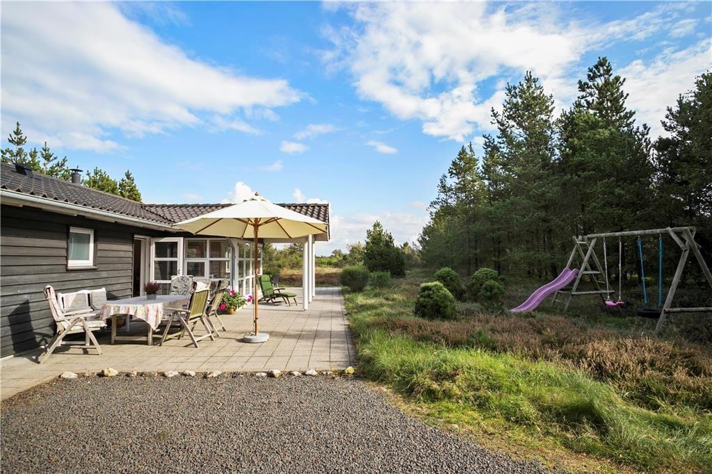 Durch nicht weniger als insgesamt fünf Terrassentüren können Sie vom Hausinneren hinaus auf die große, sonnenverwöhnte und teilweise überdachte Terrasse treten. Mit anderen Worten ist es für Sie ein Leichtes, Ihr Urlaubsleben hinaus ins Freie zu verlegen, sobald das schöne Sommerwetter zu Grillabenden und ausgedehnten Sonnenbädern einlädt. Während Sie sich in aller Ruhe auf der Terrasse erholen, werden Ihre Kinder vergnügt schaukeln oder in der Sandkiste spielen. Das 2.426 m² große Naturgrundstück verschmilzt förmlich mit der durch Heide und Kiefern geprägten Umgebung, die Ihnen friedvolle und ungestörte Urlaubsstunden garantiert.