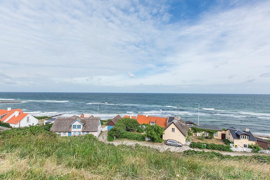 Sie wohnen in einem der am höchsten gelegenen Ferienhäuser am Rande der Steilküste. Sie haben eine einzigartige Aussicht über das Meer. Am Fuß der Steilküste können Sie die alten Fachwerkhäuser in Tisvildeleje sehen. Vor dem Haus befindet sich eine Terrasse. Auf dem hügeligen Grundstück wachsen Strandhafer und ein wenig Gras.