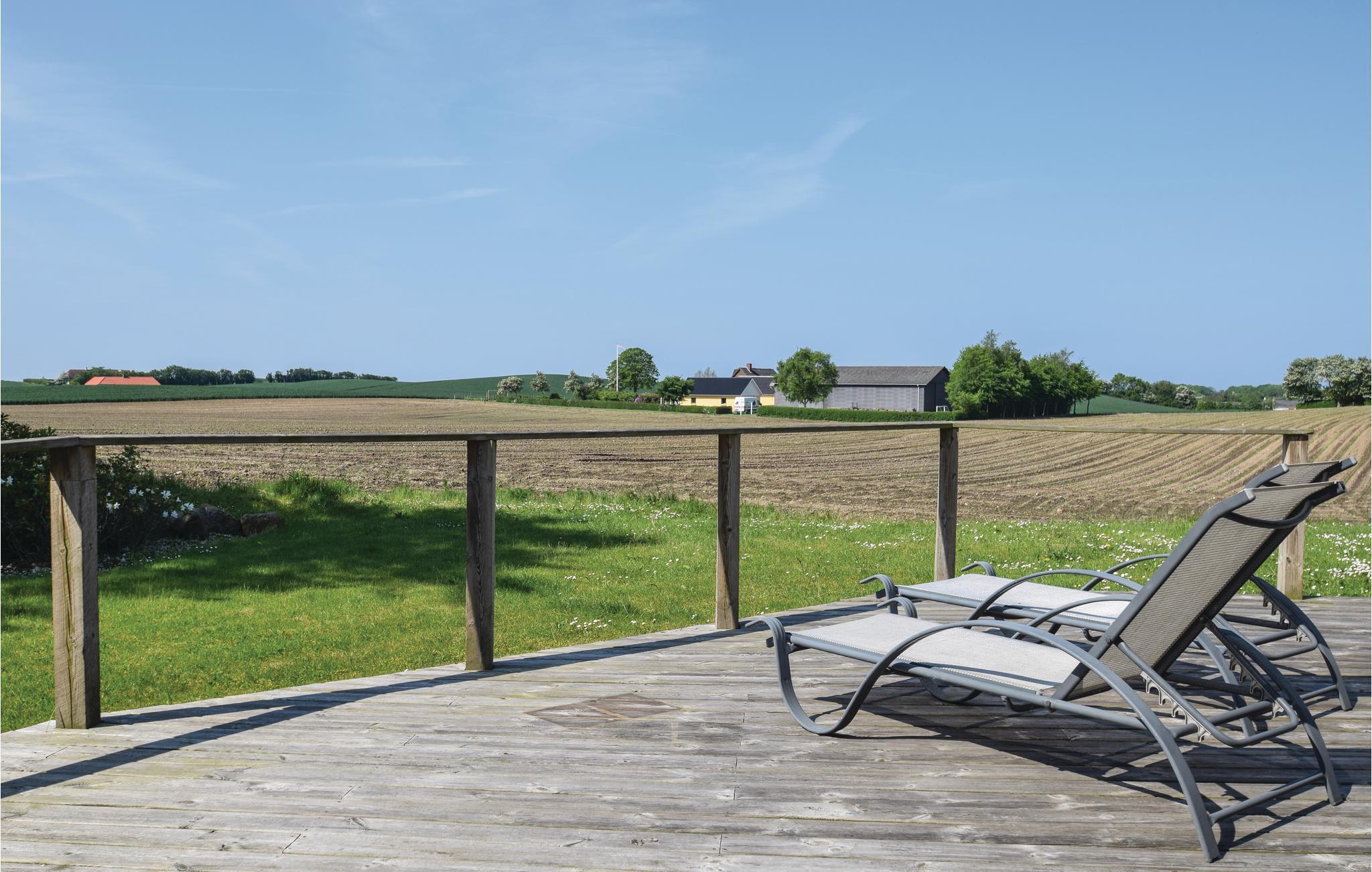 Das Haus hat eine große hölzerne Terrasse und steht mit dem Blick auf die Felder. Das Haus erscheint mit weißen Wänden und hellem Holz- und Klinkerboden hell und freundlich in seiner Einrichtung. Mit seiner Lage bietet das Haus einen guten Ausgangspunkt für Ausflüge in die umliegende Natur. Es sind auch nur 5,5 km zum sehr schönen Ristinge Strand.