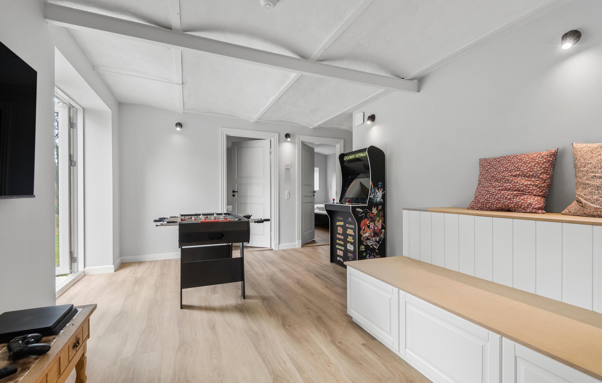 Willkommen in diesem großen Ferienhaus, wo Komfort und Luxus aufeinandertreffen. Im lichtdurchfluteten Wohnzimmer und der modernen Küche erleben Sie pure Entspannung. Das ausgewählte Design und liebevoll eingerichteten Räume schaffen auf zwei Etagen die perfekte Wohlfühloase, wo Sie sich mit Ihrer Familie und Freunden ausruhen und die gemeinsame Zeit genießen können. Das Aktivitätszimmer mit einem Spielautomat, Tischfußball und TV sorgt für zusätzliche Unterhaltung für die ganze Familie.