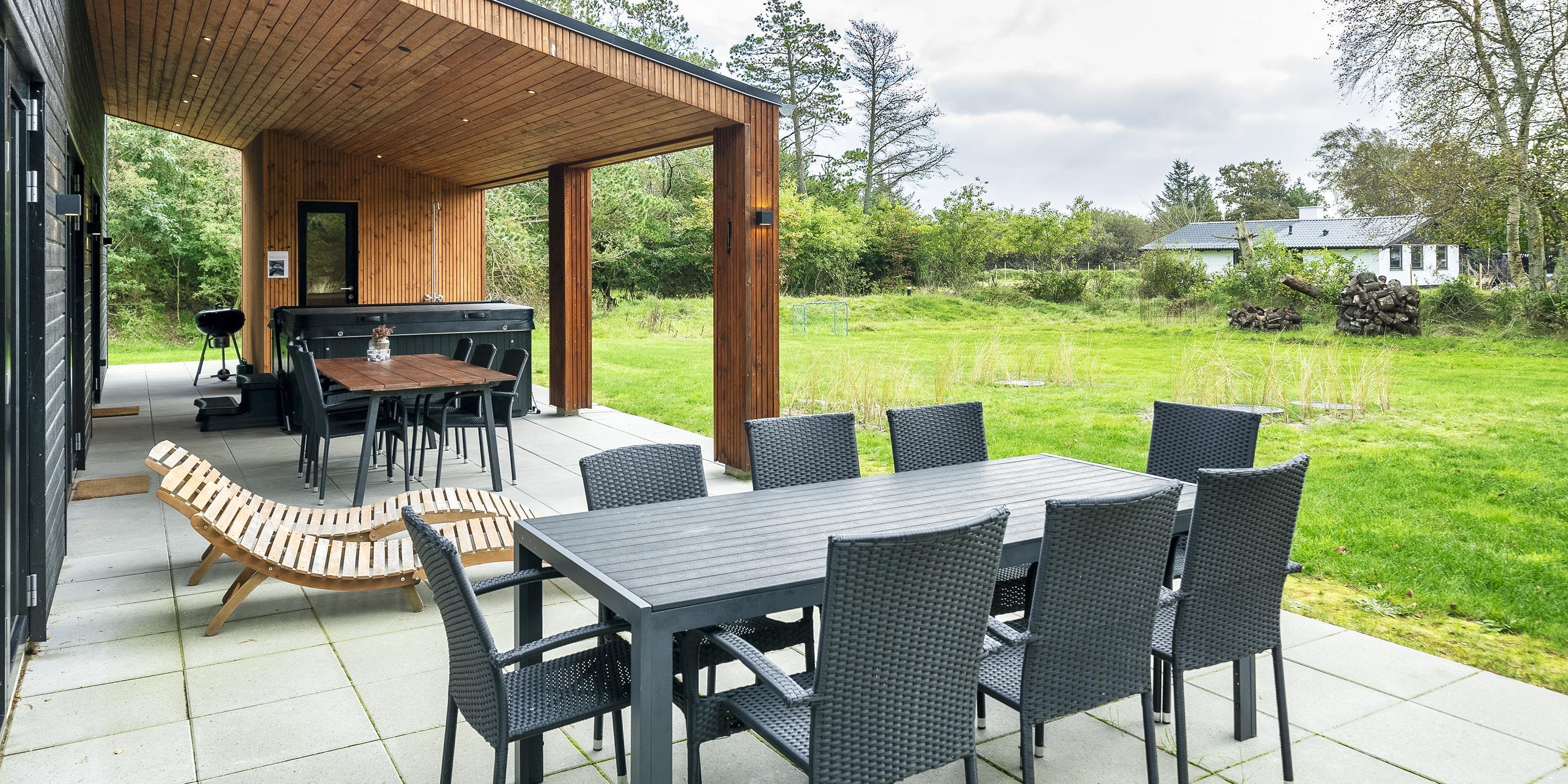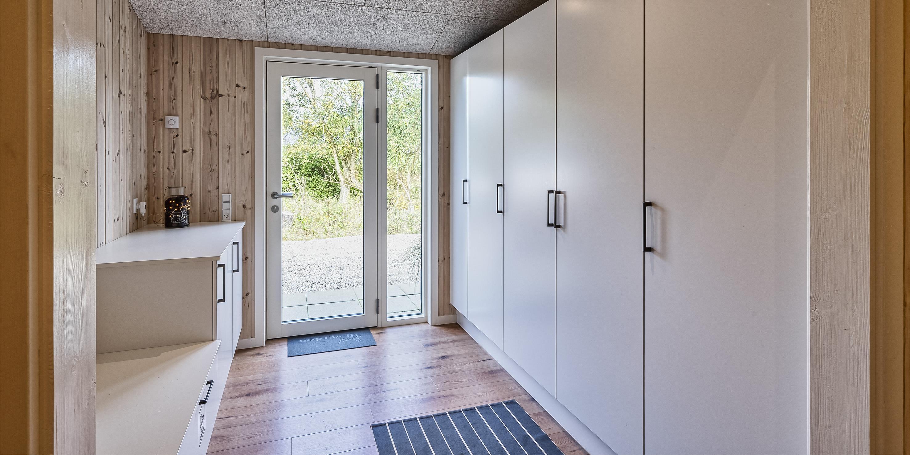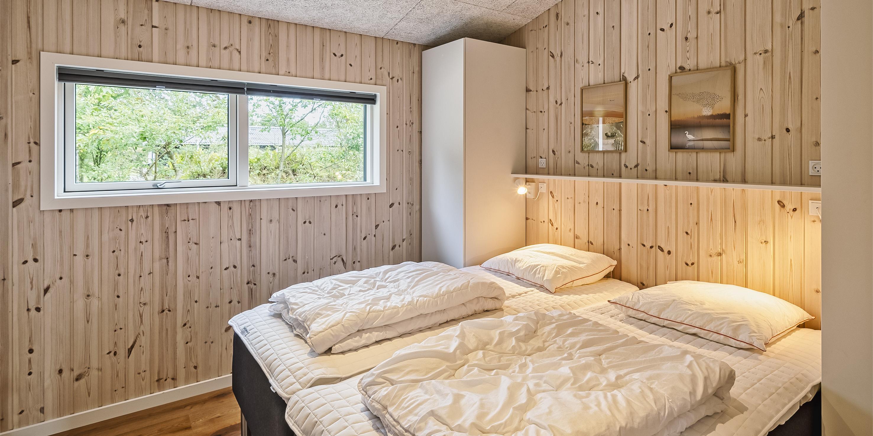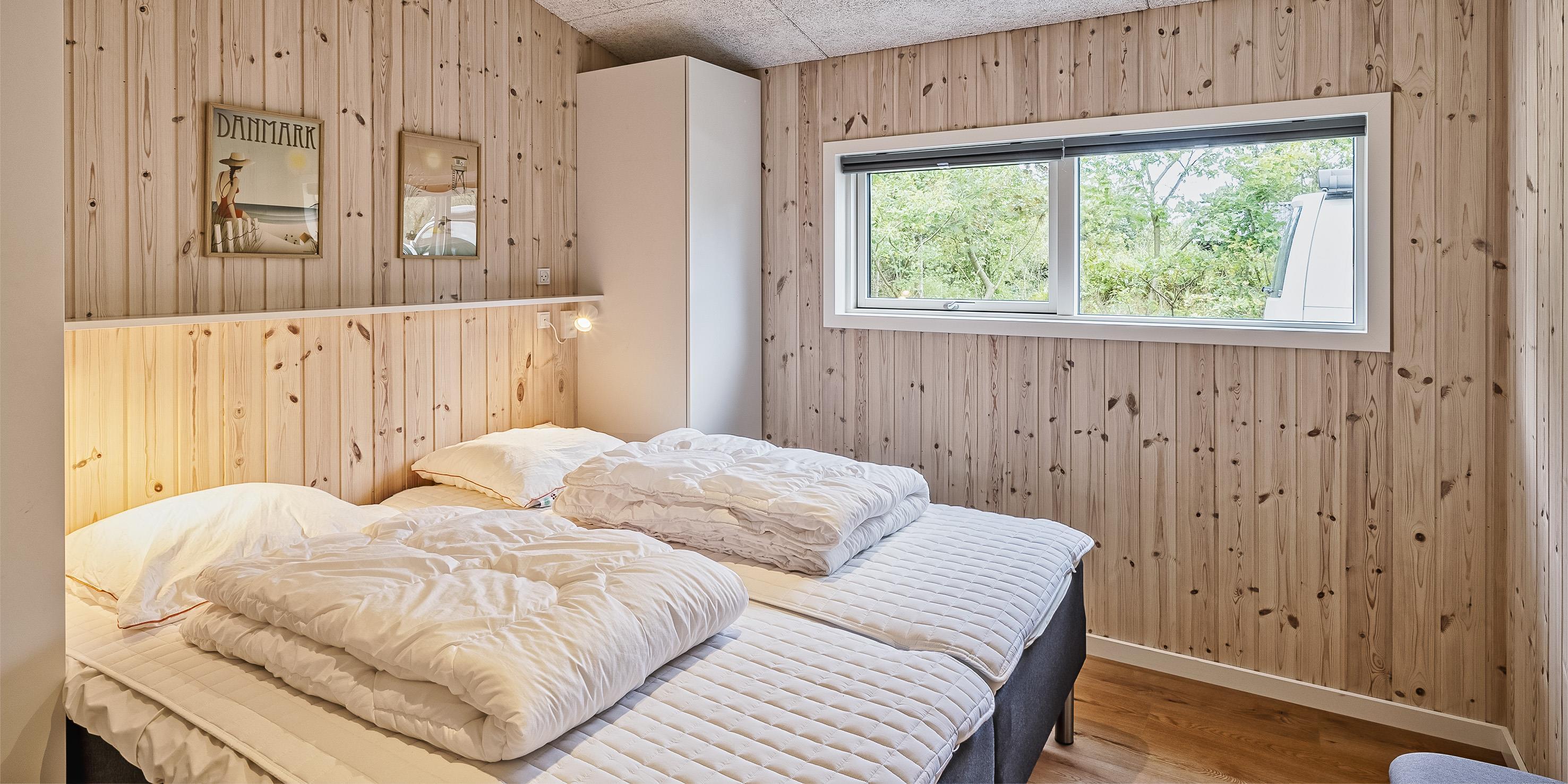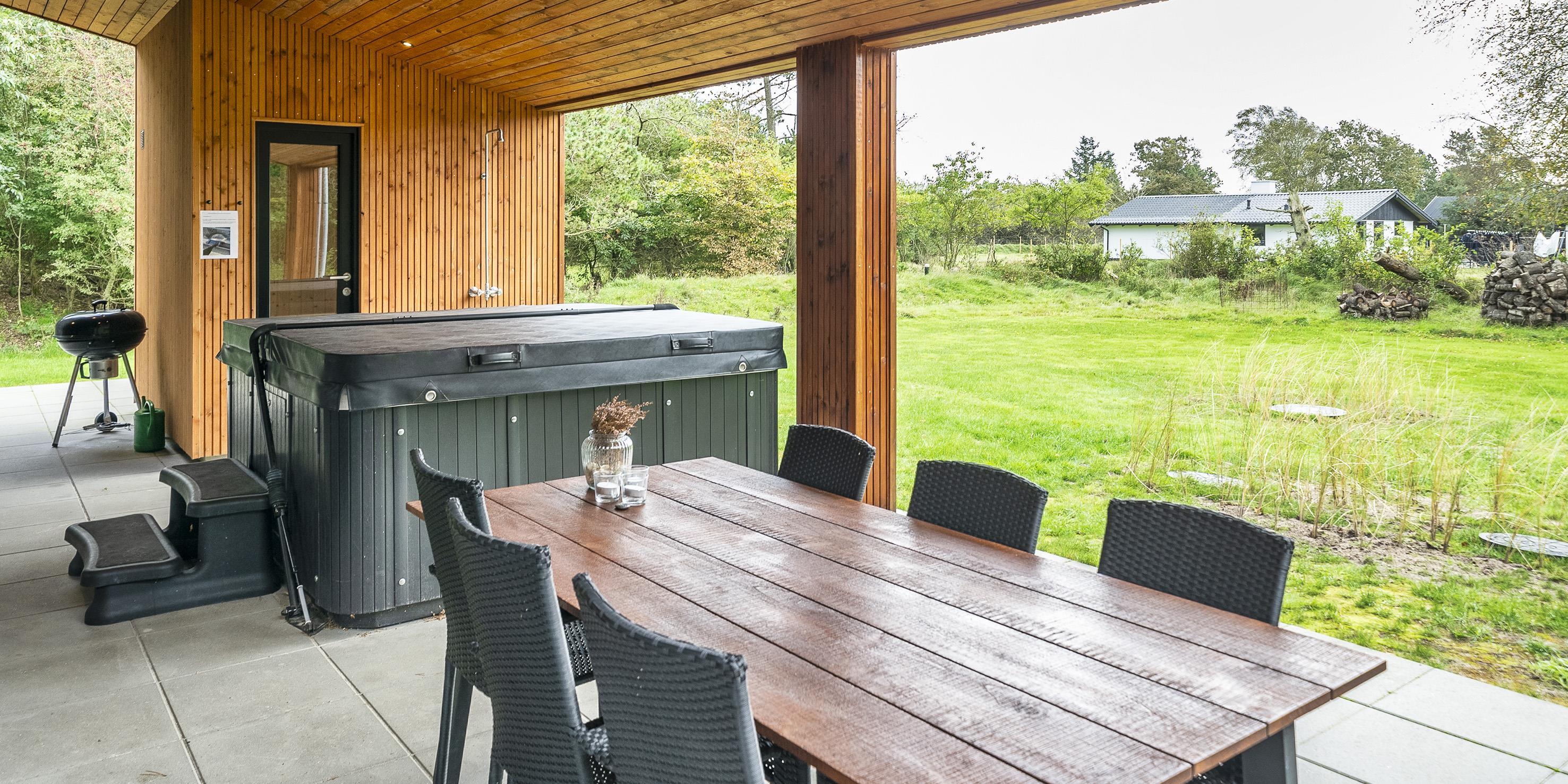 The summer house: Entrance hall with plenty of space for the wardrobe and extra storage. From the entrance area you continue to the hallway, which leads to both of the house's bathrooms, the house's first bedroom and activity room. From the activity room there is an entrance to another bedroom. One bathroom has a washing machine and dryer. From the hallway you enter a large kitchen-dining room and living room in one. The room is bright and nice with good windows and access to the terrace. The kitchen is equipped with all comforts such as a dishwasher, microwave, hob, hood and fridge/freezer with 8 drawers. Large dining table with room for 8 guests. Nice living room with television with Google Chromecast and wireless Internet access. The Danish TV programs are streamed via Google Chromecast. From here there is access to a lovely terrace environment. Under the covered terrace, there is an outside jacuzzi and sauna. The day can be enjoyed from morning to evening on the large partially covered terrace. From the living room there is access to the remaining 2 other bedrooms. All 4 bedrooms: DB + DB + DB + DB.
